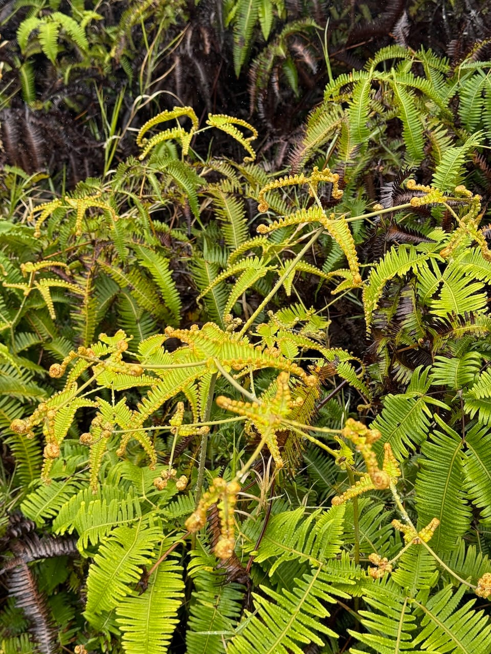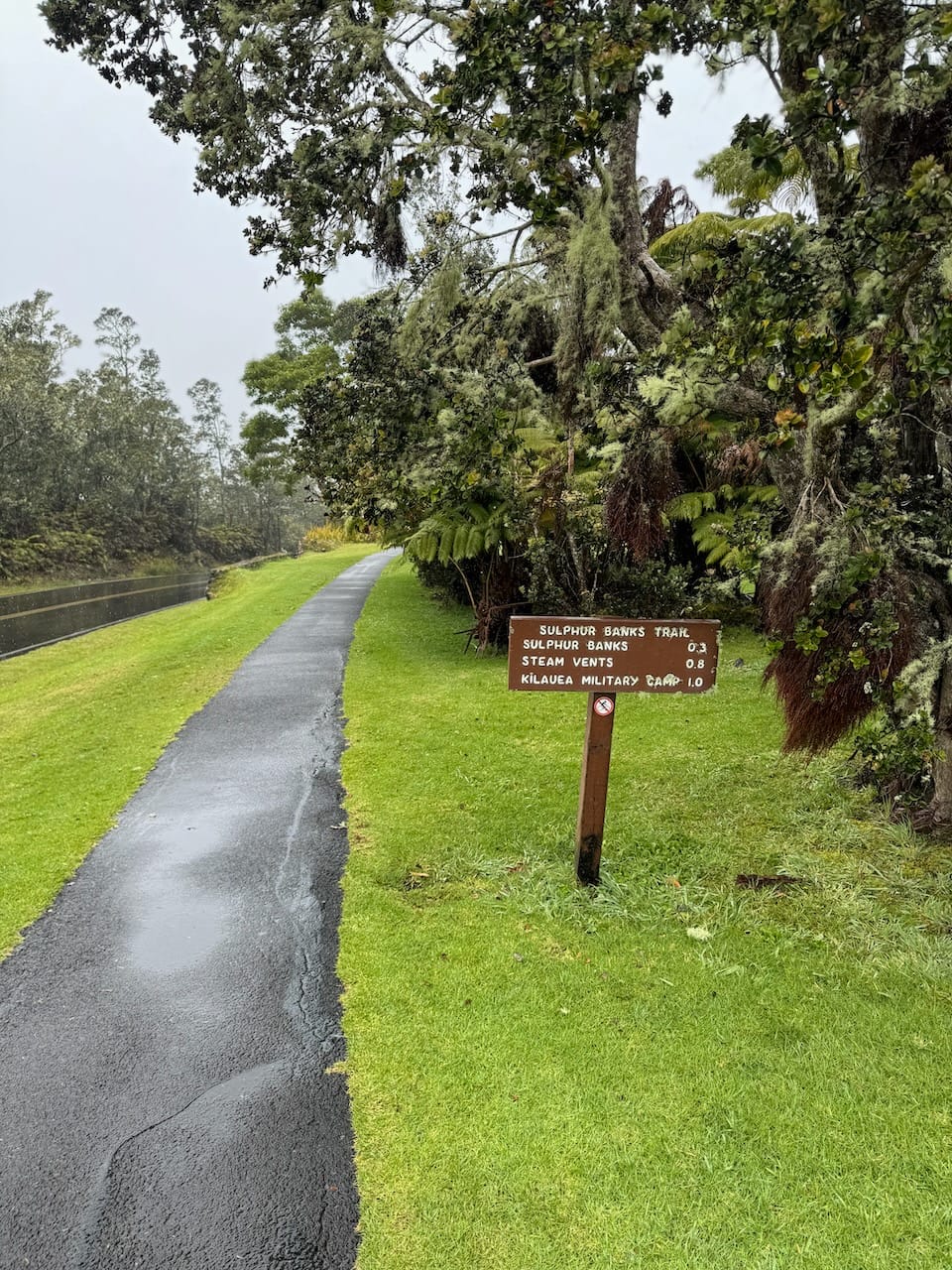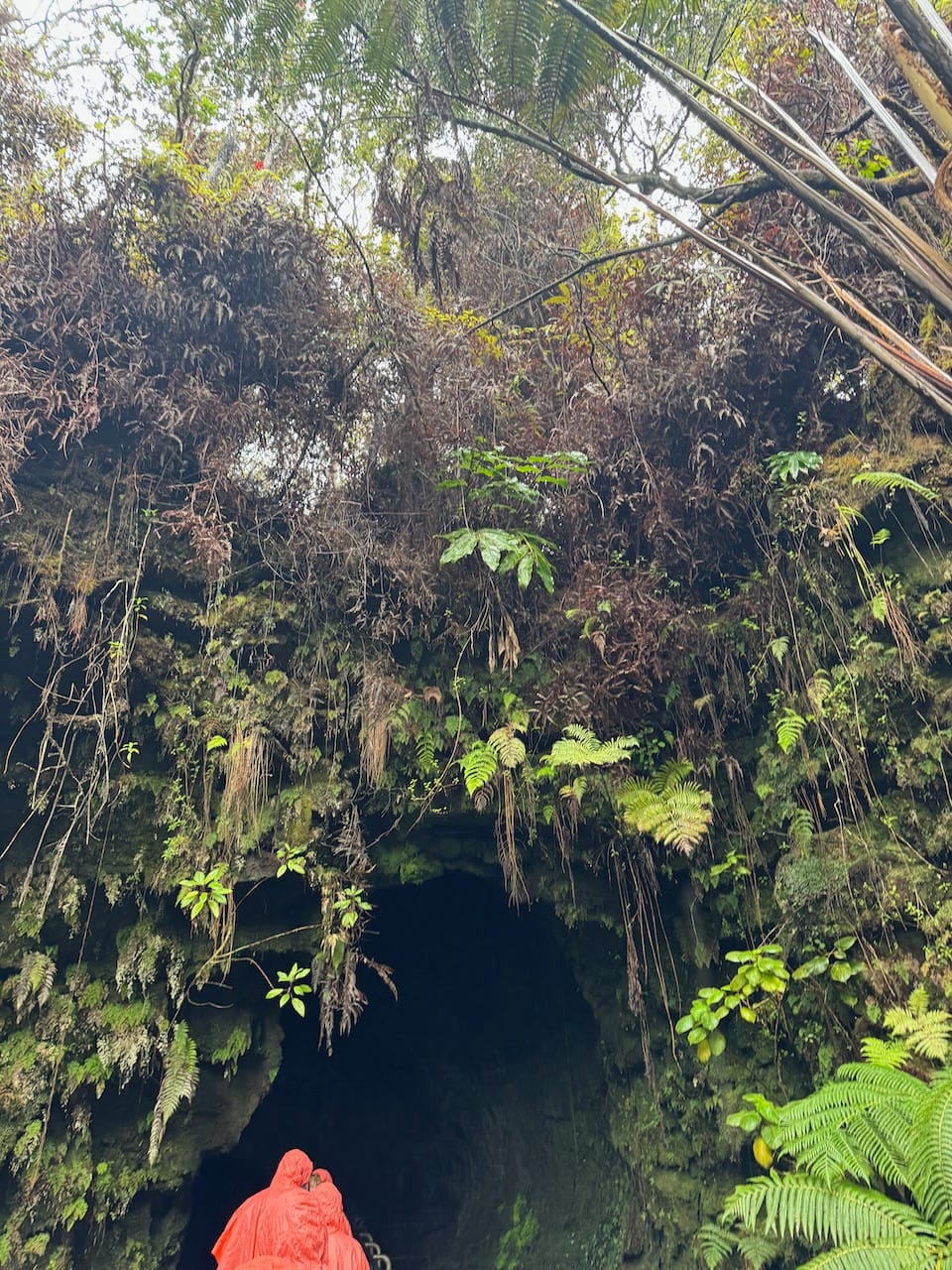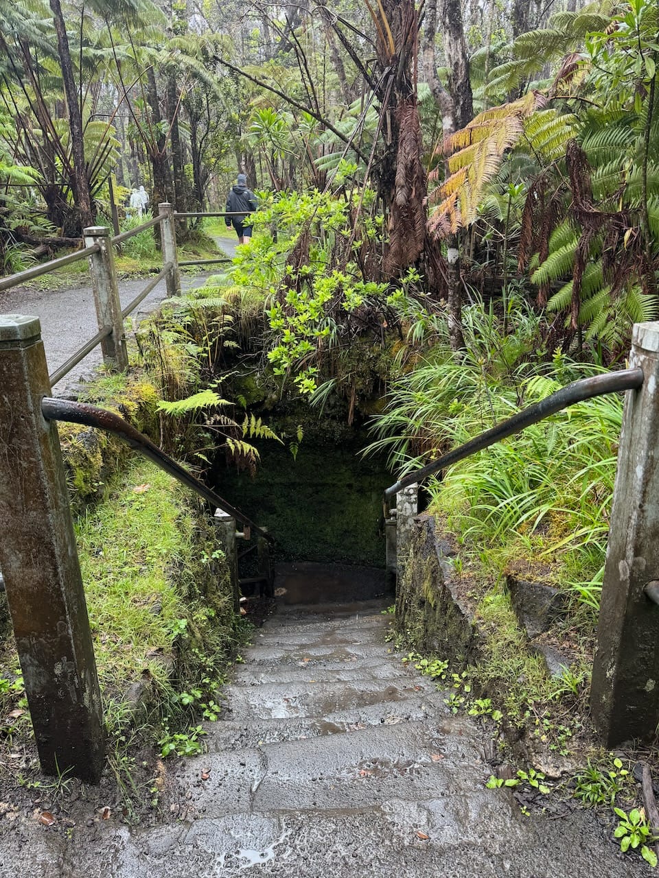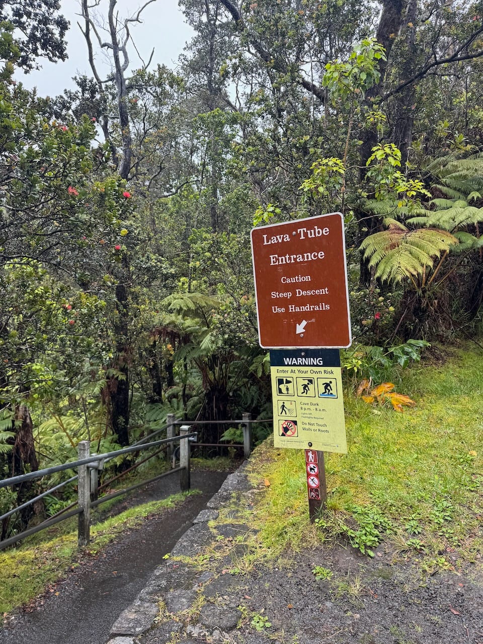 The Lava Tube is a popular attraction in the park, but parking was quite challenging. We eventually found a spot along the roadside, though it wasn’t an official parking area, and walked down to the tube. It was more of a short detour than a hike. While we’ve seen more impressive caves before, the rain and humidity created a slightly exotic atmosphere that enhanced our experience.