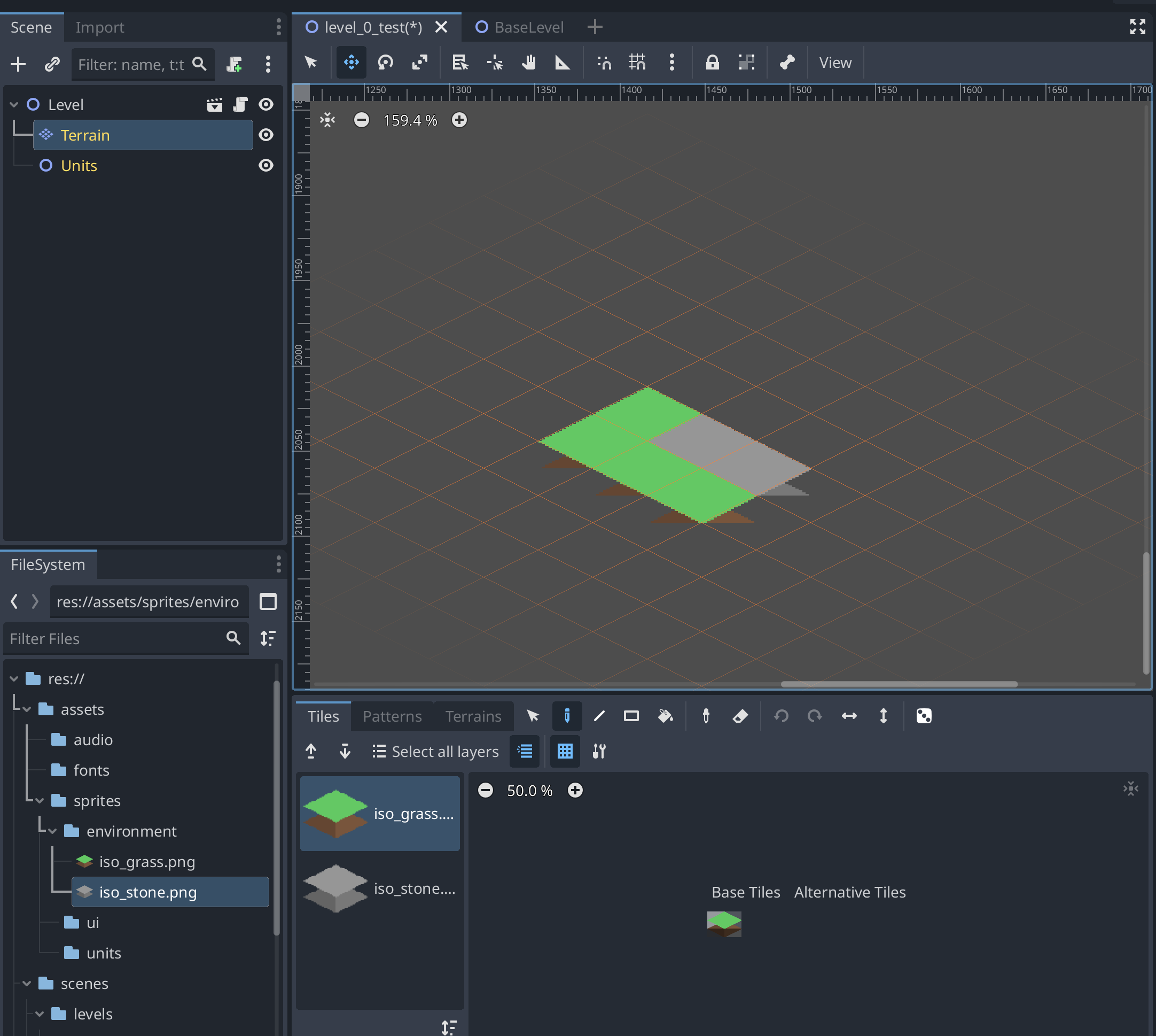 3. Assets: Generated placeholder iso_grass and iso_stone tiles (64x32).