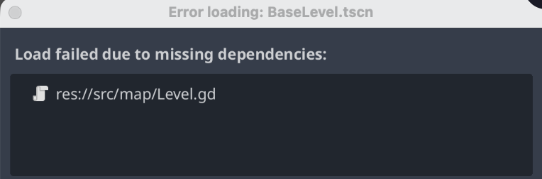 I got an error when I tried to create a new inherited scene from the BaseLevel. The error message was at the following message box (image attached).