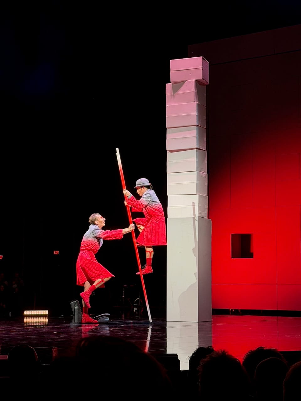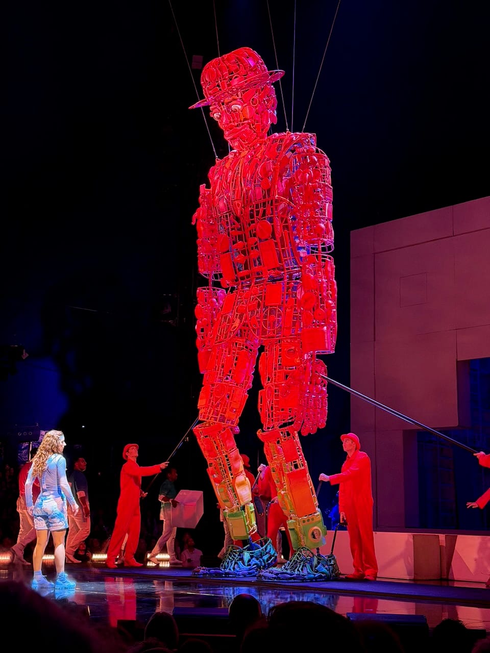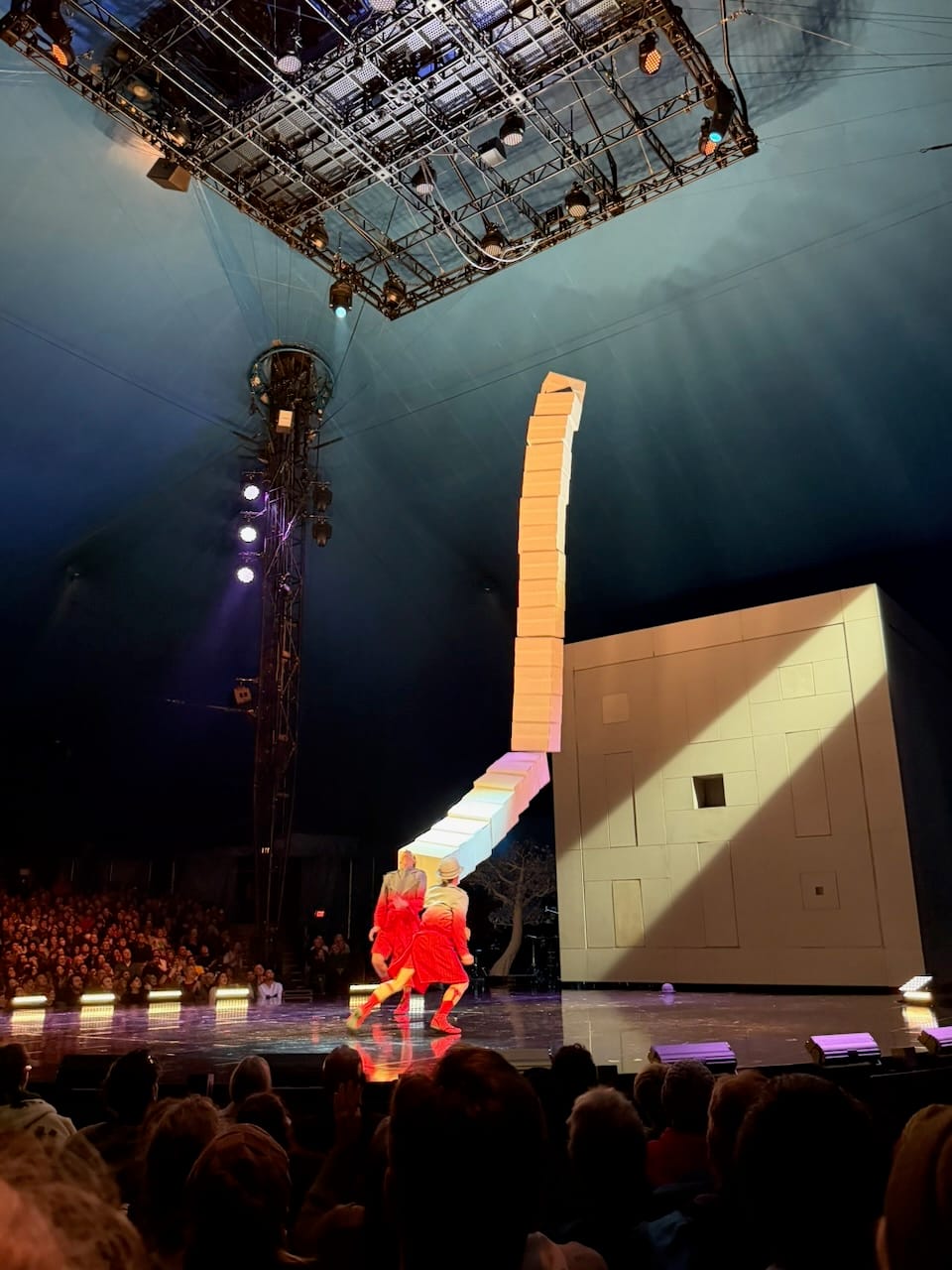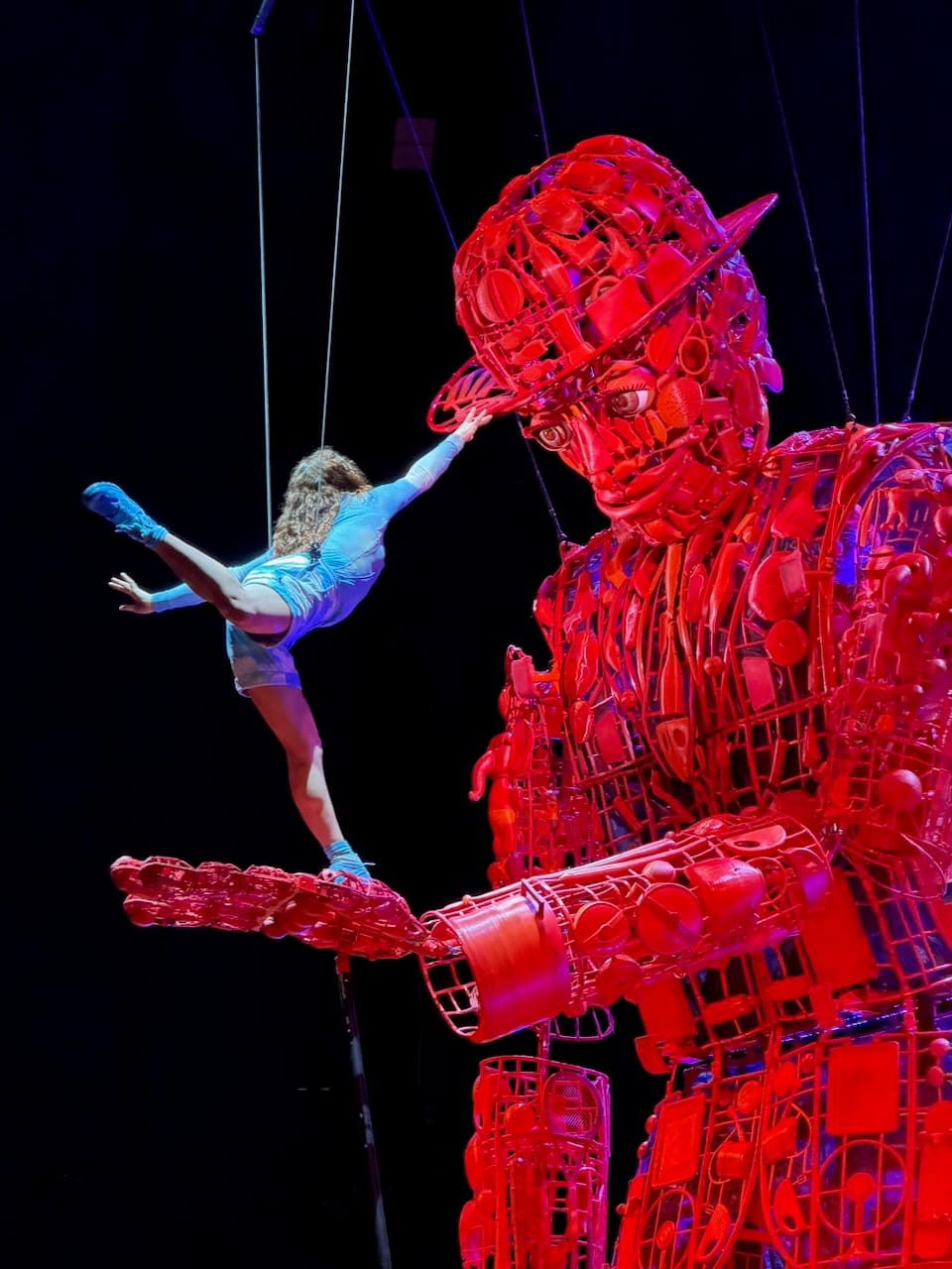 The show itself was excellent, as expected from Cirque du Soleil, but what stood out to me was how physical it was. Many Cirque shows lean heavily on elaborate stage mechanics and moving sets (though definitely it is human skills that make it great). ECHO felt more like a traditional circus in the best way. The focus was almost entirely on human bodies: hanging, swinging, balancing, climbing ladders, jumping, flying. There was a massive red marionette that served as the visual symbol of the show, but most of the real magic came from raw human movement and control.