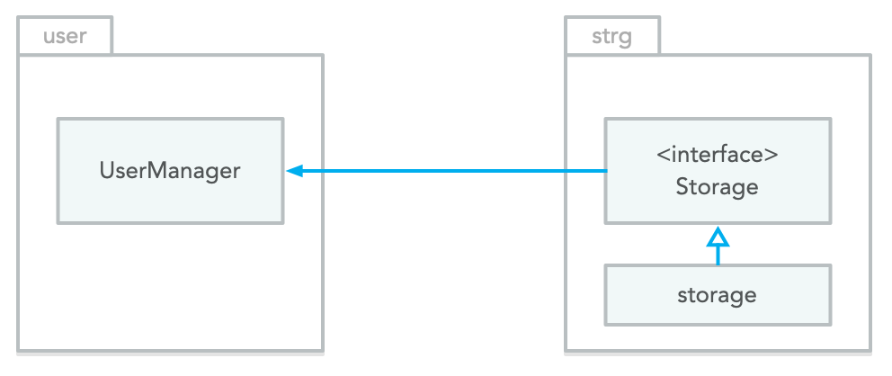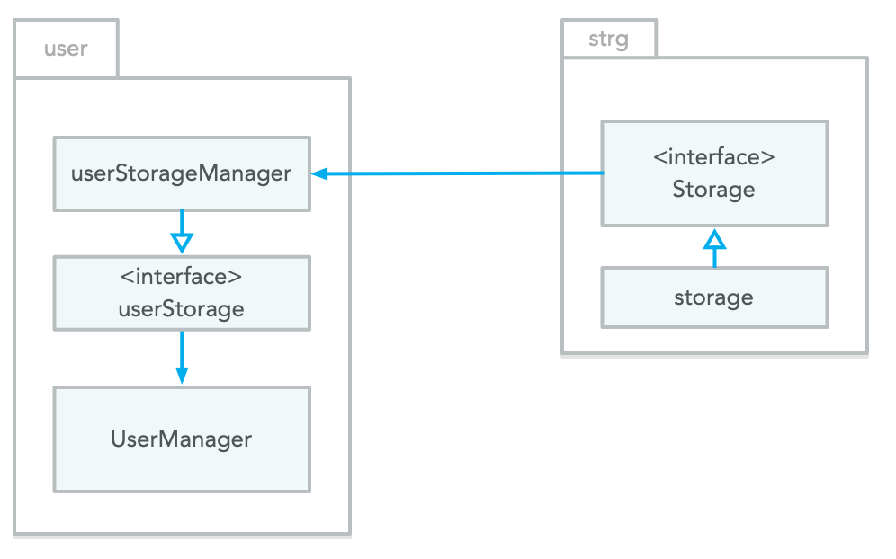 And here comes the dependency inversion. According to the definition, we have to define the storage interface ( userStorage ) in user package. The userStorage is a private interface as it is only used in the package. So, the implementation will be as follow: