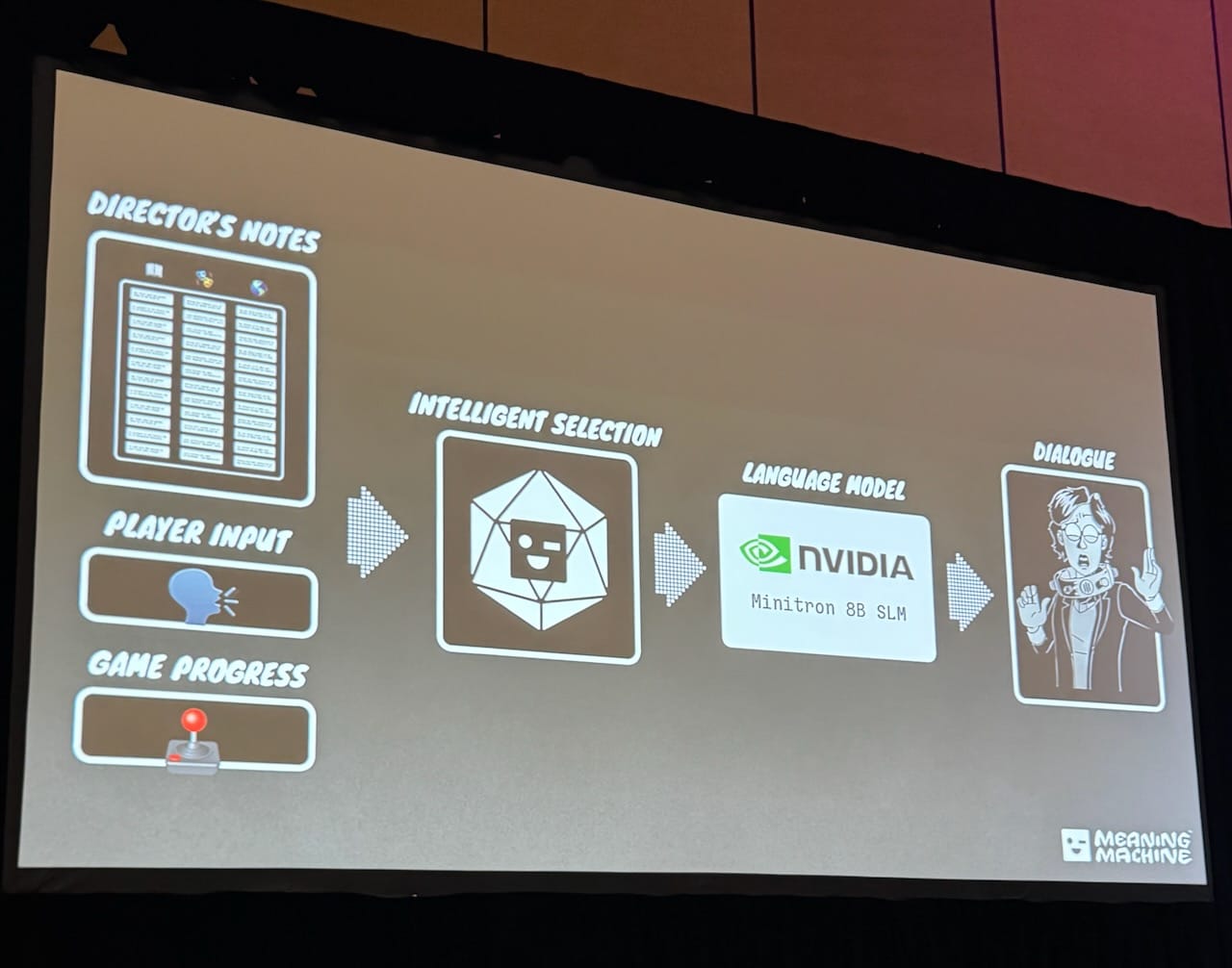 My personal favorite session of this year’s GDC was “Bringing AI NPCs to Life with NVIDIA ACE: On-Device Small Language Models in Meaning Machine’s Dead Meat.” The studio, Meaning Machine, showcased how they built a generative AI-powered narrative mystery thriller. What stood out was their transition from a fully cloud-based LLM solution to an on-device LLM.