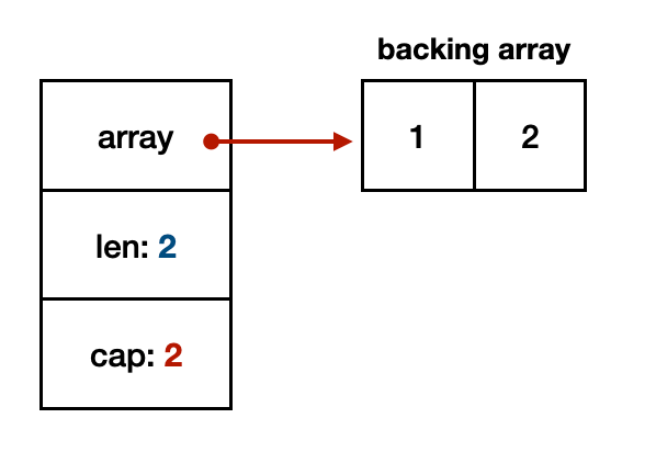 slicestruct instance. - Go slice uses a reference to its "backing array."