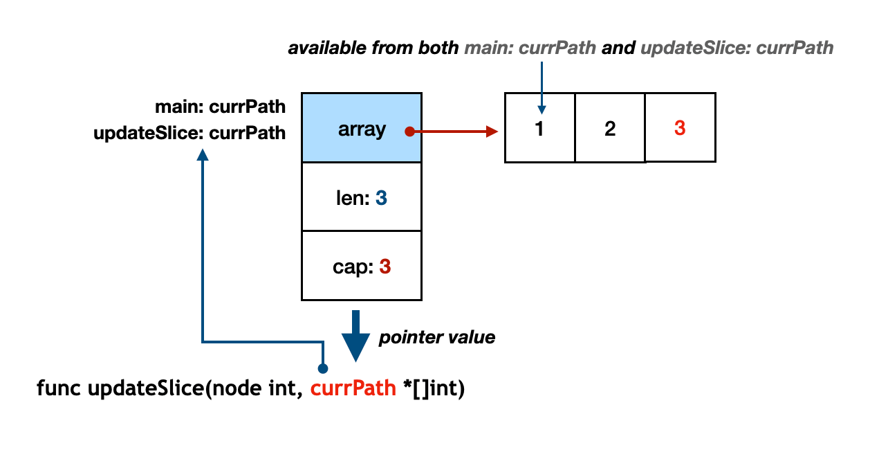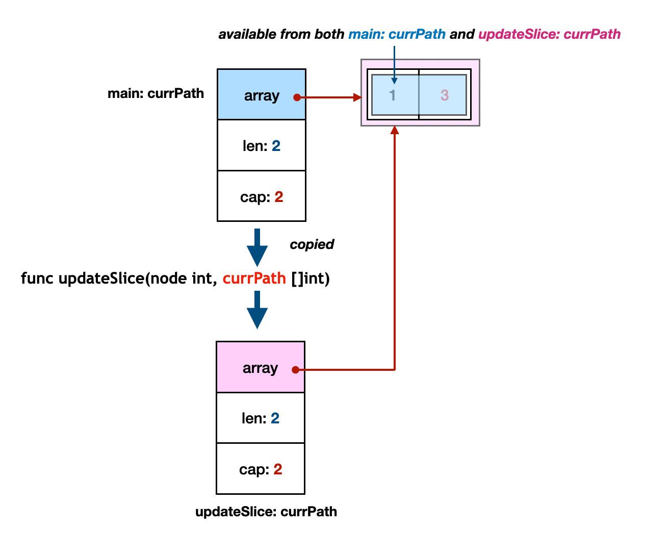 When we create the currPath slice instance with []int{1, 2}, it creates a length-2 and capacity-2 slice instance with the initial values of 1 and 2.