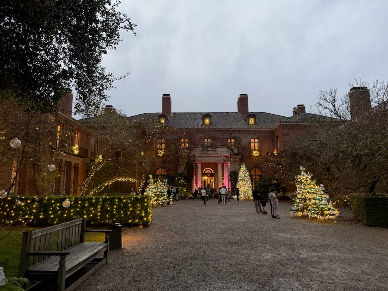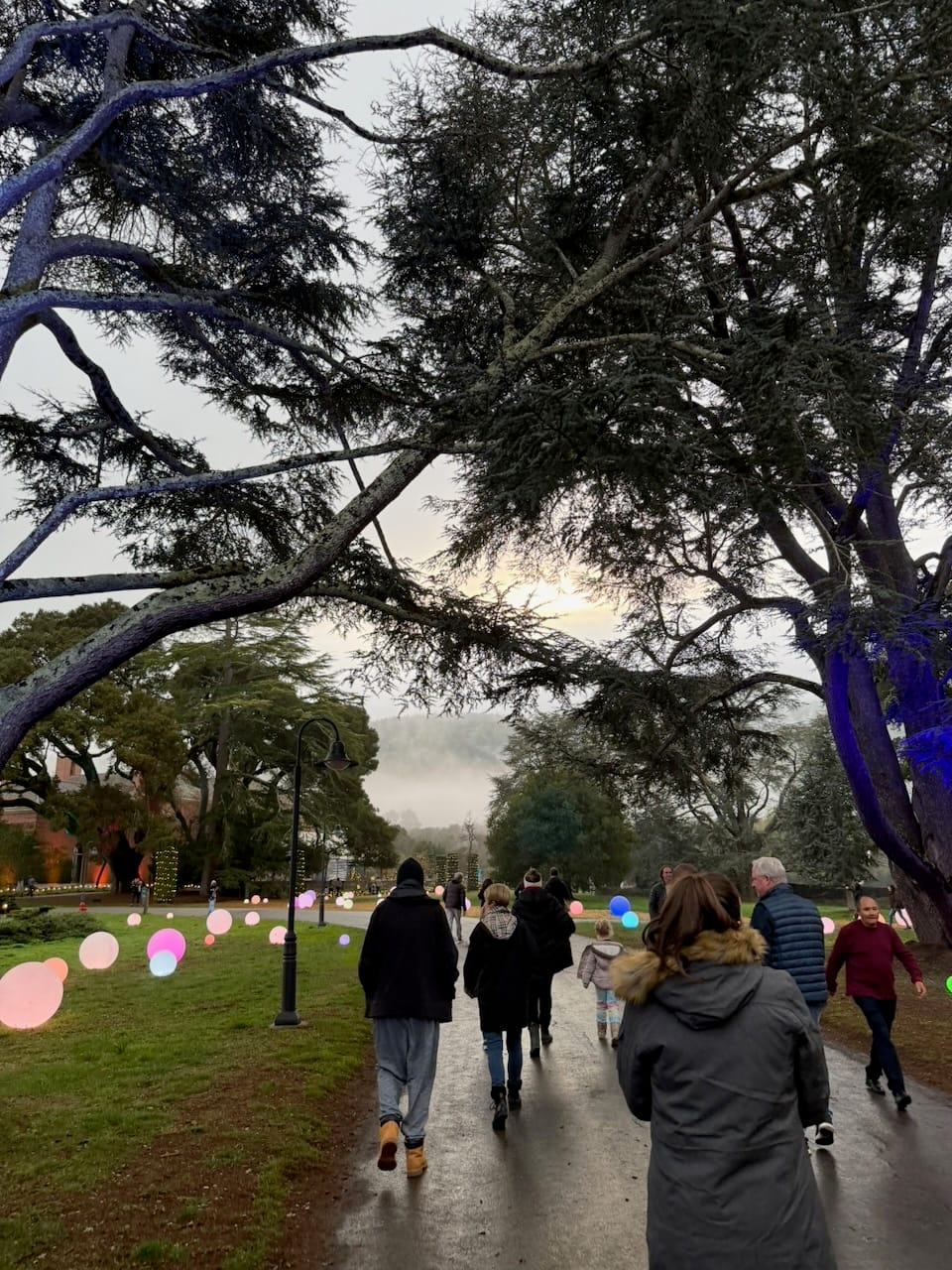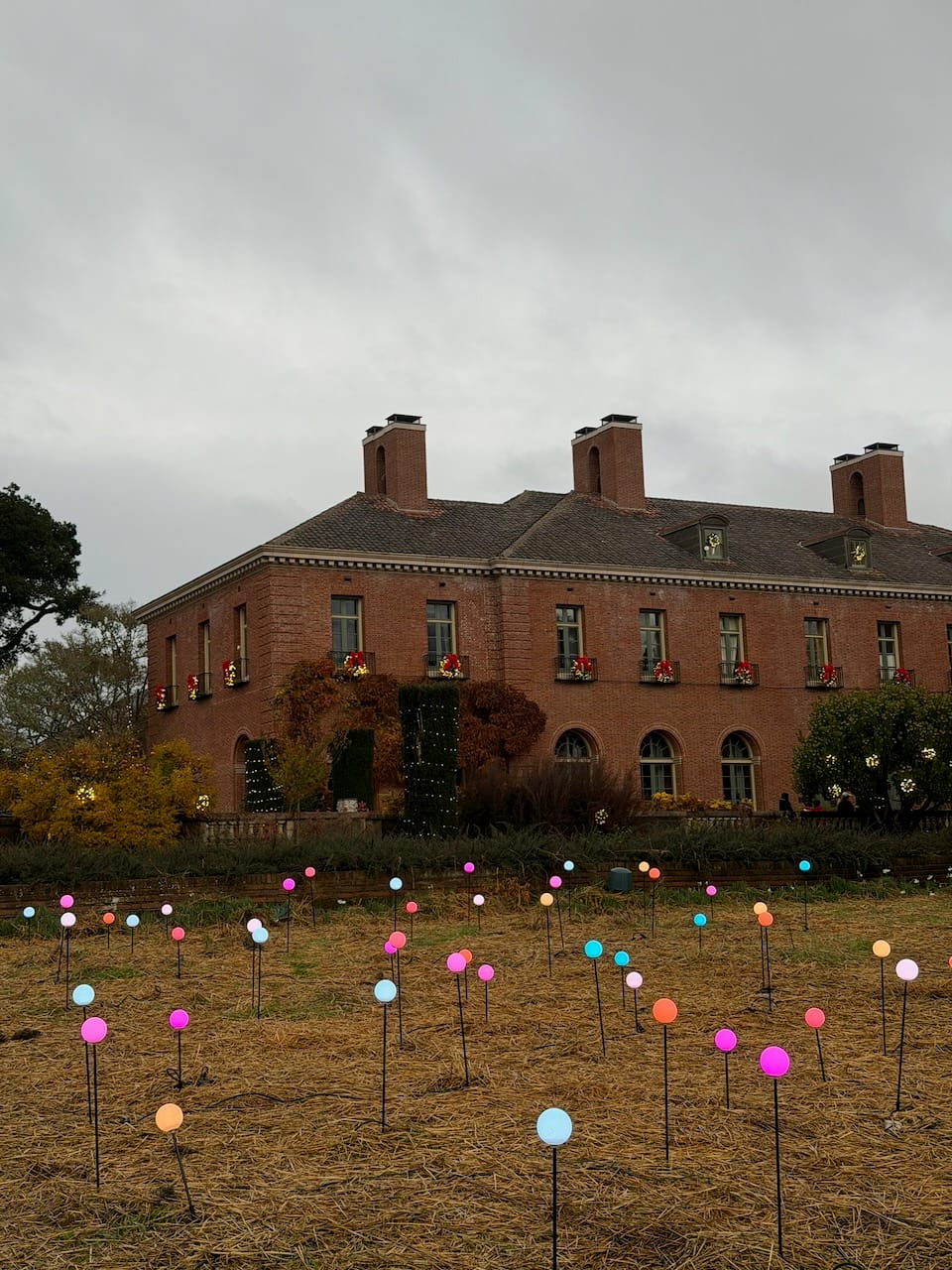 The evening we went was rainy, like much of this winter, but luckily the rain was light when we arrived. One thing surprised me: the trolls were gone. They must have been a seasonal installation. I was a little sad to see them disappear, but I also liked the idea. It means Filoli is not trying to freeze itself into one experience—they let the place stay alive, change, and give visitors a reason to return.