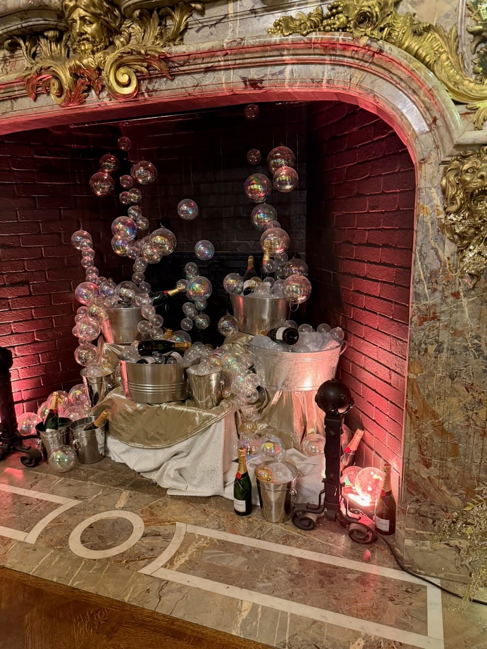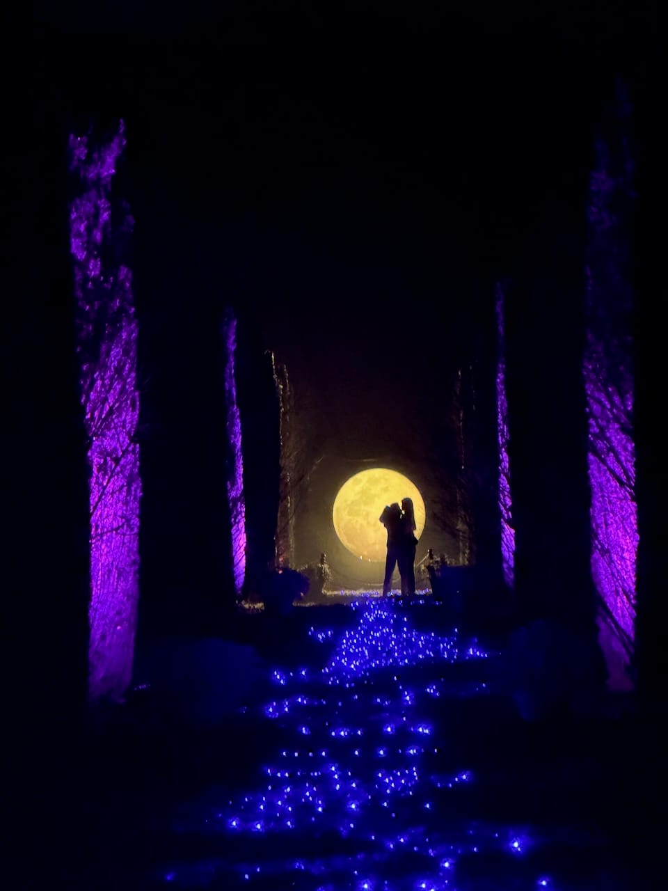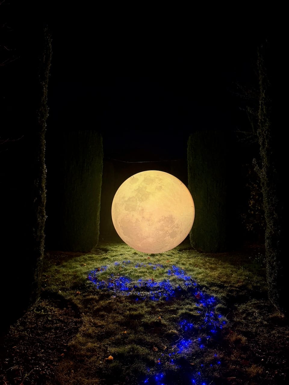 As the sky darkened, the lights became richer and deeper. Trees glowed from inside. The mansion slowly transformed into something theatrical and dreamlike. The highlight this year was the moon installation in the garden. A large glowing disc, light shining softly through fabric, suspended just above the landscape. It looked uncannily real. It also became the unofficial photo center of the night.