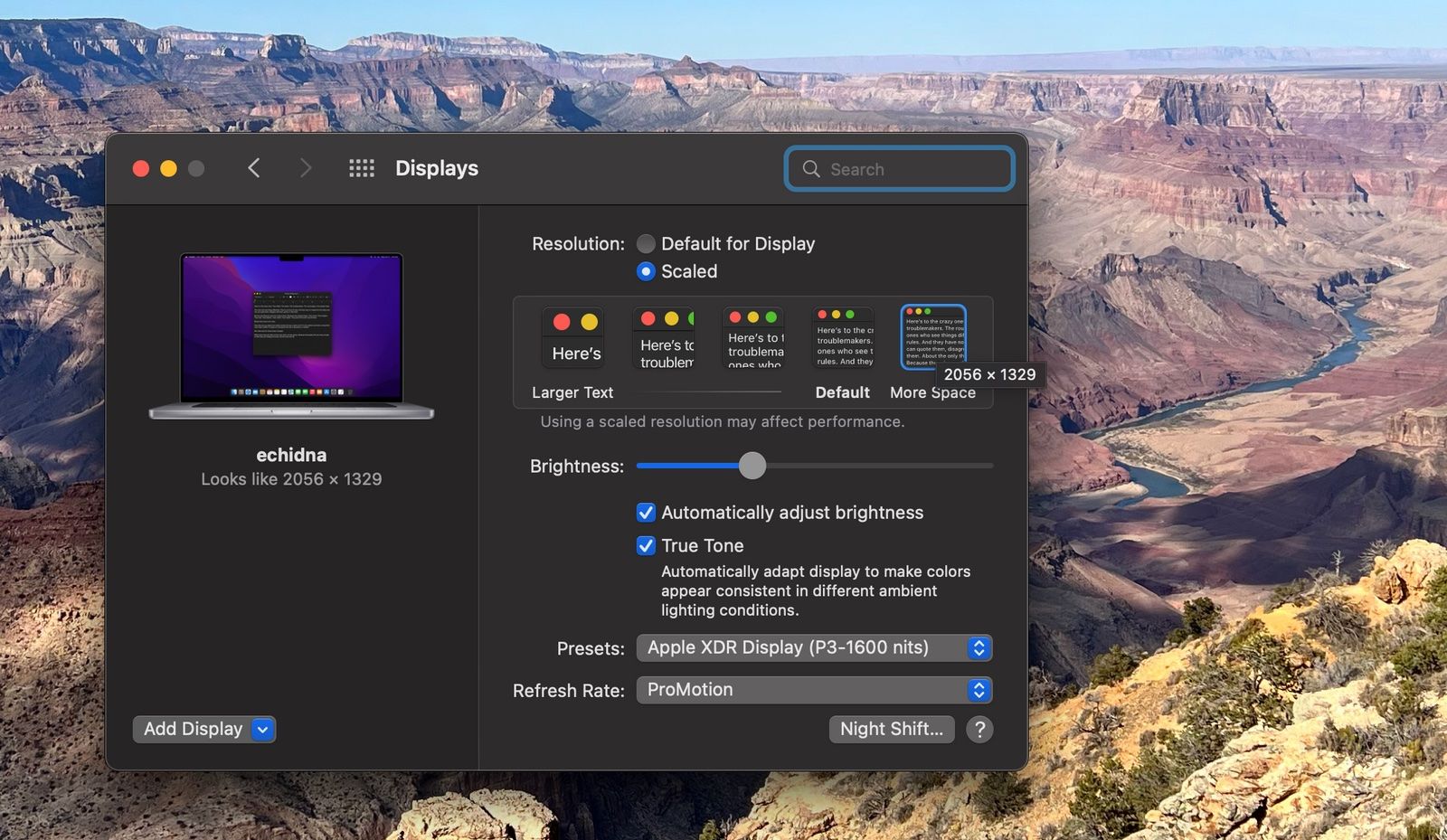 The screen is awesome. The Liquid Retina XDR display (what a marketing phrase) is stunning. It is not a true micro-LED screen but an LCD screen with micro-LED backlights. But the color is vivid and black is black, at least much better than the previous one. But the best thing came with its screen asset. Now, we have a true-big-screen for programmers. My previous laptop's 16" screen has 3072x1920 resolution. Not bad, but it couldn't give the retina feeling in the 2048x1280 scaled mode. So, I had no choice but to stick to the 1792x1120 scaled mode. But the new 16" has 3456x2234 resolution, which makes me (a 47-year-old programmer) comfortable in the 2056x1329 scaled mode.