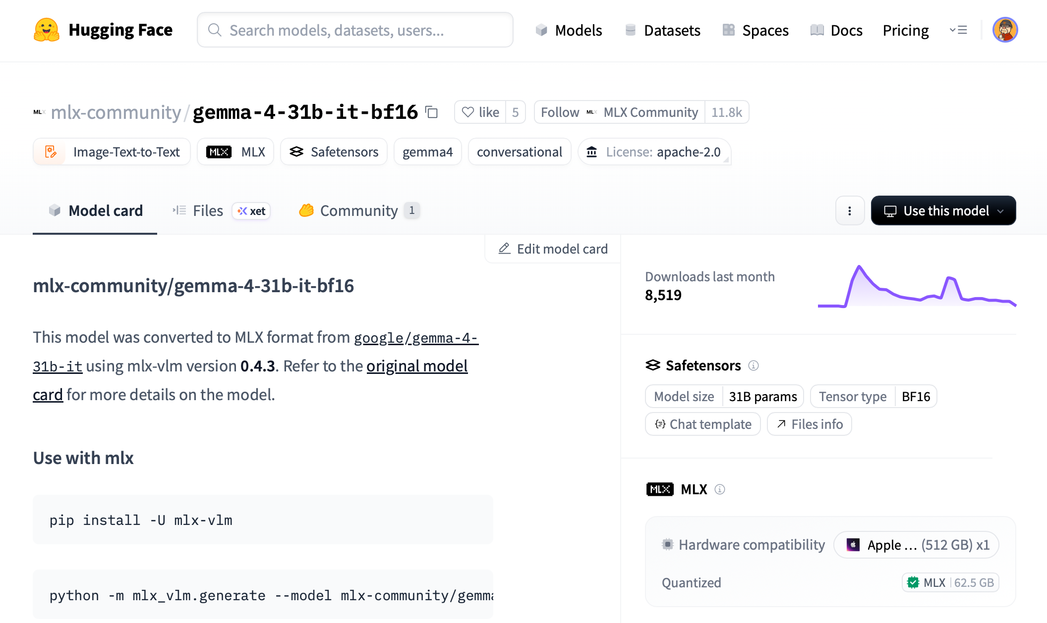 For this post, I chose mlx-community/gemma-4-31b-it-bf16. This is the MLX-converted version of Google’s Gemma 4 31B instruction-tuned model. The -it suffix matters because I am not trying to do raw text completion or continue pretraining. I want a model that behaves like an assistant when called from OpenCode, Open WebUI, or another OpenAI-compatible client.