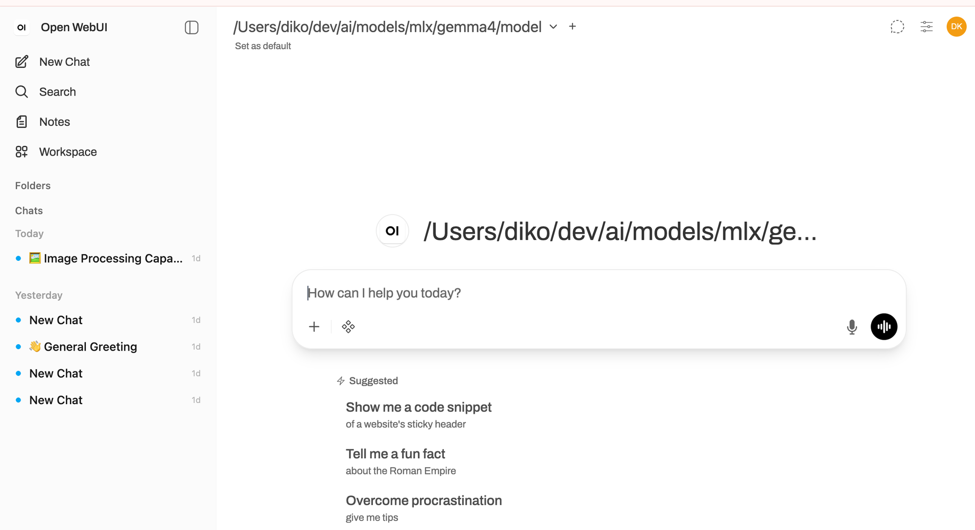 For now, I am treating Open WebUI as the first integration point. It gives me a simple way to interact with the model, check behavior manually, and make sure the OpenAI-compatible API path is working. I have not connected this MLX/Gemma setup to OpenCode yet.