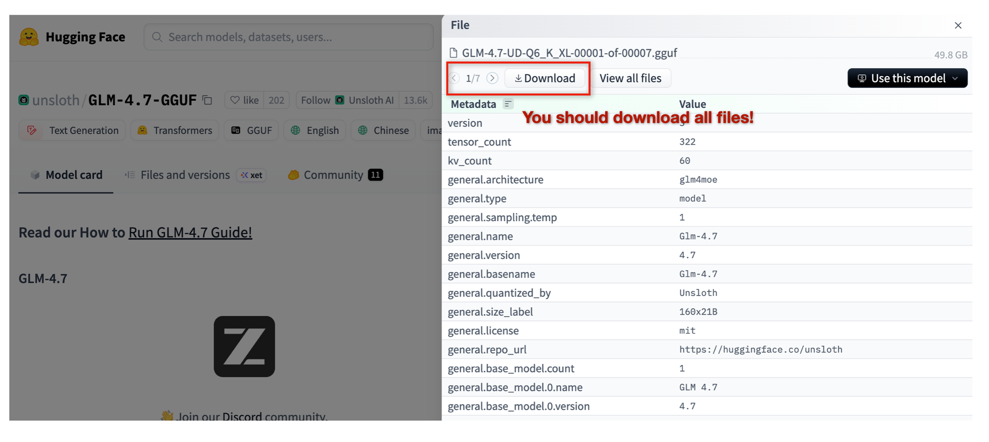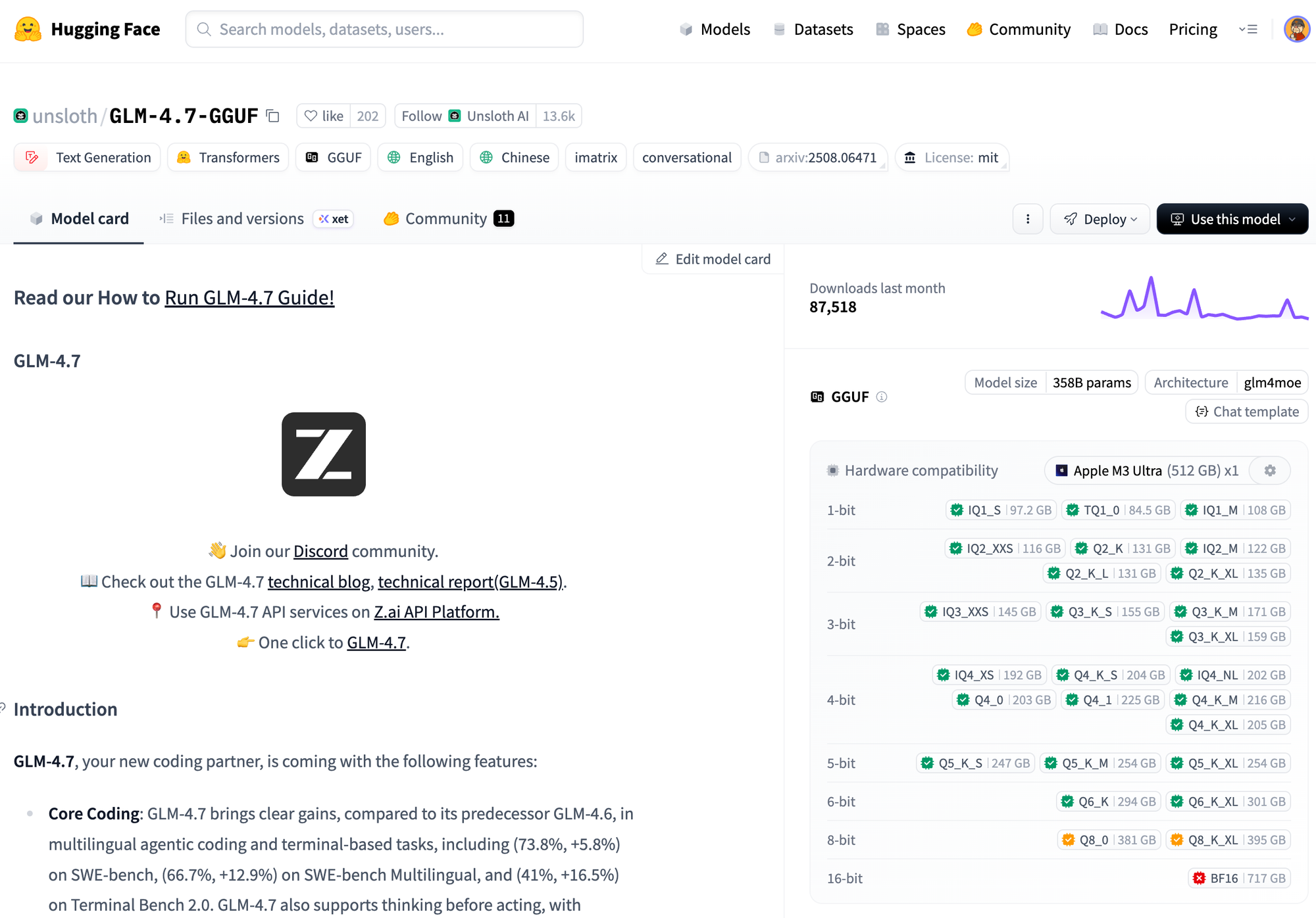 A concrete example makes this much easier to explain. If you look up GLM-4.7 on Hugging Face, you’ll find GGUF builds published by Unsloth. These are the same models released by Zhipu, but converted and quantized into formats that are actually usable for local inference.