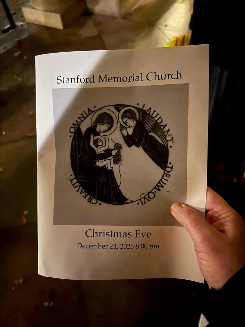 This year, something similar pulled me back. Last summer, we stepped inside Stanford Memorial Church and were stunned by its scale and beauty: the size, the beautiful facade, the luxurious interior, and most of all, the real mosaic ceiling. So when we learned there would be a Christmas Eve Candlelight Service there, it felt like the right moment to return.