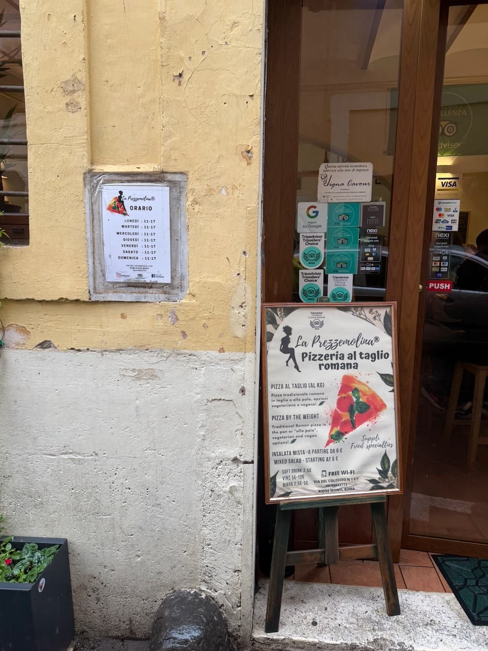 After more than two and a half hours on the Segway, we had only about one hour before our next tour at the Colosseum. So lunch had to be fast. We ducked into La Prezzemolina, which turned out to be exactly what we needed. Finding it was slightly tricky in the heavy rain, partly because the place was much smaller than we had imagined. Inside, it was a compact, casual spot where you could quickly grab a few slices of pizza, stand, and eat (there were some tall stools, but the spirit of the place was clearly “in and out”). And it was — without exaggeration — the best pizza of my life. Once again, the same thought returned: what we’ve been eating in the Bay Area… We were so impressed that we tried to come back another day — only to learn, disappointingly, that they close at 5 pm.