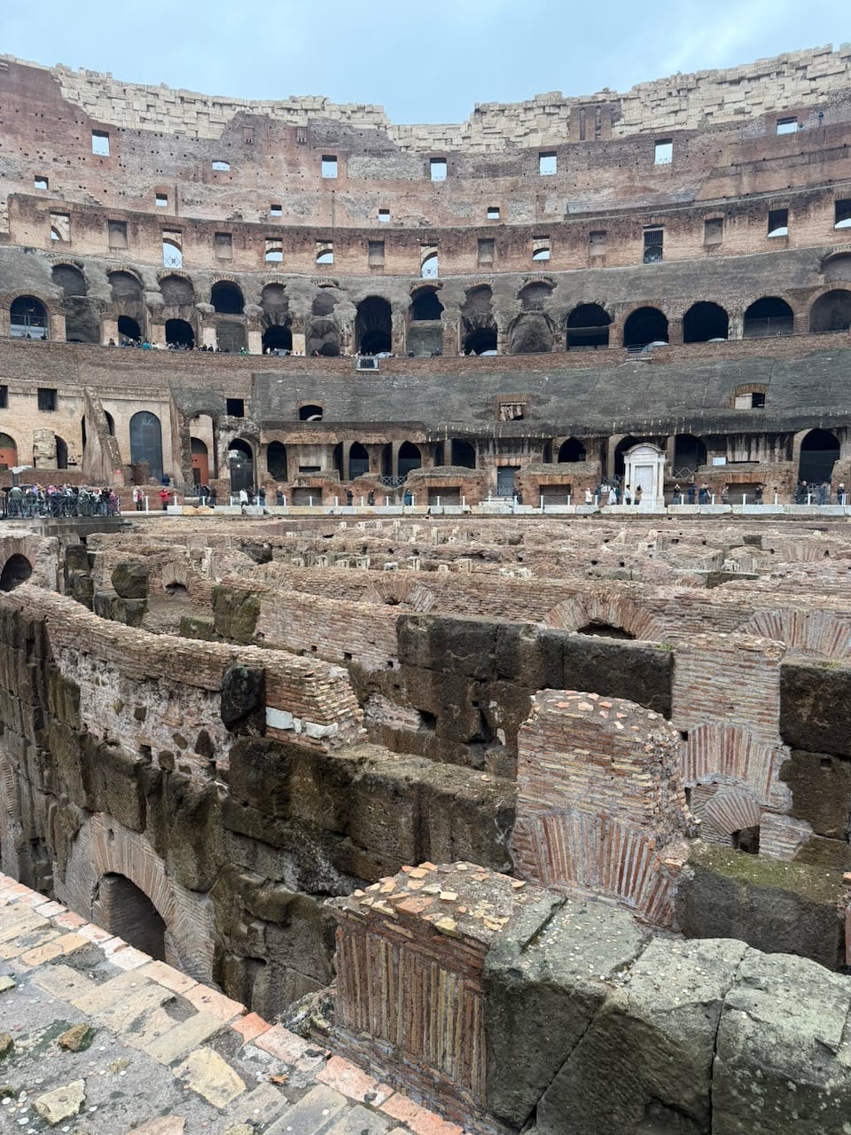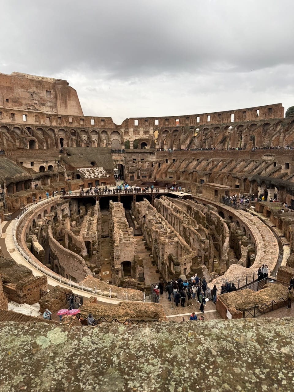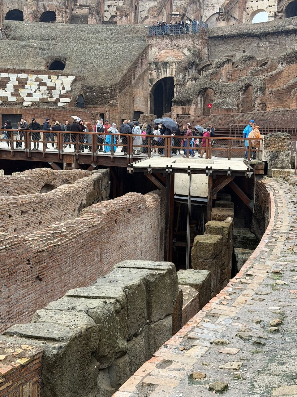 Then we hurried off toward the Colosseum. Our Colosseum tour started at 2 pm., and it was a Korean-guided tour. Getting inside the Colosseum with a guide is, without question, the best way to experience it. Security was noticeably strict. It was the tightest we encountered on this entire trip. We even had to bring our original passports so the staff could match our names with the tickets. Once inside, the scale and structure of the Colosseum were overwhelming. Standing where tens of thousands of spectators once sat, and looking down into the complex maze of corridors beneath the arena floor, made everything we’d seen in books and movies suddenly feel real. The place carried both grandeur and quiet weight. The only regret I had? I should have watched Gladiator II before coming here.