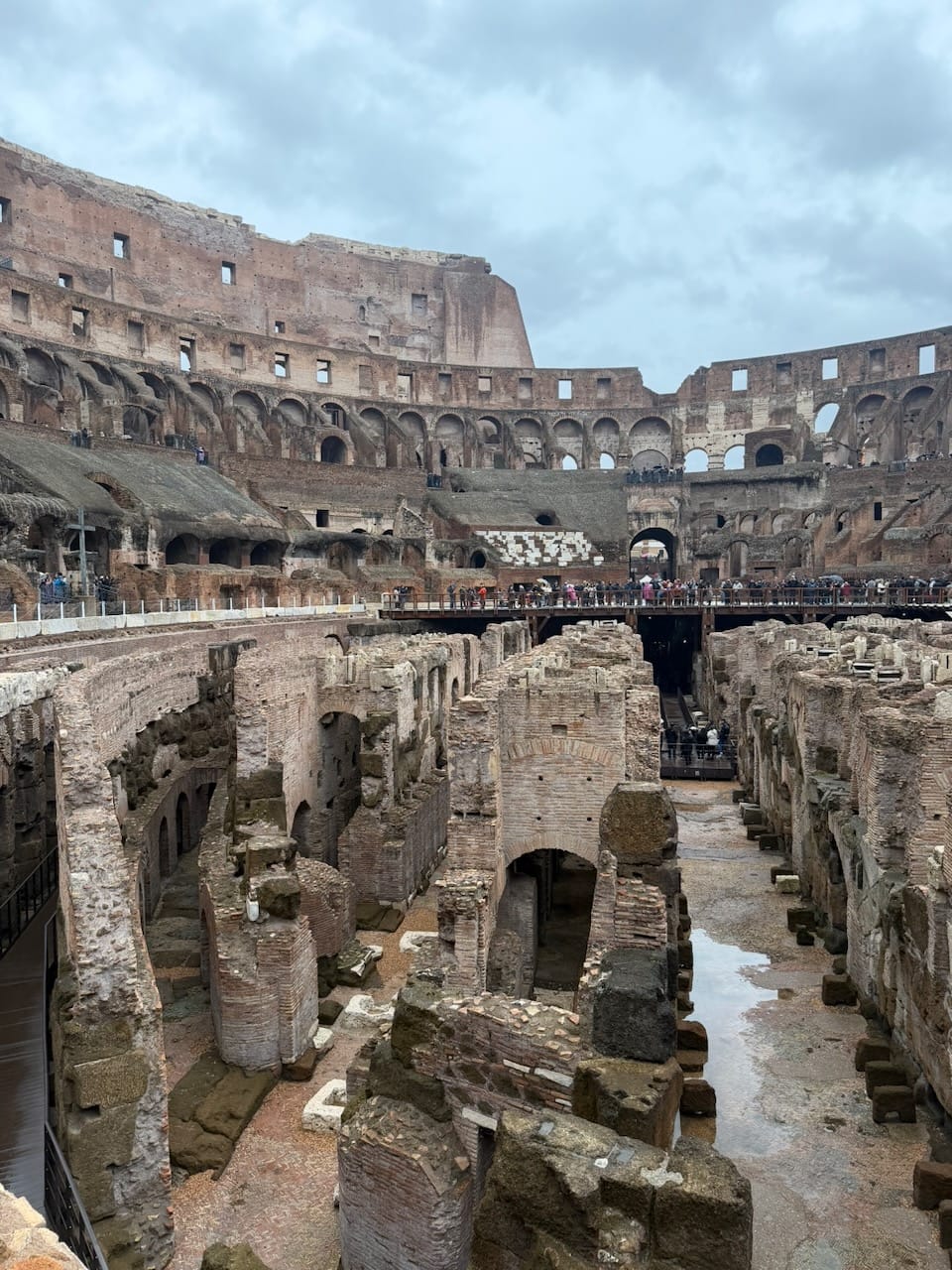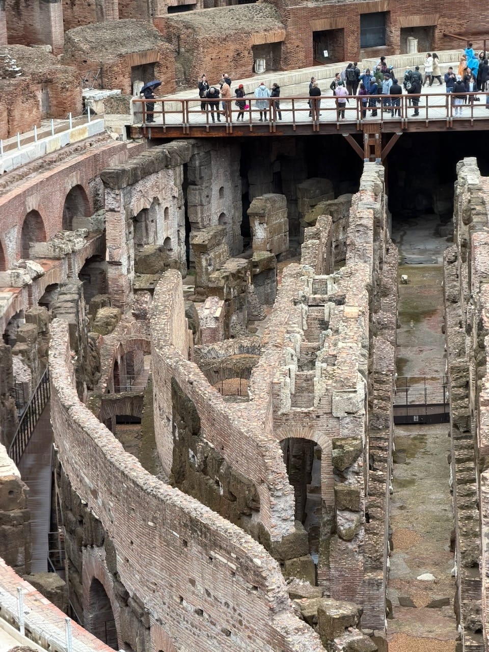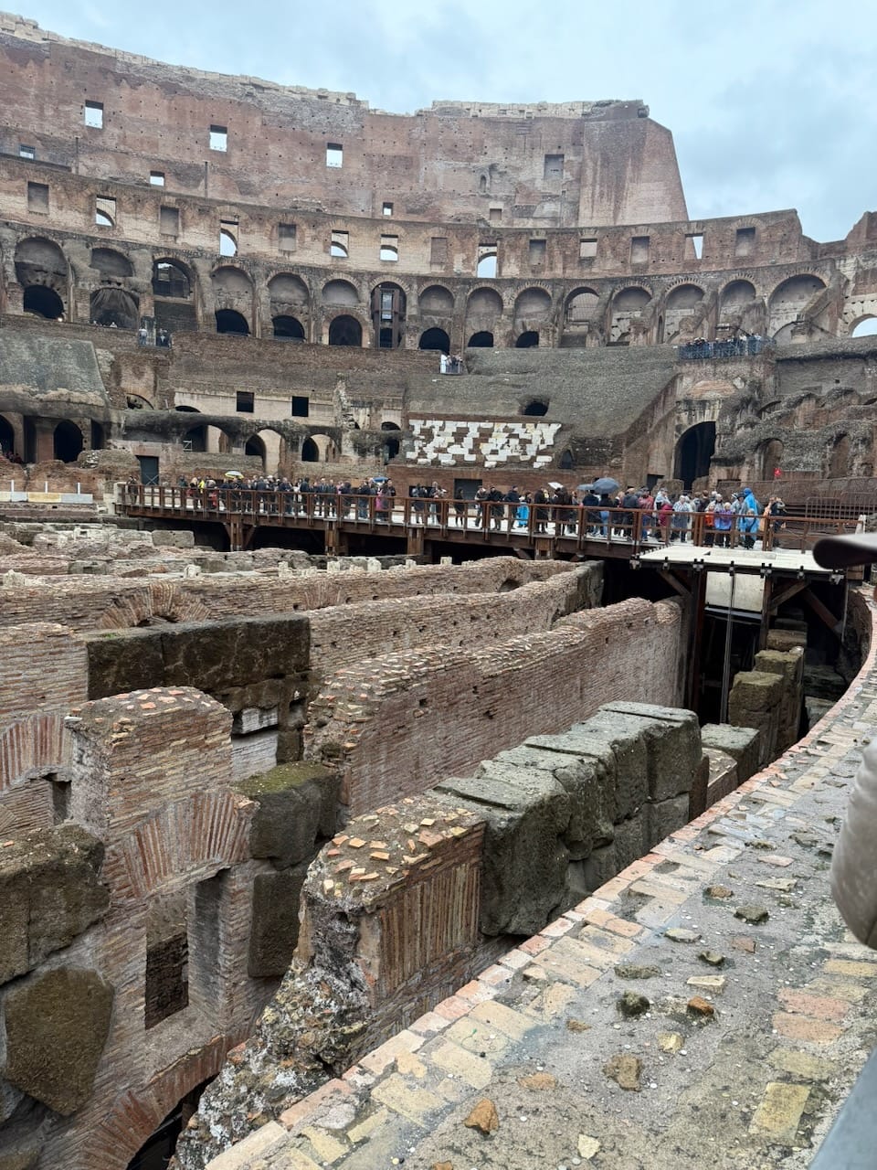 Then we hurried off toward the Colosseum. Our Colosseum tour started at 2 pm., and it was a Korean-guided tour. Getting inside the Colosseum with a guide is, without question, the best way to experience it. Security was noticeably strict. It was the tightest we encountered on this entire trip. We even had to bring our original passports so the staff could match our names with the tickets. Once inside, the scale and structure of the Colosseum were overwhelming. Standing where tens of thousands of spectators once sat, and looking down into the complex maze of corridors beneath the arena floor, made everything we’d seen in books and movies suddenly feel real. The place carried both grandeur and quiet weight. The only regret I had? I should have watched Gladiator II before coming here.