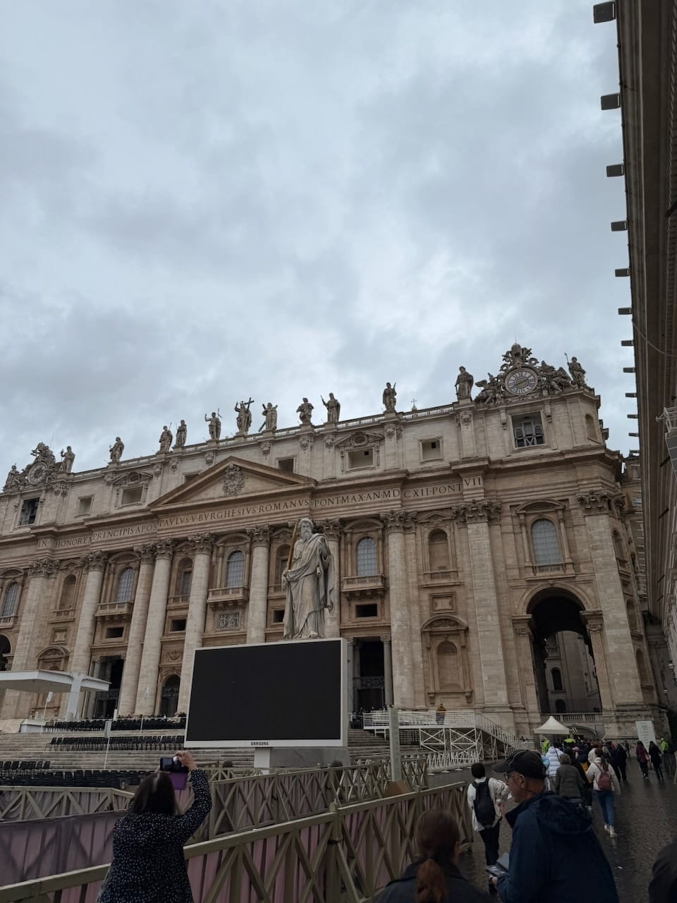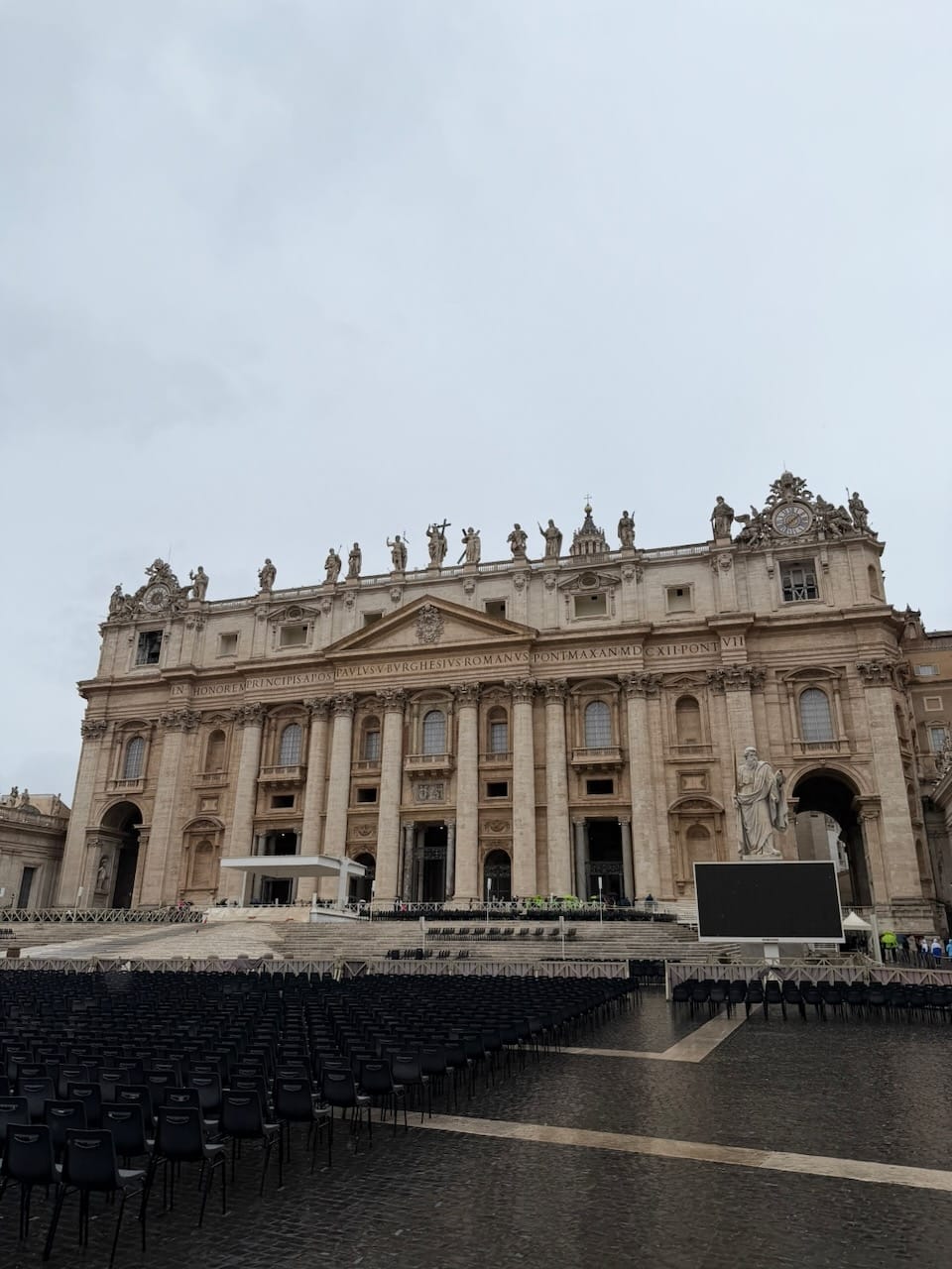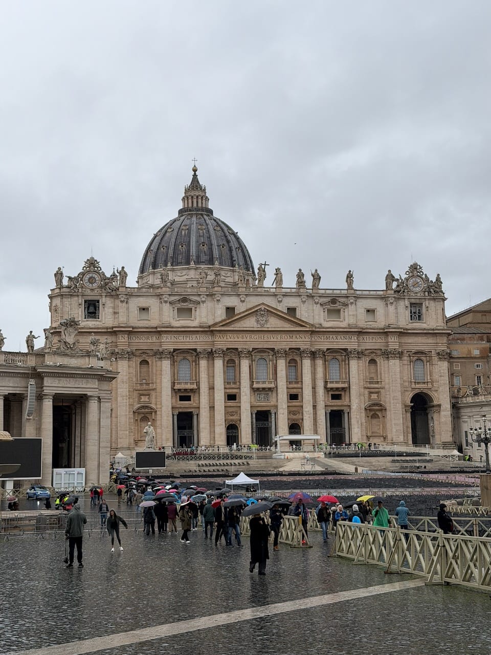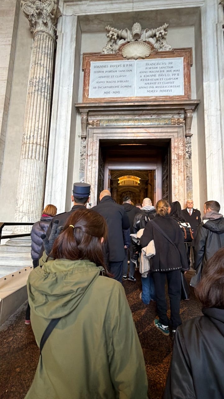 The exit led directly into St. Peter’s Square. We were a bit exhausted, but instead of resting, we decided to head straight into St. Peter’s Basilica to save the time of our last day in Rome. It was still raining, and perhaps because of that, the line for security (the entrance itself is free, but everyone must go through screening) was shorter than expected. We were inside within about 30 minutes, passing once again through a Holy Door.