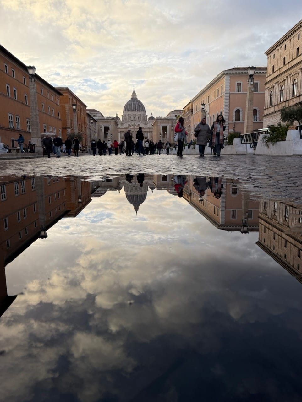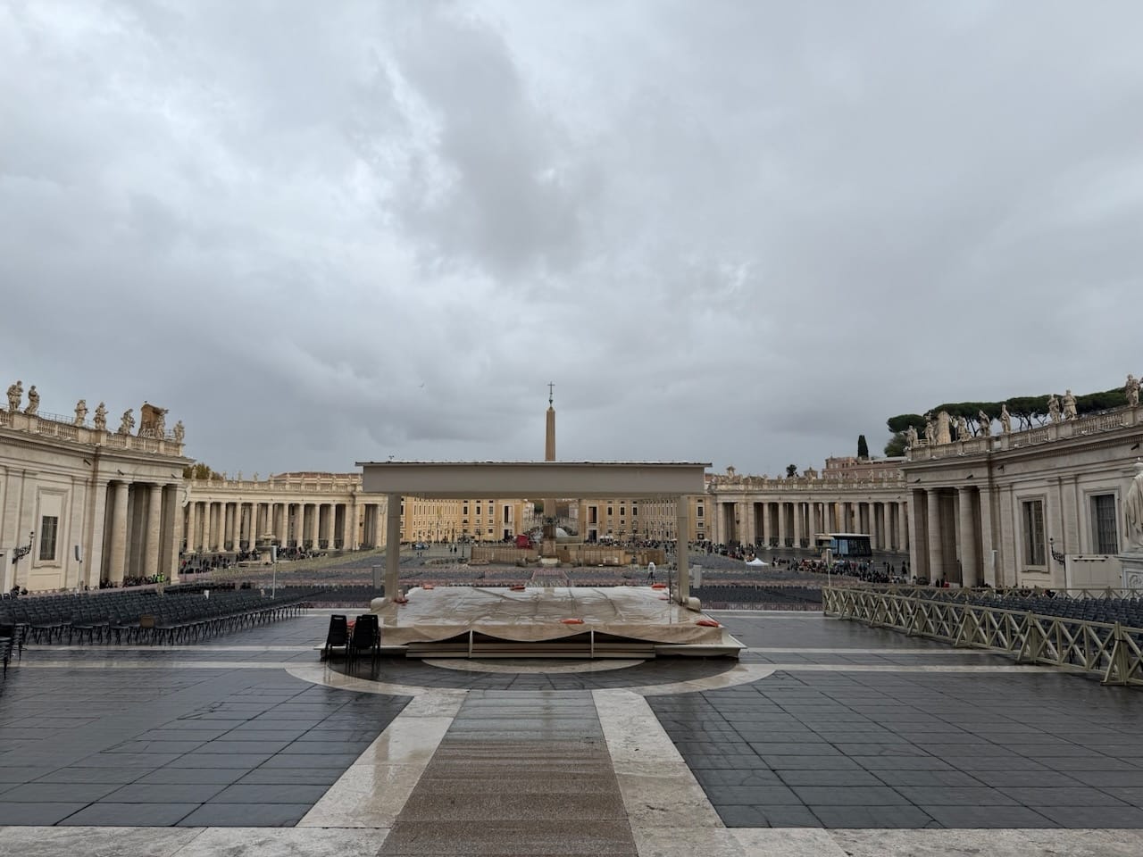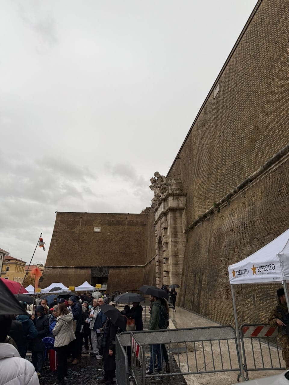 The exit led directly into St. Peter’s Square. We were a bit exhausted, but instead of resting, we decided to head straight into St. Peter’s Basilica to save the time of our last day in Rome. It was still raining, and perhaps because of that, the line for security (the entrance itself is free, but everyone must go through screening) was shorter than expected. We were inside within about 30 minutes, passing once again through a Holy Door.