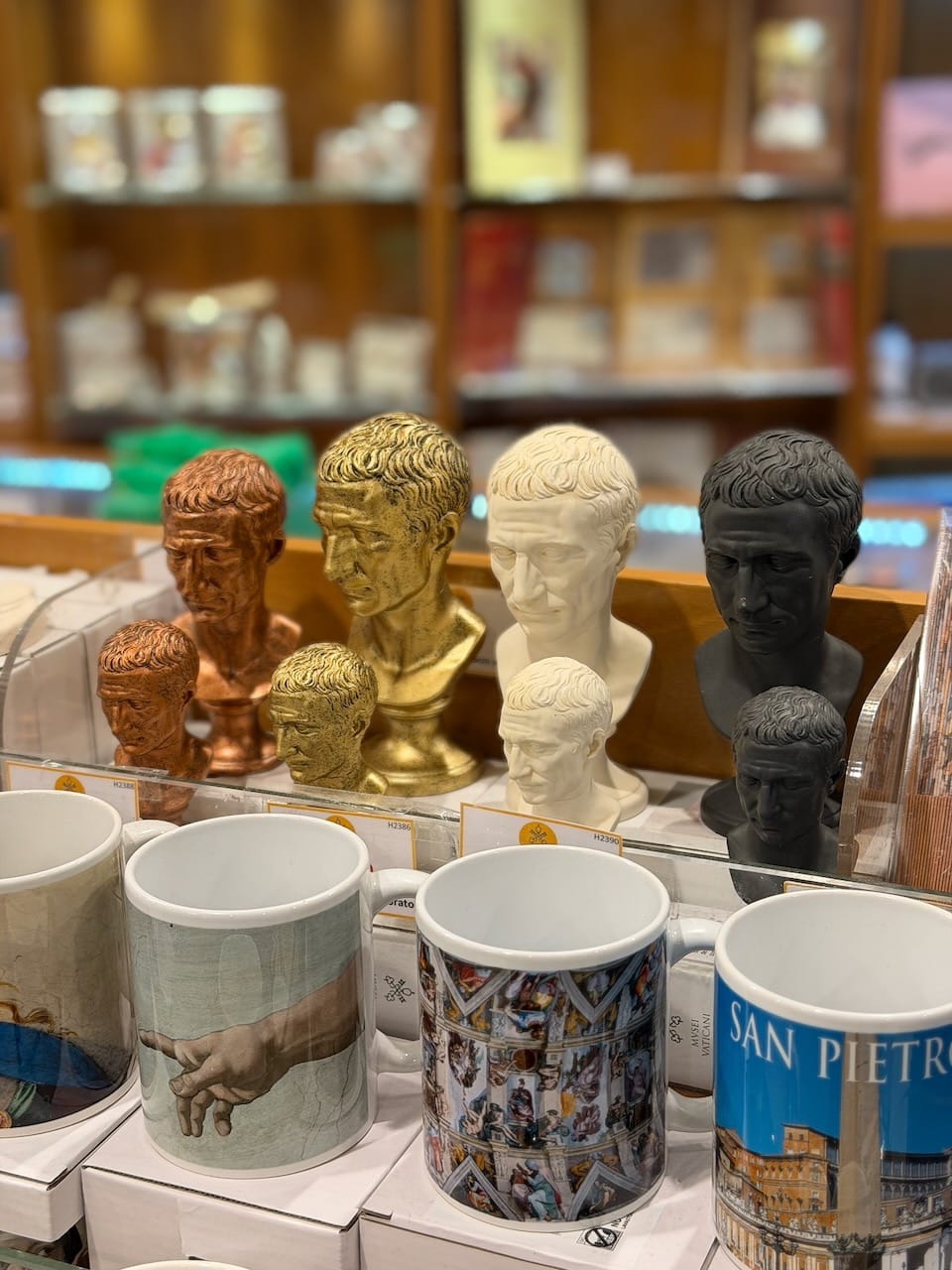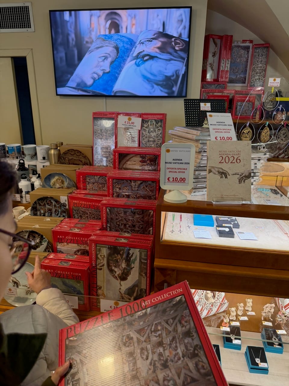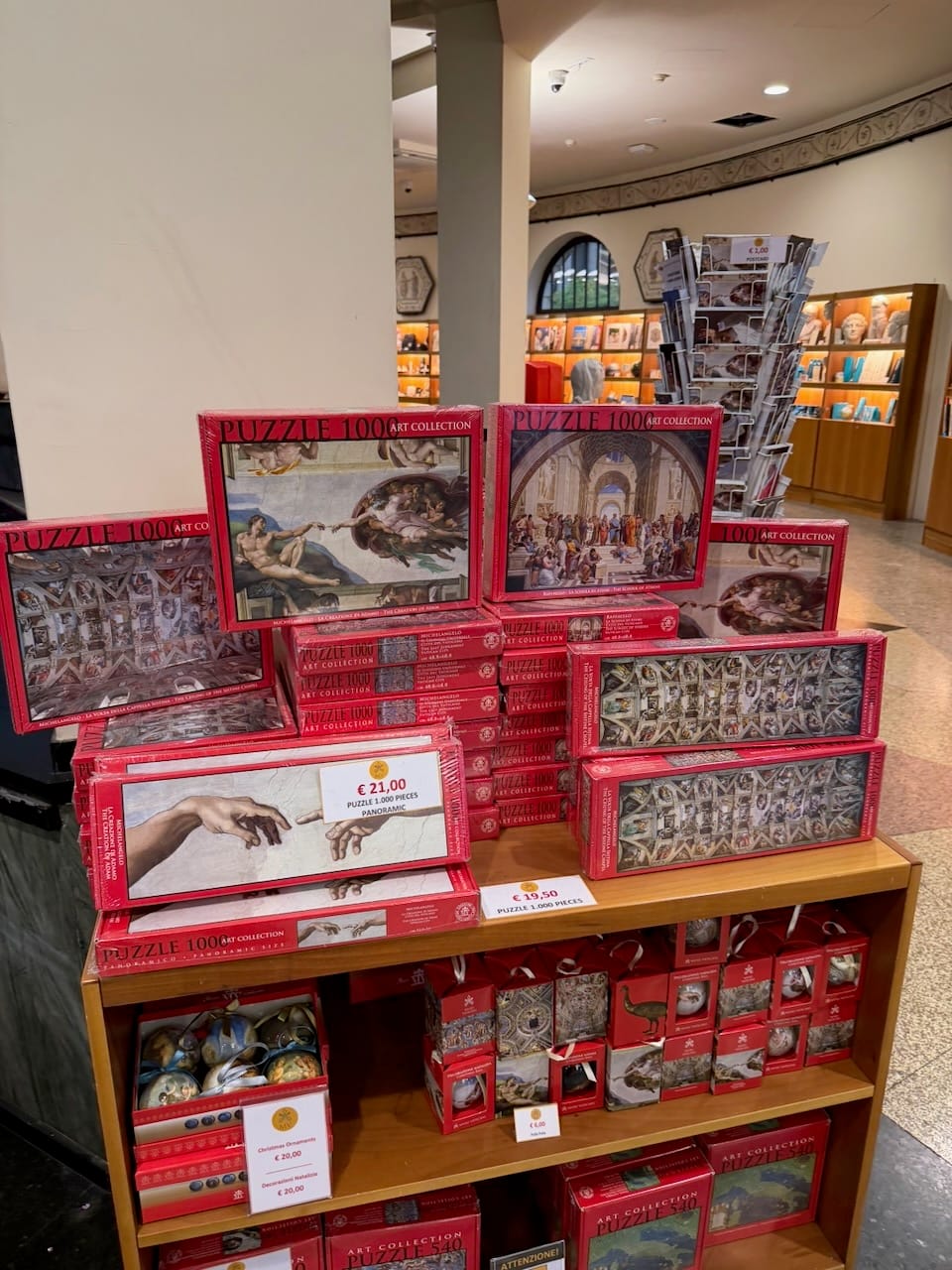 Immediately after entering, we passed through the official museum gift shop. If you’re on a guided tour, this is basically your only chance to visit it (while there’s another shop in St. Peter’s Square, some items here might be exclusive). My wife had her eye on a jigsaw puzzle but decided to put it off… and later regretted it, even though we eventually found it again in the shop outside on the square. Then came the famous spiral staircase, and the guide pointed us to the exact spot for the perfect photo.