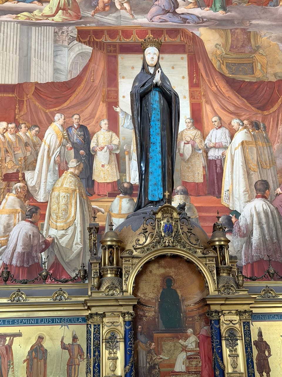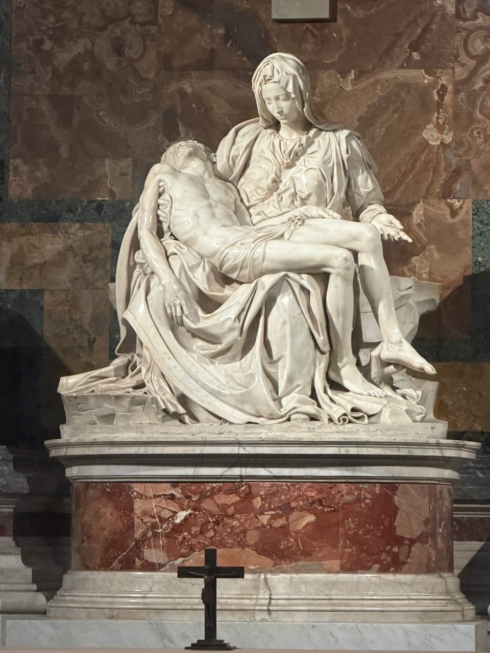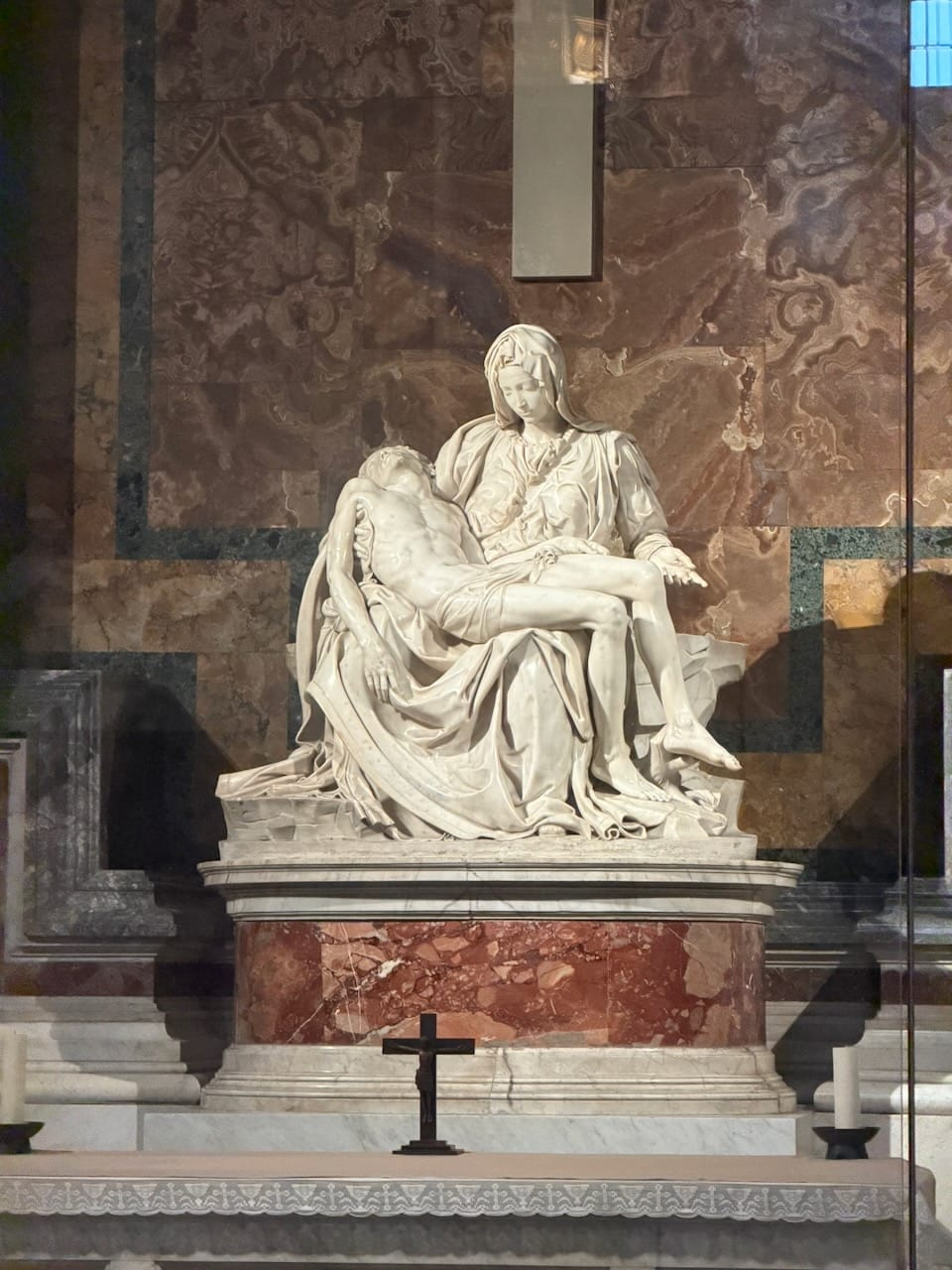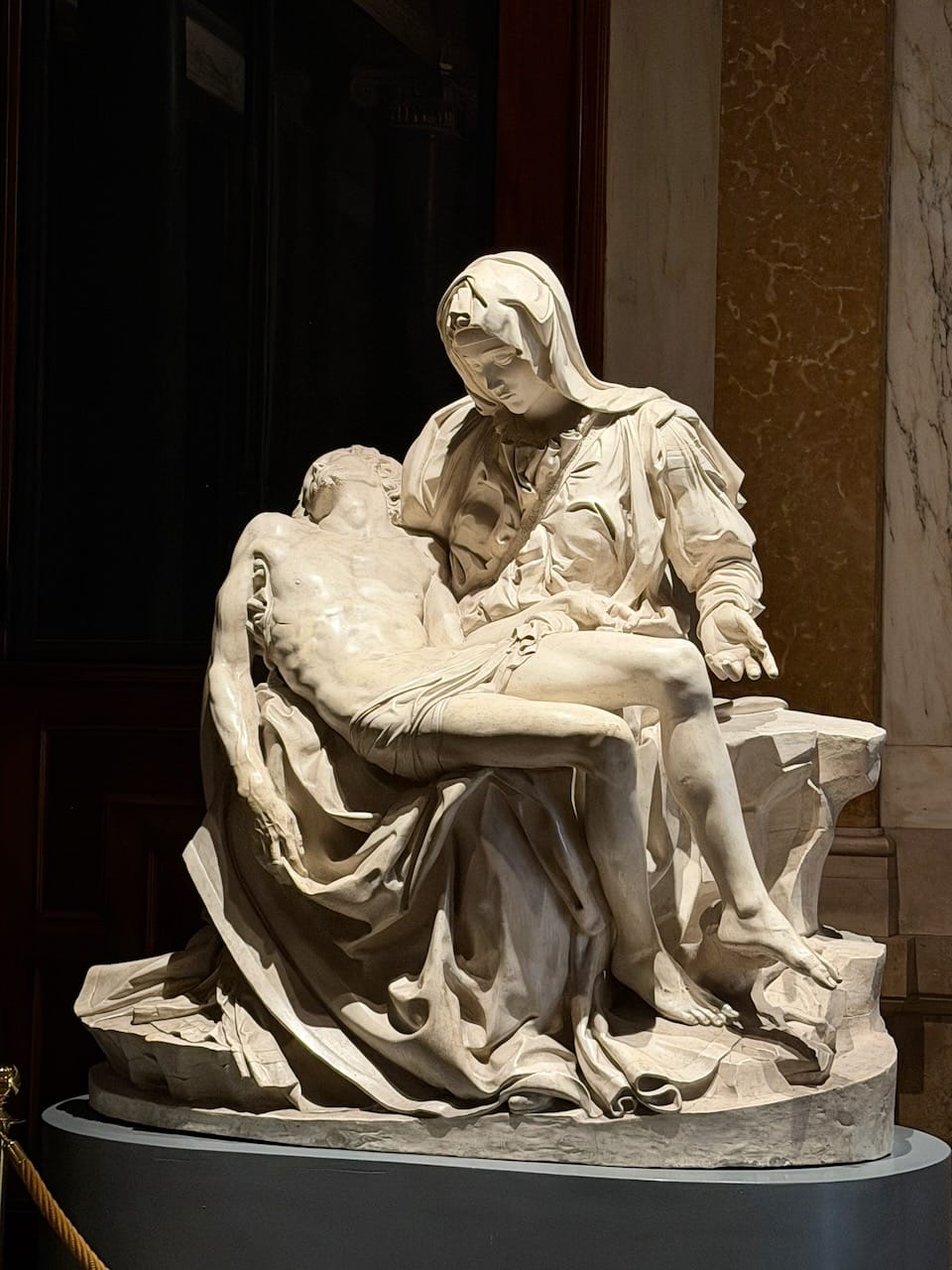 Inside, we finally stood in front of Michelangelo’s Pietà — the real one, not a replica. It now rests behind thick bullet-proof glass, a silent reminder of the tragedy that once damaged it. Even with the barrier, the sculpture felt impossibly close, human, and devastatingly precise.