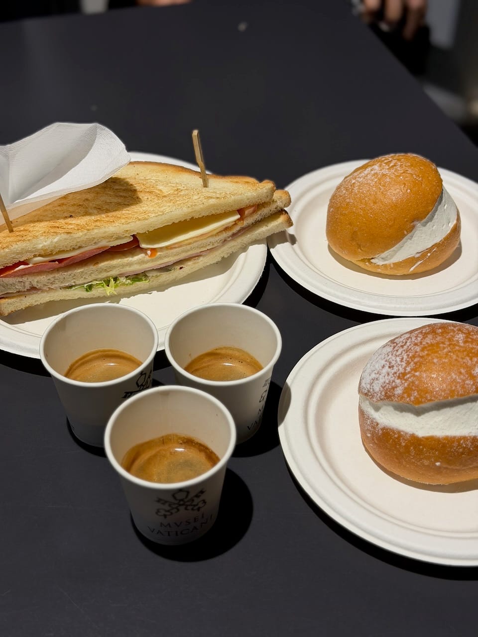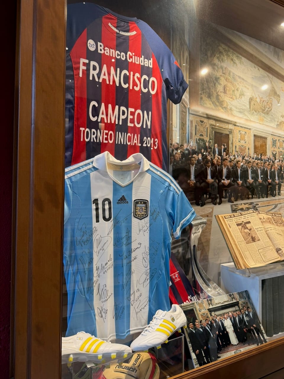 By then, nearly two hours had passed, and it was time for lunch. There were a few small cafes inside the museum complex, and Mingky gave us a break at one located beside the garden. I’m not completely sure, but it might have been the same garden shown in the Netflix film The Two Popes (might be not, but the mood certainly felt familiar). The cafe turned out to be a great choice. We finally tried maritozzi, which the taxi driver on our first day had strongly recommended. They were exactly as advertised. Next to the cafe were displays of Messi’s uniform, which simply reflected the late Pope’s love for soccer.
