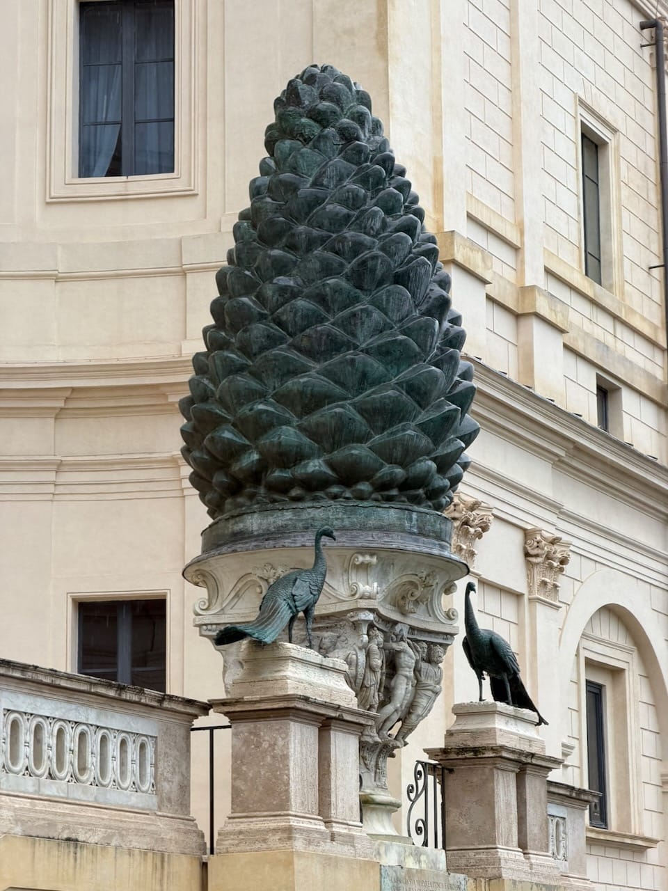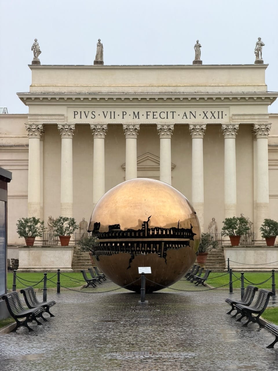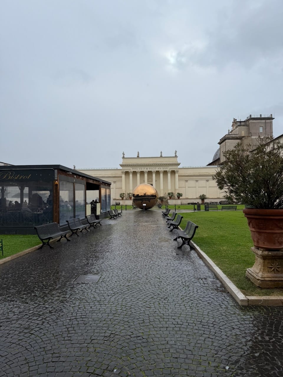 After lunch, we continued the tour and passed through the Pinecone Courtyard. At the center stood Sfera con Sfera, which was the large bronze sphere within a sphere, cracked and layered, as if revealing the fragile structure of the world inside. It felt like a quiet reminder that even perfection has something breaking beneath its surface. Nearby was a restaurant with notably low Google ratings. I heard people say it proudly serves “the most unholy food in the most holy place.” It was clearly meant as a joke, but after days of consistently great meals in Italy, I thought I should try it next time.