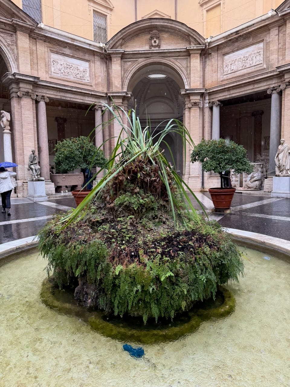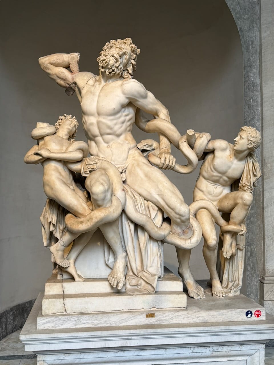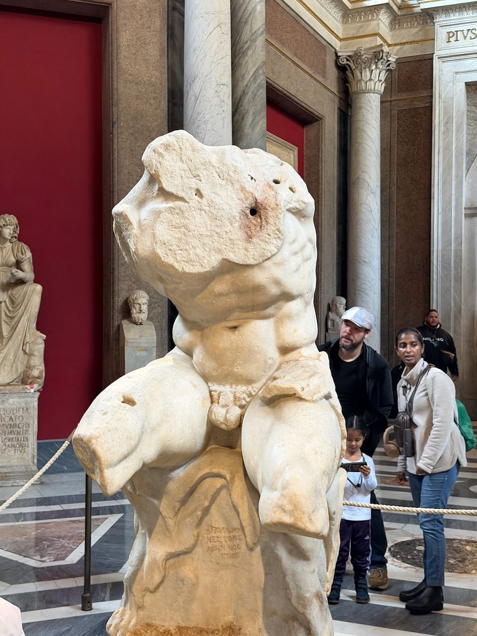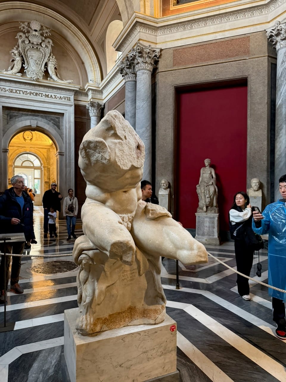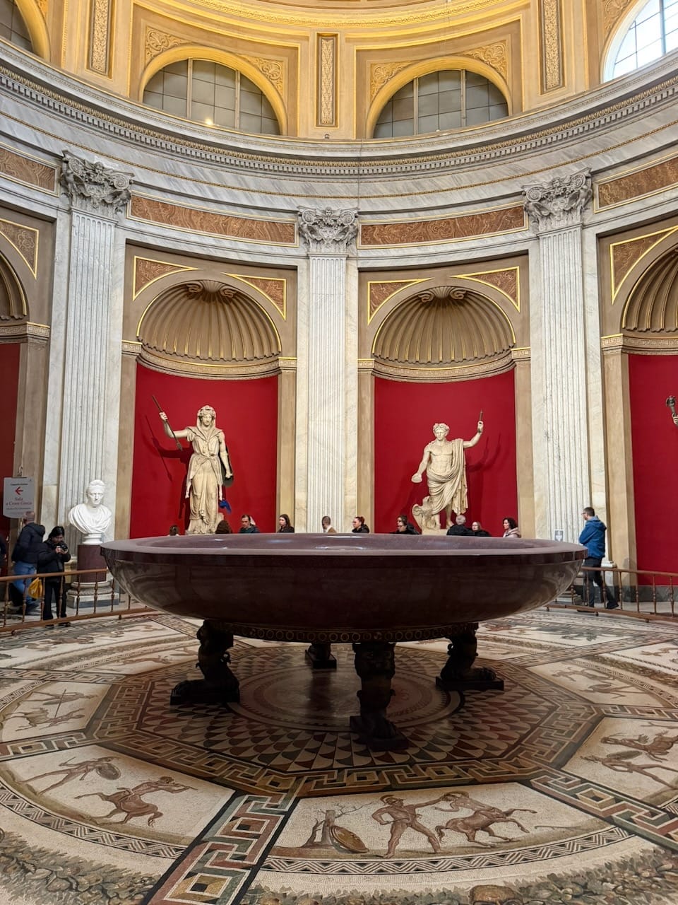 We then entered the Pio-Clementine Museum. Just past the entrance, there was a small garden area where a crowd had already gathered. At the center stood the famous sculpture Laocoön and His Sons. Frozen in a moment of unbearable struggle, bodies twisting as serpents coil around them. Even in still marble, the tension and pain felt alive. Inside, the collection of classical sculptures was overwhelming. We saw the Belvedere Torso. Broken, yet somehow even more beautiful because of it, revealing new forms and power from every angle. I heard that this fragment later became the inspiration for Rodin’s The Thinker. We also saw Nero’s Bathtub—massive, heavy, almost absurd in scale. Carved from a single piece of stone, it looked less like a bath and more like a small swimming pool.
