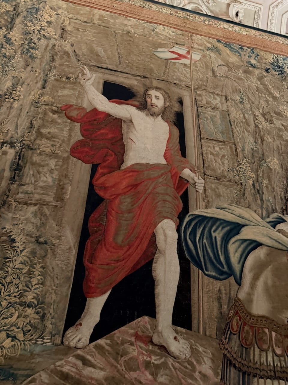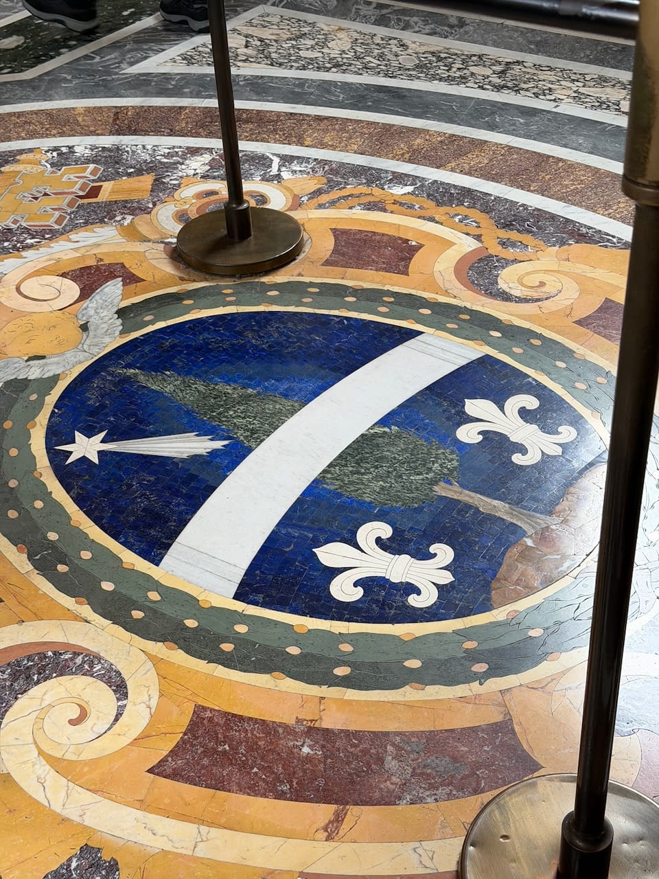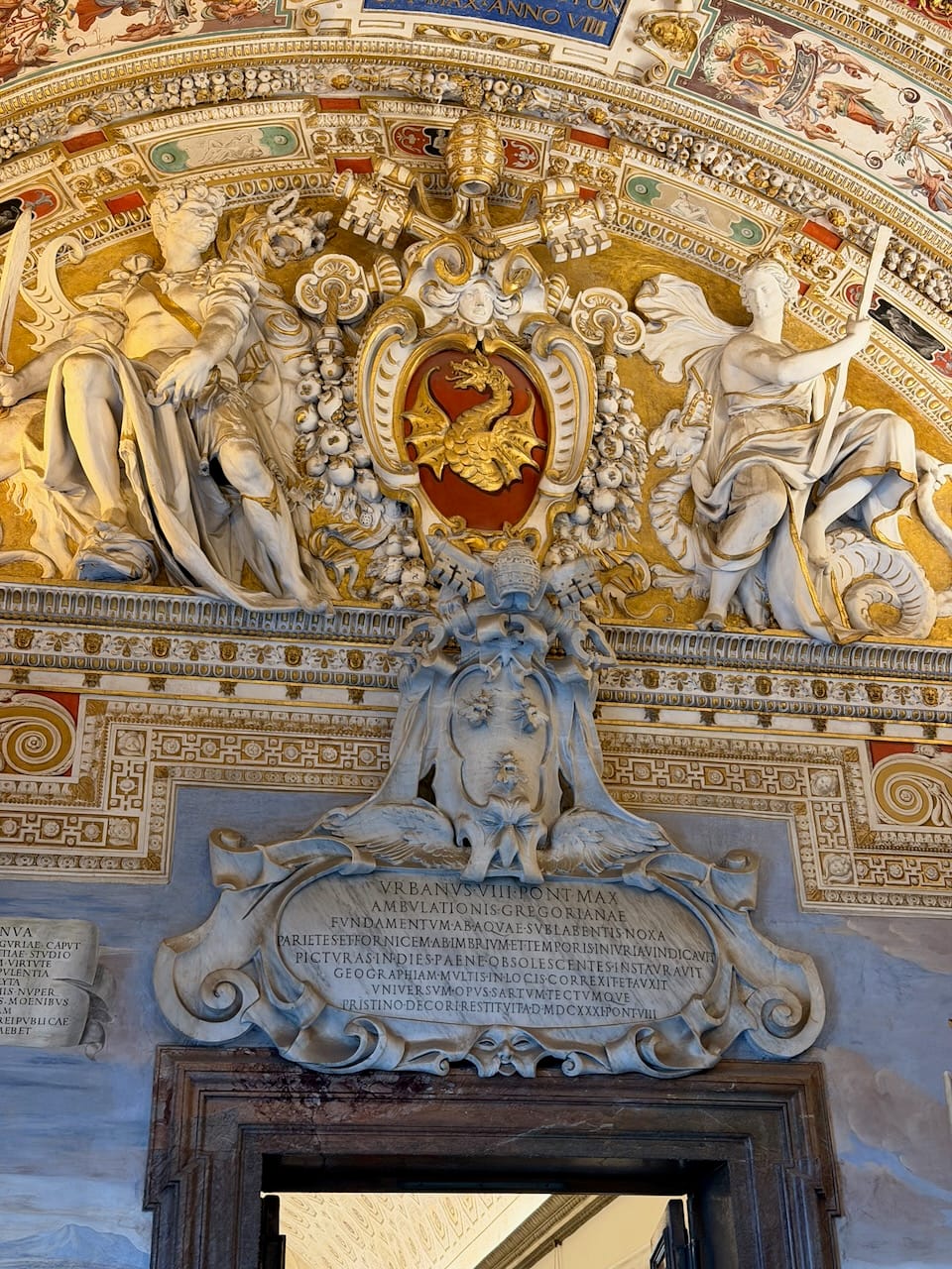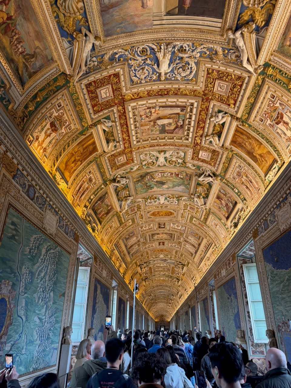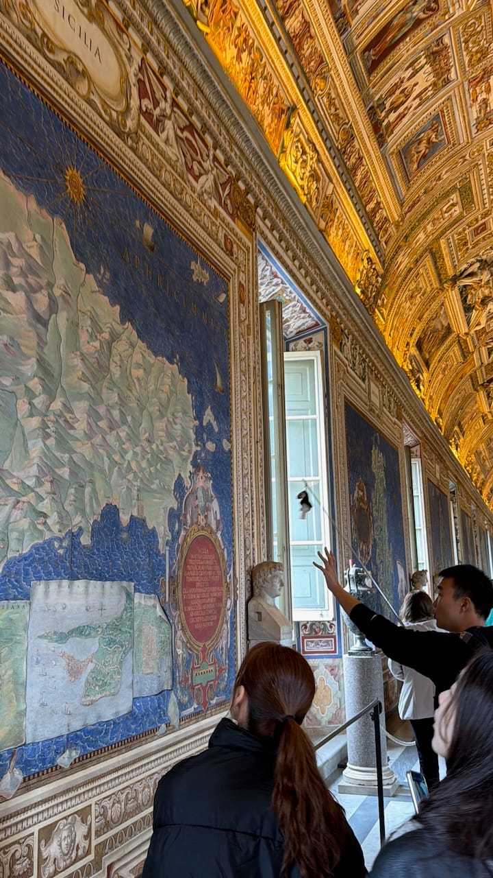From there, we passed a protected area of a deep-blue mosaic and the coat of arms of Pope Leo XIII, then moved through a long corridor lined with magnificent tapestries, before arriving at the breathtaking Gallery of Maps. At first glance, the painted ceiling demanded attention—dramatic, colorful, overwhelming. But the real power of the room, I felt, came from the maps themselves. In that era, maps were information, and information was power.