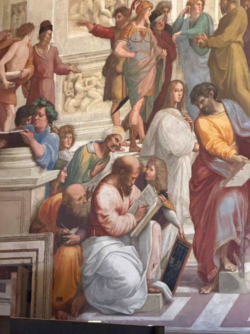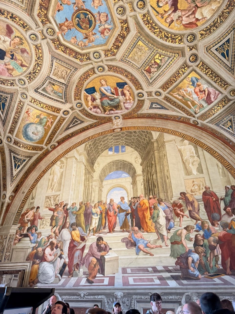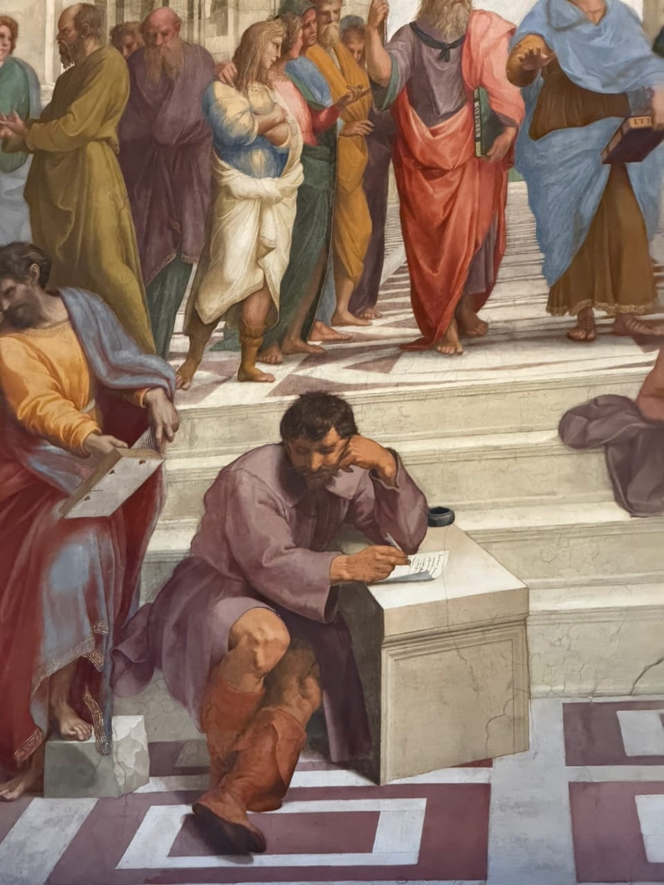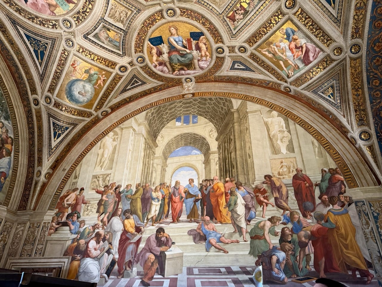 The School of Athens was, without question, my favorite. The very existence of this painting—a gathering of Greek philosophers, many of them pagans or cults by Christian standards—inside one of the holiest places of Catholicism felt like a quiet declaration of the Renaissance spirit: generous, confident, and unafraid of knowledge from every direction. Spotting the figures was pure joy. Socrates, Euclid, Pythagoras, Plato, and even Raphael himself along with his great rival Michelangelo, all hidden in plain sight within the masterpiece. It felt like a living puzzle painted into the wall.
