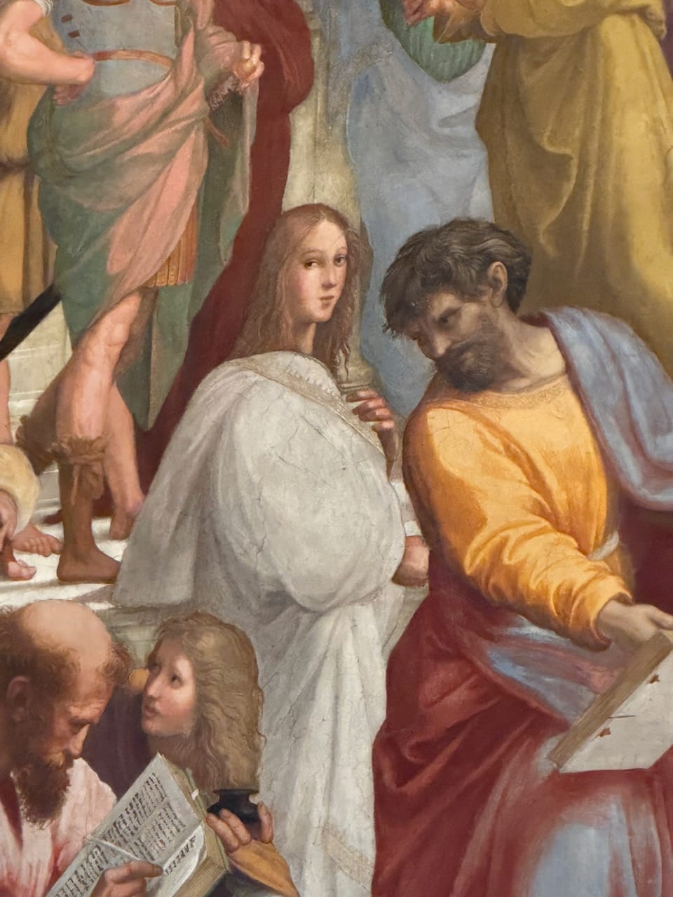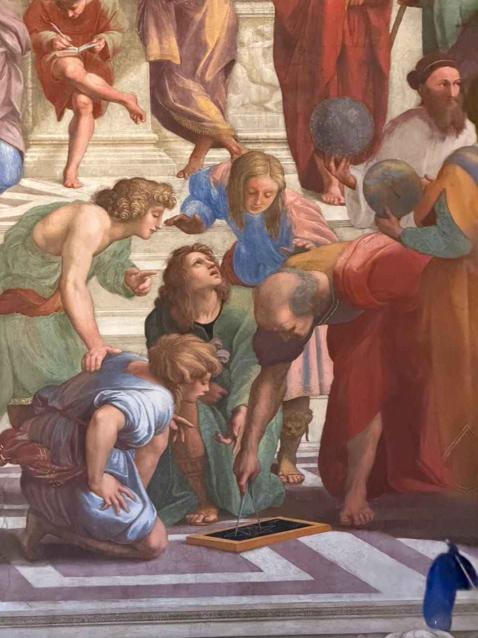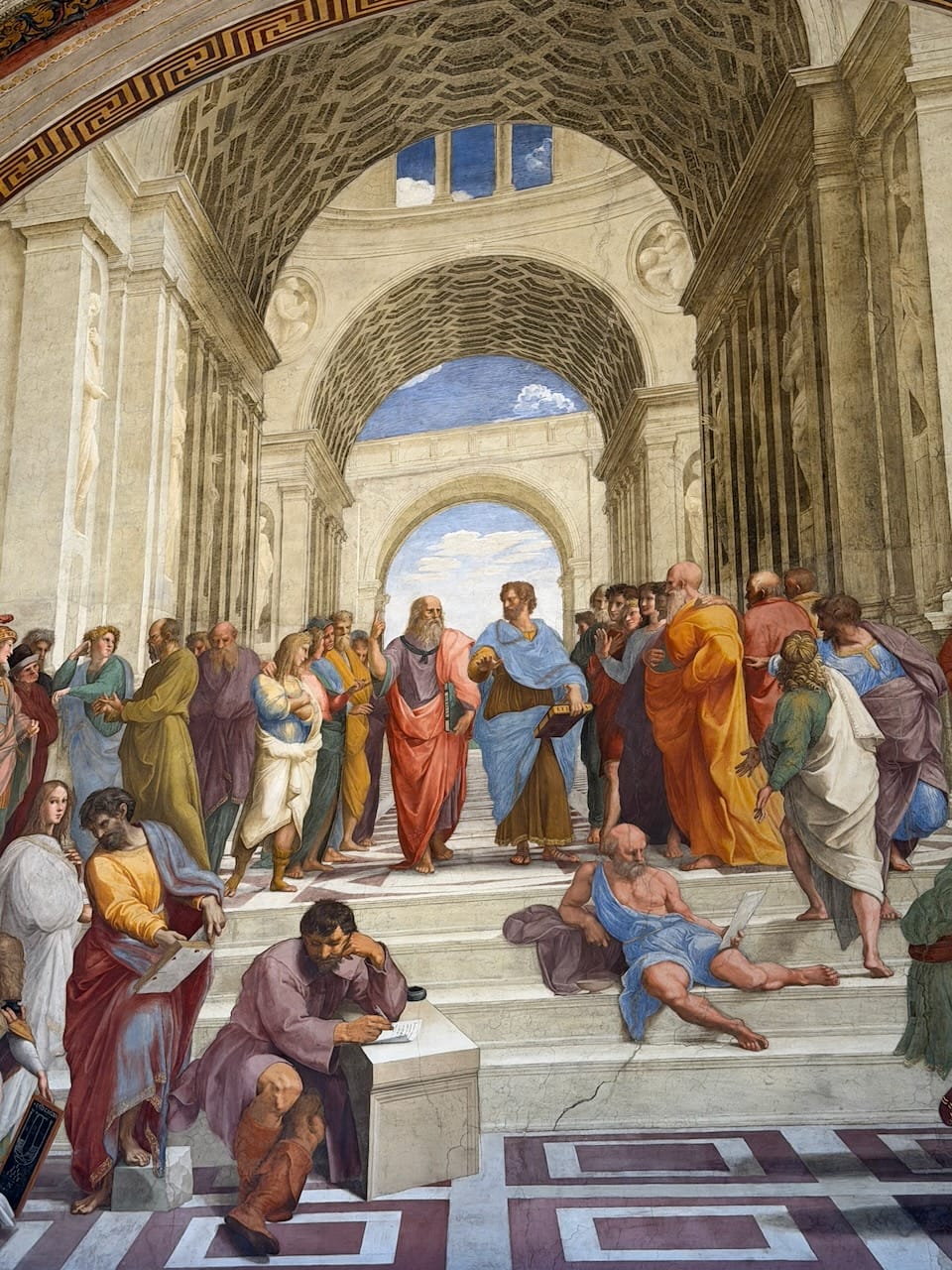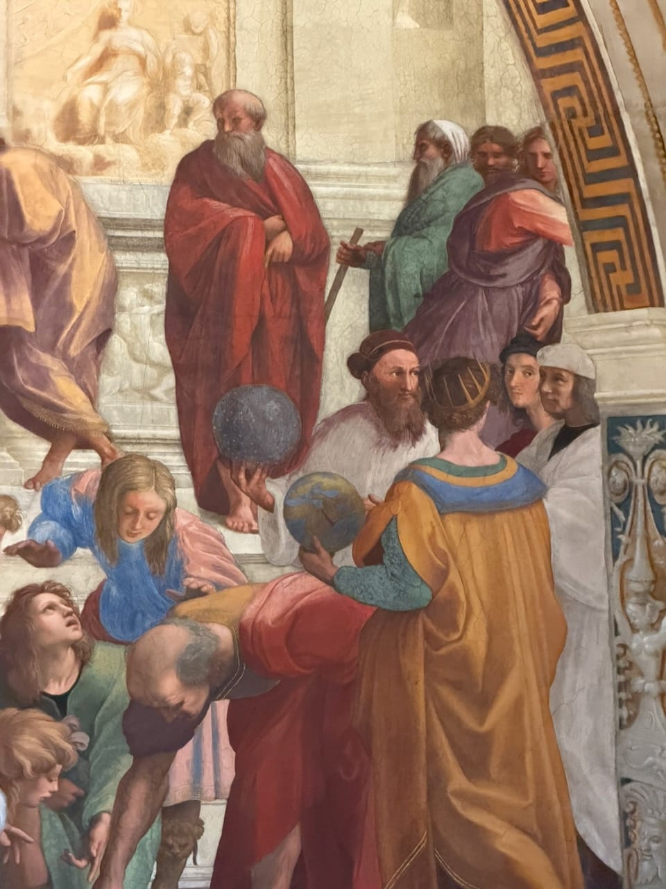 The School of Athens was, without question, my favorite. The very existence of this painting—a gathering of Greek philosophers, many of them pagans or cults by Christian standards—inside one of the holiest places of Catholicism felt like a quiet declaration of the Renaissance spirit: generous, confident, and unafraid of knowledge from every direction. Spotting the figures was pure joy. Socrates, Euclid, Pythagoras, Plato, and even Raphael himself along with his great rival Michelangelo, all hidden in plain sight within the masterpiece. It felt like a living puzzle painted into the wall.