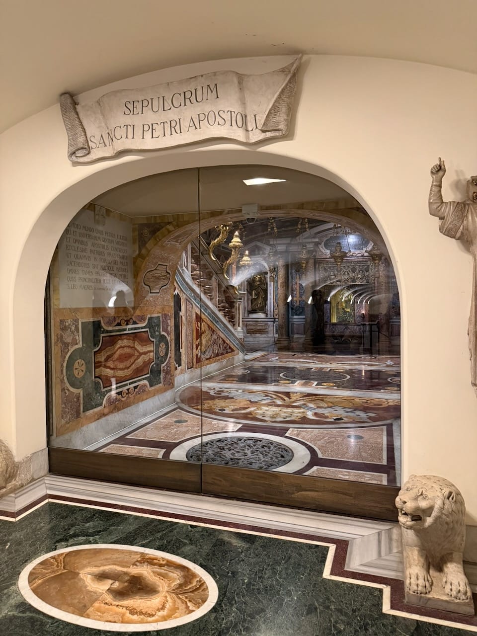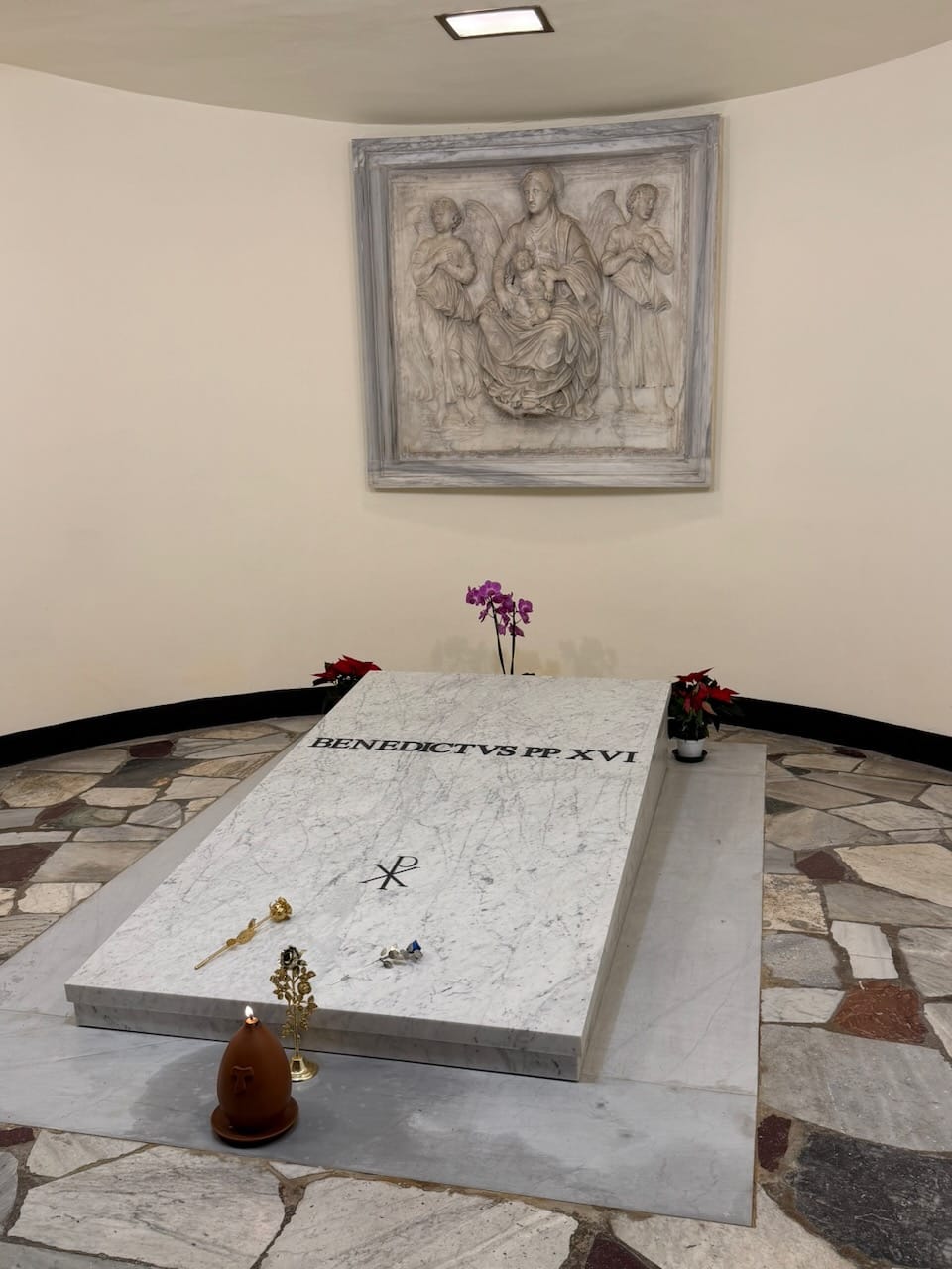 From there, the path led us down into the Vatican Grottoes, located beneath St. Peter’s Basilica, where many former popes now rest in peace. Among them, the one that stayed with me most was Pope Benedict XVI. His resting place was striking in its simplicity — much like that of his successor, Pope Francis, which we had already seen at the Papal Basilica of Saint Mary Major.