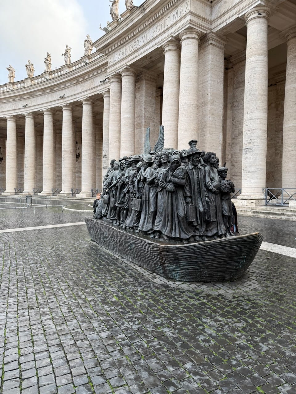 We returned to St. Peter’s Square, and luckily discovered that the post office also served as an official Vatican gift shop. My wife finally bought the jigsaw puzzle of The School of Athens—a puzzle of puzzles, which felt oddly perfect. In the square stood the sculpture Angels Unawares, the last remaining installation (I heard) its series. Looking at it, I couldn’t help but think the world is often too cruel a place for the people, and perhaps this quiet corner of the Vatican is one of the few places they are allowed to rest.