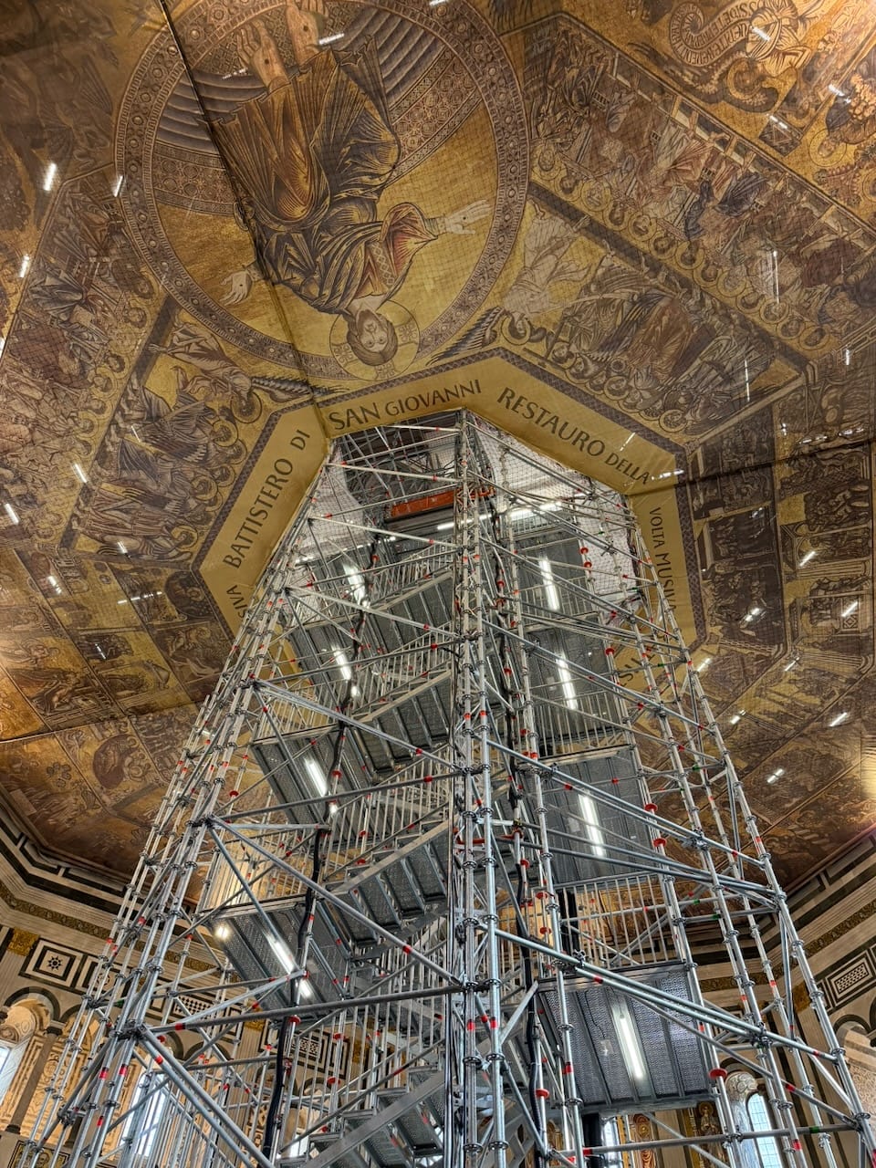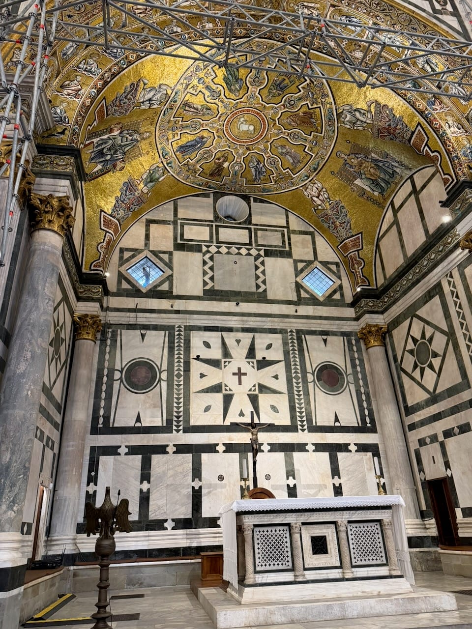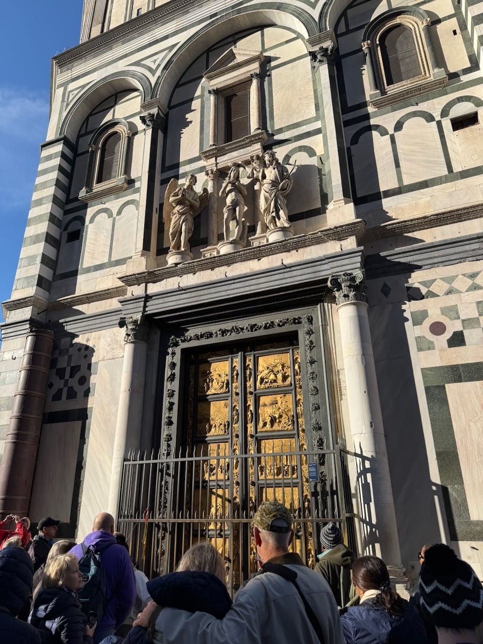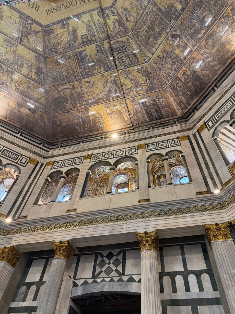 We were eager to make the most of our Brunelleschi Pass, but when we saw the long line forming for Giotto’s Bell Tower, we decided to switch plans and head to the Baptistery instead. It’s famous for its bronze doors—especially the glowing “Gates of Paradise,” created by Lorenzo Ghiberti and covered with gold leaf, which is why they shine so brilliantly. Some parts were under renovation, which was a little disappointing, but the interior itself was still striking. Compared to the great basilicas of Rome, the space felt small, yet intensely focused and luminous. The golden mosaic ceiling seemed to float above us, quiet and timeless, as if the entire building existed for that single shimmering surface.
