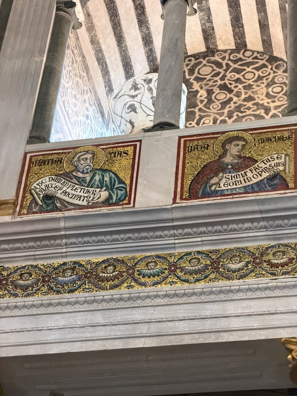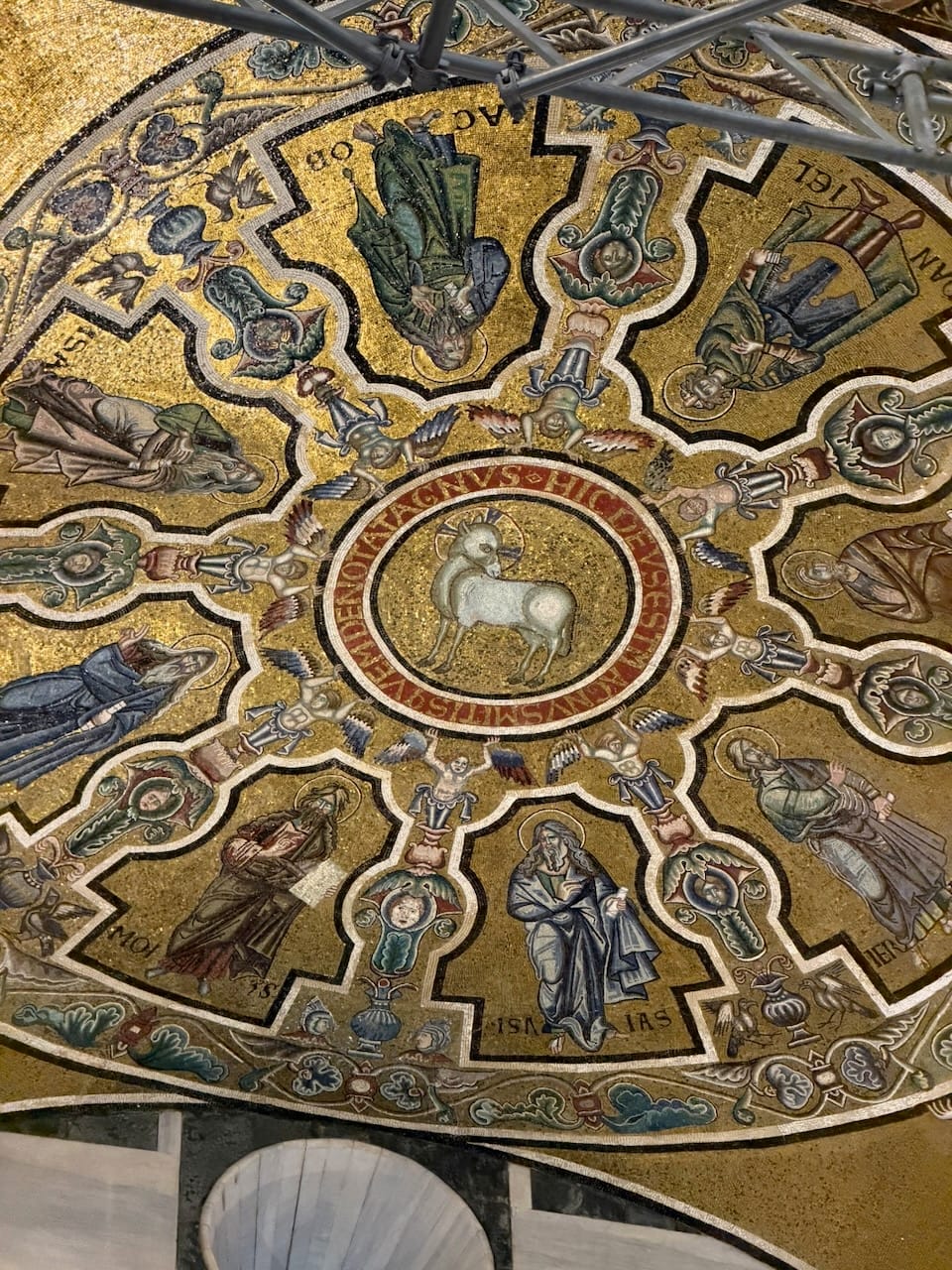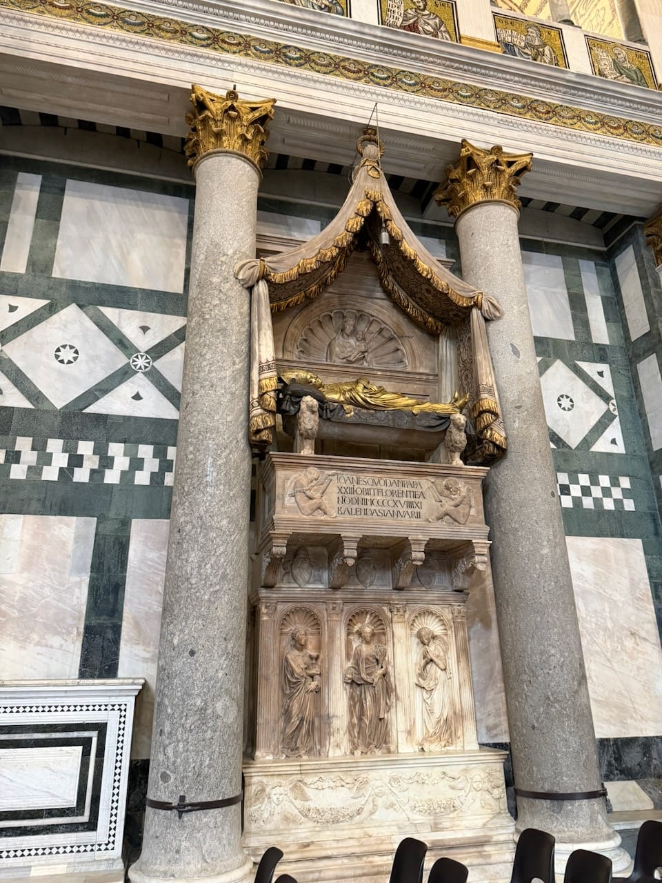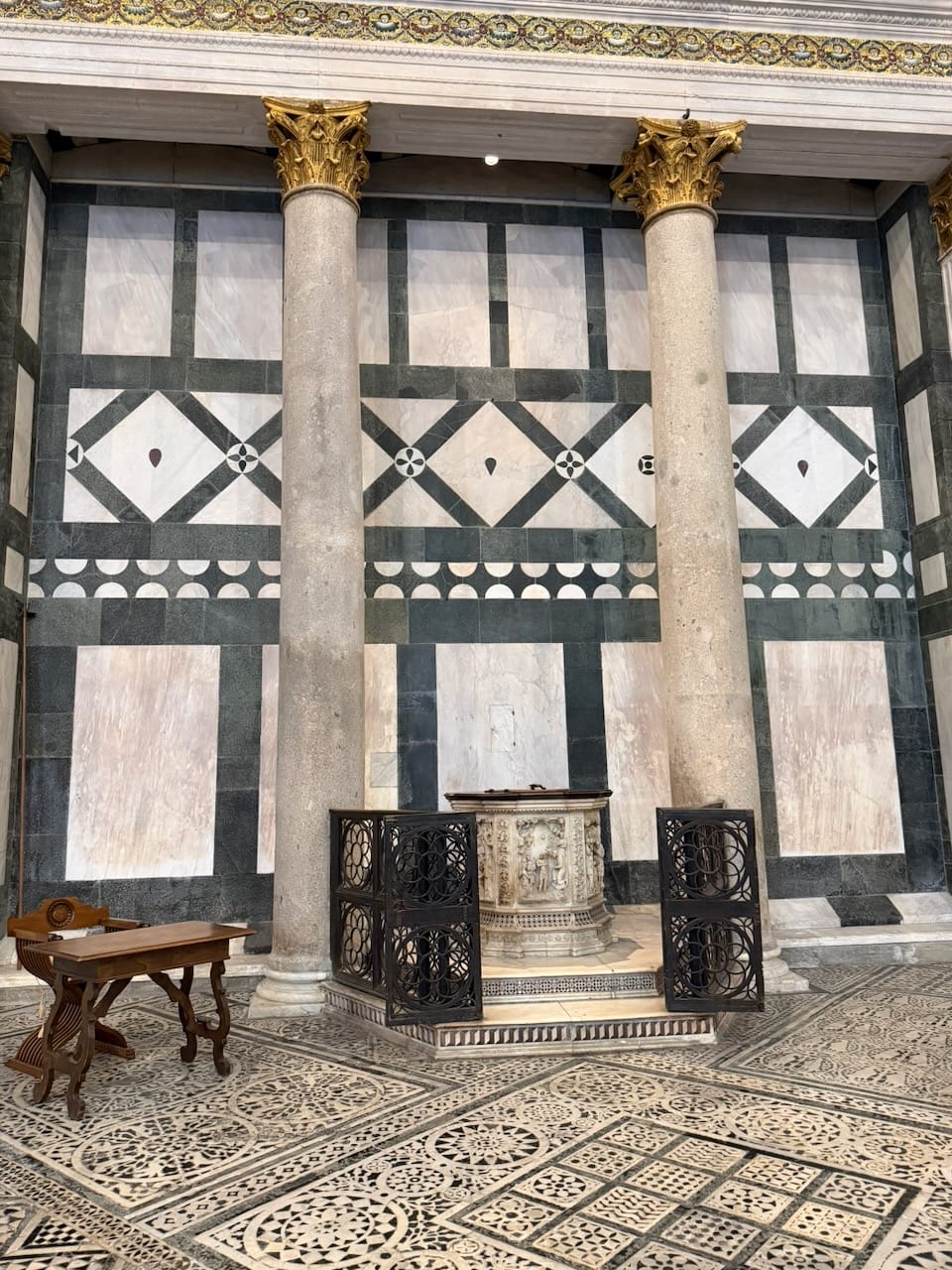 We were eager to make the most of our Brunelleschi Pass, but when we saw the long line forming for Giotto’s Bell Tower, we decided to switch plans and head to the Baptistery instead. It’s famous for its bronze doors—especially the glowing “Gates of Paradise,” created by Lorenzo Ghiberti and covered with gold leaf, which is why they shine so brilliantly. Some parts were under renovation, which was a little disappointing, but the interior itself was still striking. Compared to the great basilicas of Rome, the space felt small, yet intensely focused and luminous. The golden mosaic ceiling seemed to float above us, quiet and timeless, as if the entire building existed for that single shimmering surface.