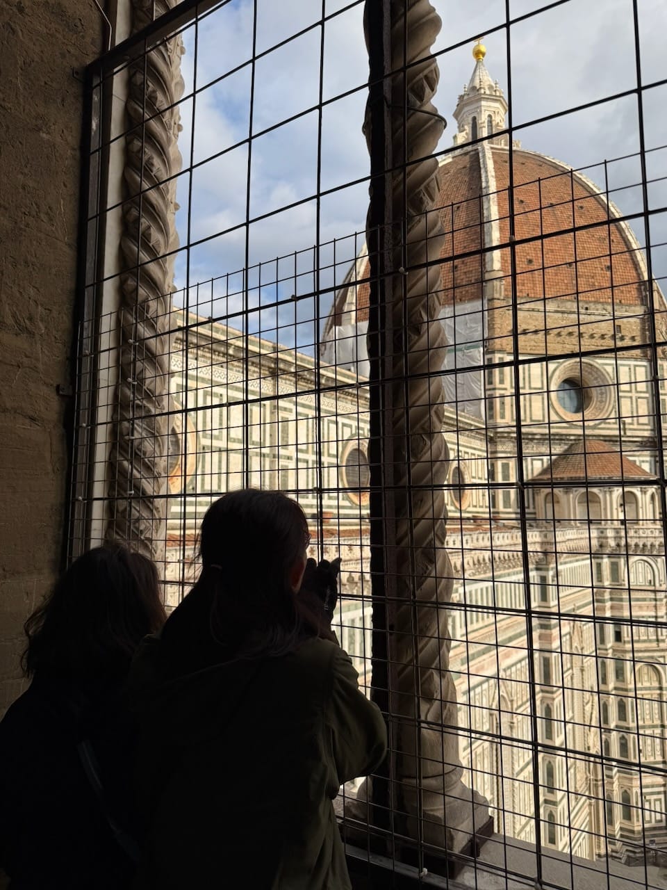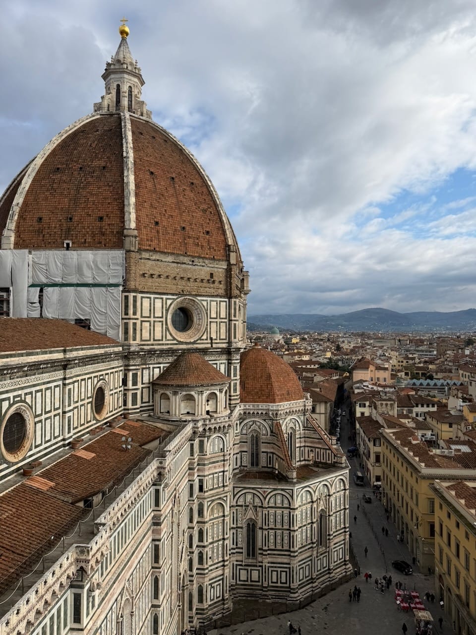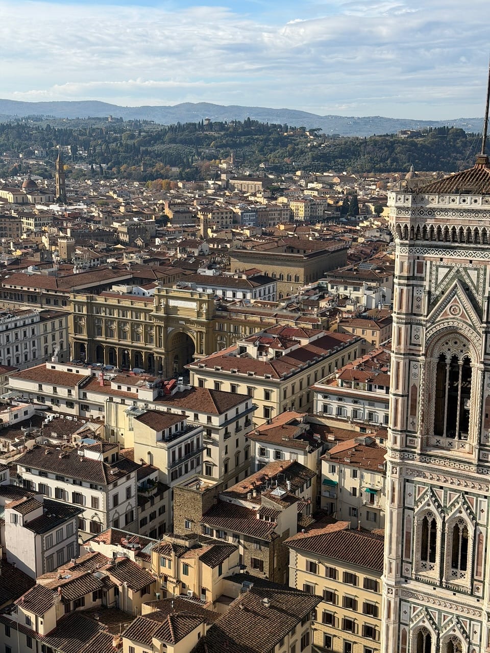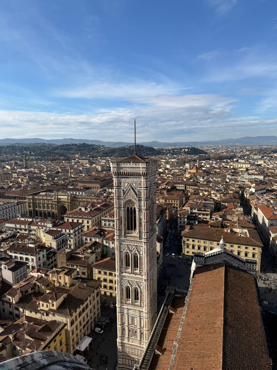 We noticed the line had shortened, so we headed for Giotto’s Bell Tower. The panoramic view from the top of the Duomo had been stunning, but it missed one crucial thing: the Duomo itself. The Bell Tower is the only place where we could truly frame the cathedral together with the city of Firenze — and that alone made the climb worth it. That said, it was another 414 steps. The first day had been a battle of distance; this day was a battle of height. Thankfully, the tower is divided into three or four levels, where we could stop, breathe, and reset our pace. Each level offered a slightly different perspective of the Duomo and the city. And at the very top came the final reward: the perfect frame: the Duomo rising over Firenze.