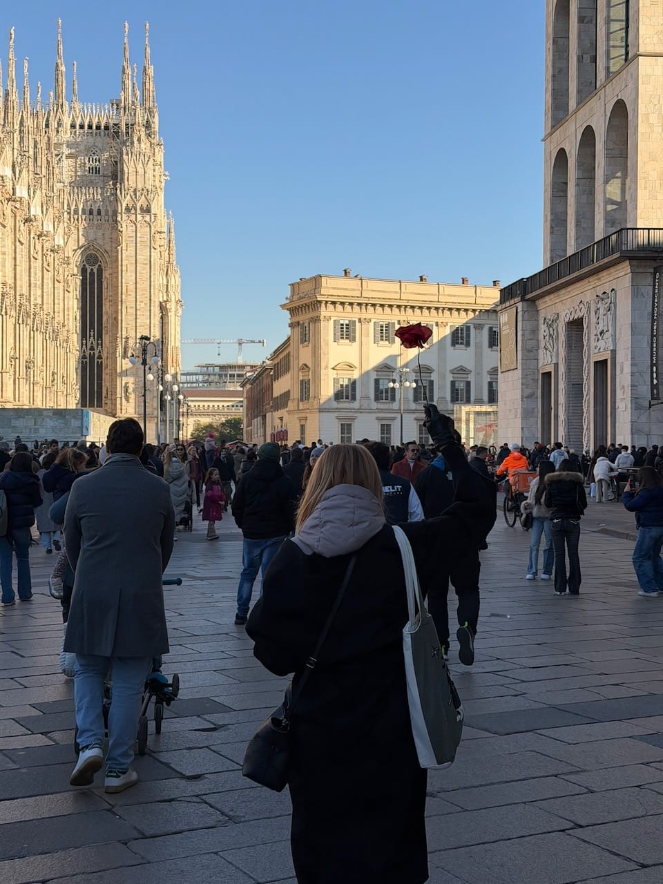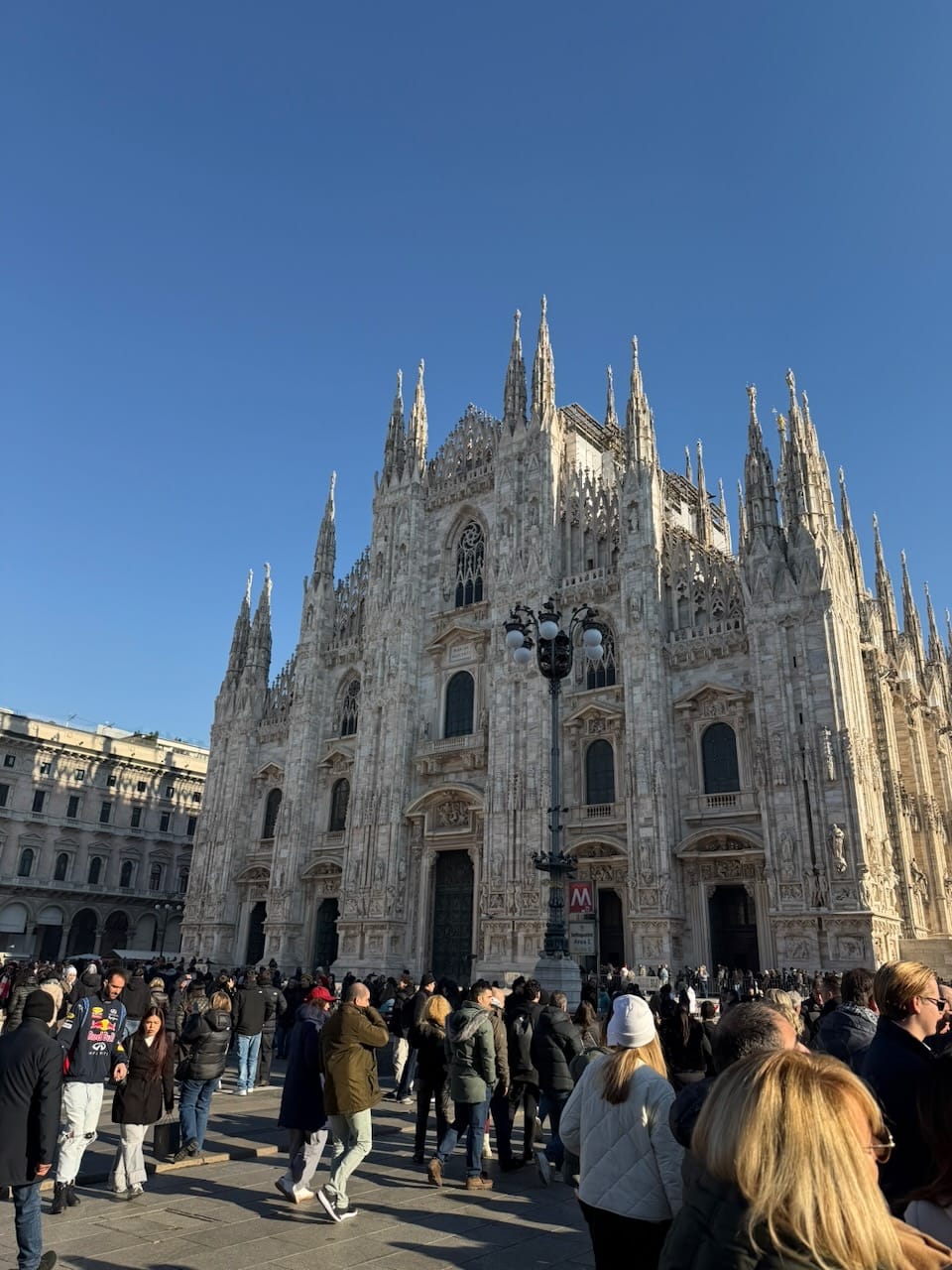 The square itself was overflowing with people and pigeons. Towering above everything was the magnificent Duomo di Milano, its forest of white spires reaching into the sky.