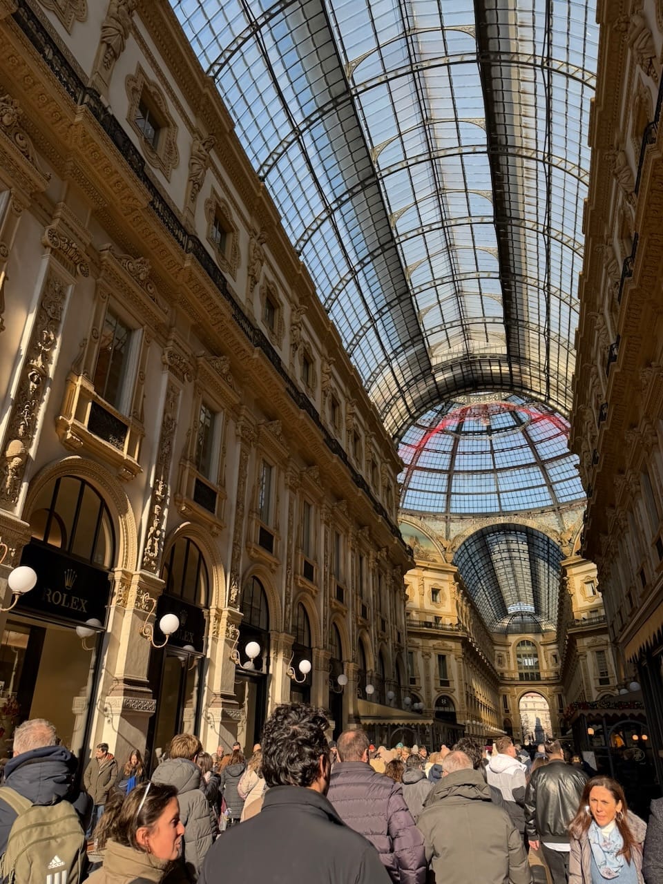 We still had time before lunch, so we wandered through Galleria Vittorio Emanuele II. The place was vibrant and theatrical, with its glass ceiling, polished floors, luxury storefronts, and constant movement. Built in the 19th century, it is one of the world’s oldest shopping malls, and it still feels like the living room of the city.