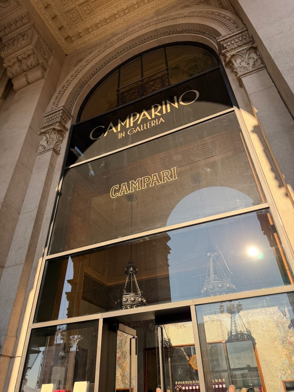 We had lunch at Camparino in Galleria, one of Milan’s most iconic spots. The bar has a long history with Campari, the famous Italian bitter aperitif invented in nearby Novara in the 19th century. Camparino has been serving classic Campari drinks here for generations, and its location in the heart of the Galleria Vittorio Emanuele II makes it feel like the historic social hub of the city.