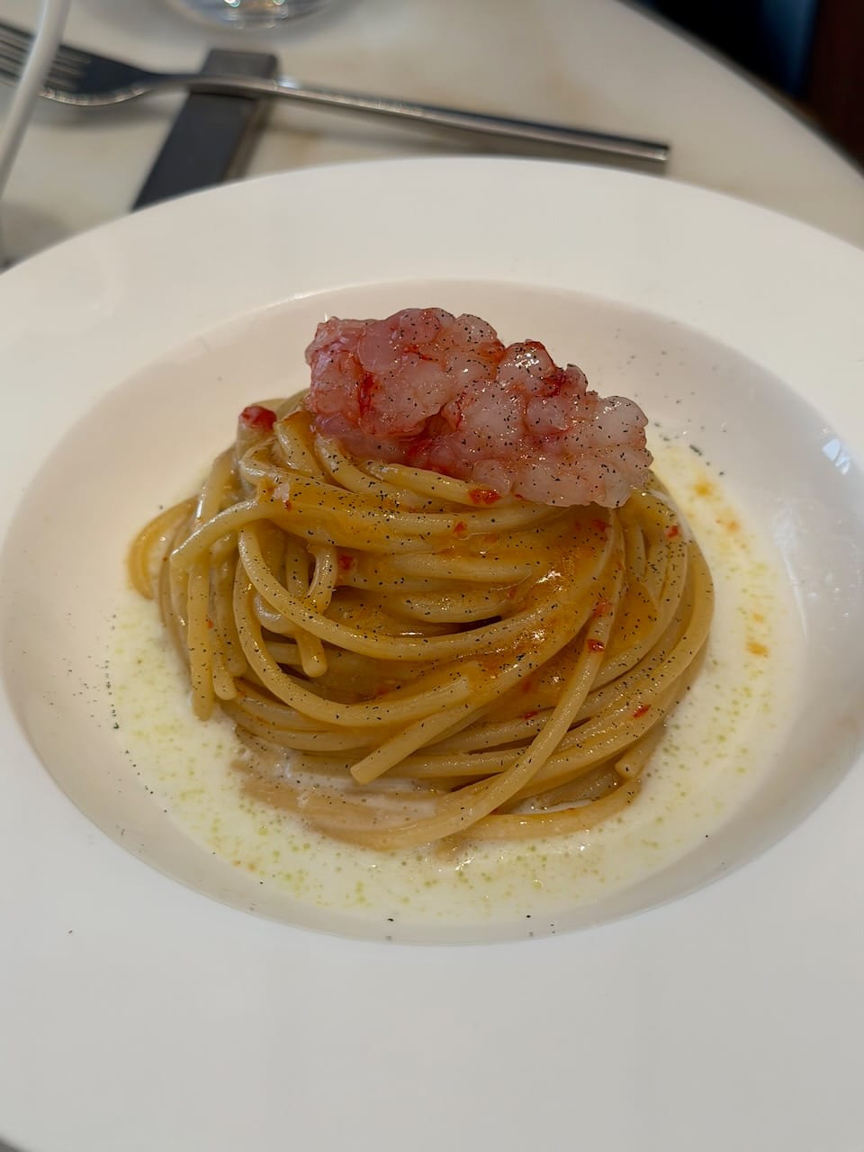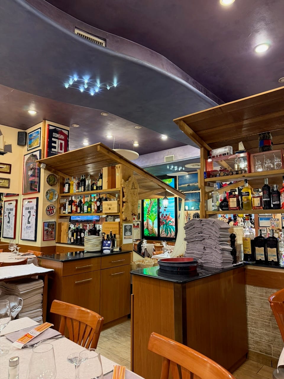 The place has a familiar structure: a lively bar with a casual atmosphere on the ground floor, where many people sipped bright red Campari spritzes and enjoyed light bites, and a more refined restaurant upstairs. (Italians often serve a pre-dining drink, frequently a spritz, before a meal. The classic spritz originated in northern Italy and typically includes a bitter aperitif (like Campari), sparkling wine, and a splash of soda.)