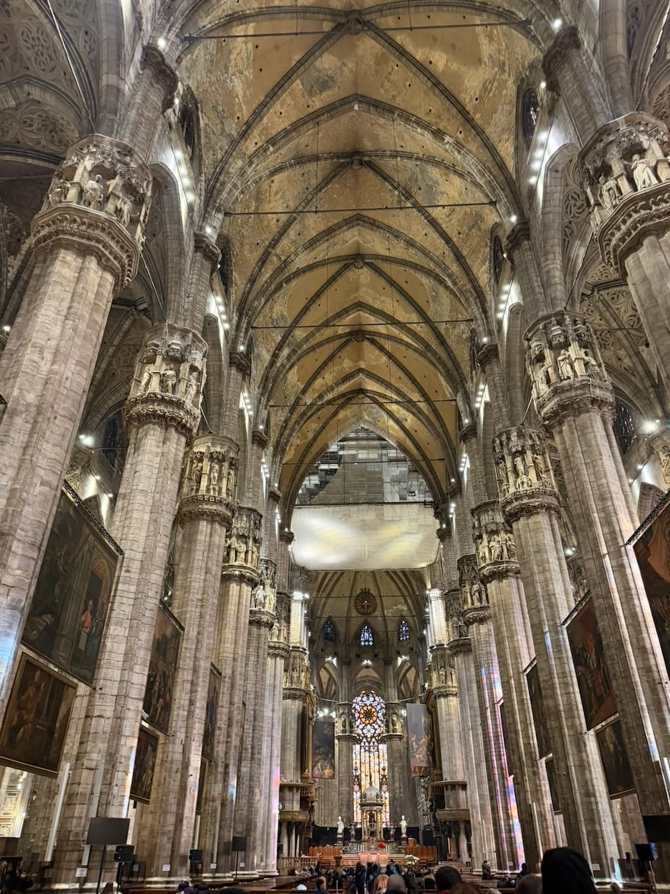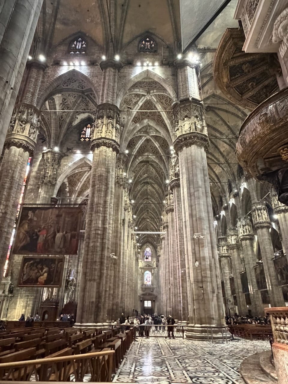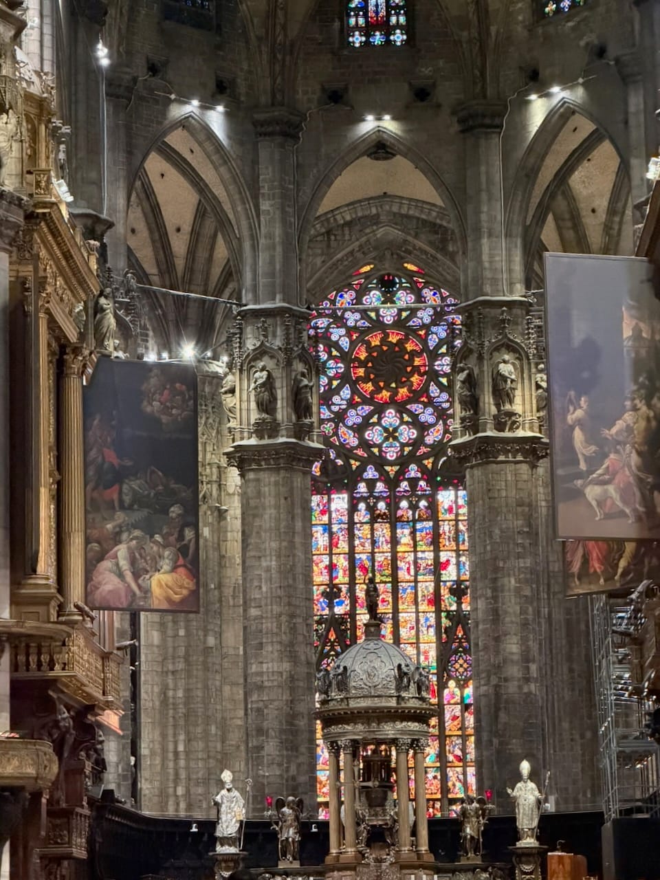Inside, the cathedral was grand, even after all the great churches we had already seen on this trip. But what stood out most were the stained-glass windows. They were extraordinary, filling the massive interior with color and depth in a way that felt uniquely Milanese. Historically, (the guide said) the cathedral’s Gothic style was not always admired by Renaissance purists from other cities like Firenze, who favored cleaner classical lines over elaborate northern Gothic detail. Standing inside, though, it’s hard not to feel that the building speaks for itself.