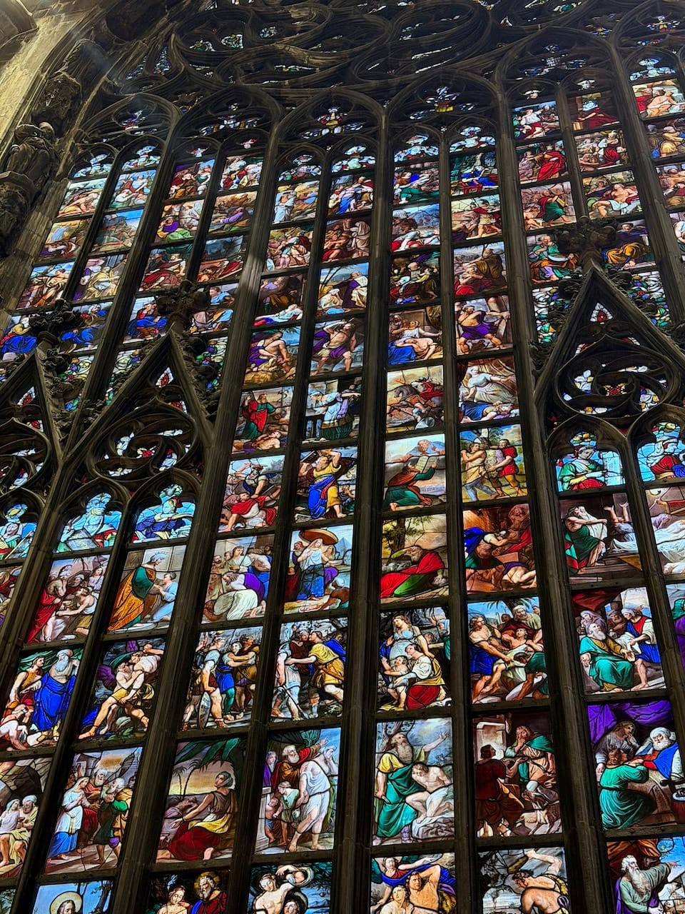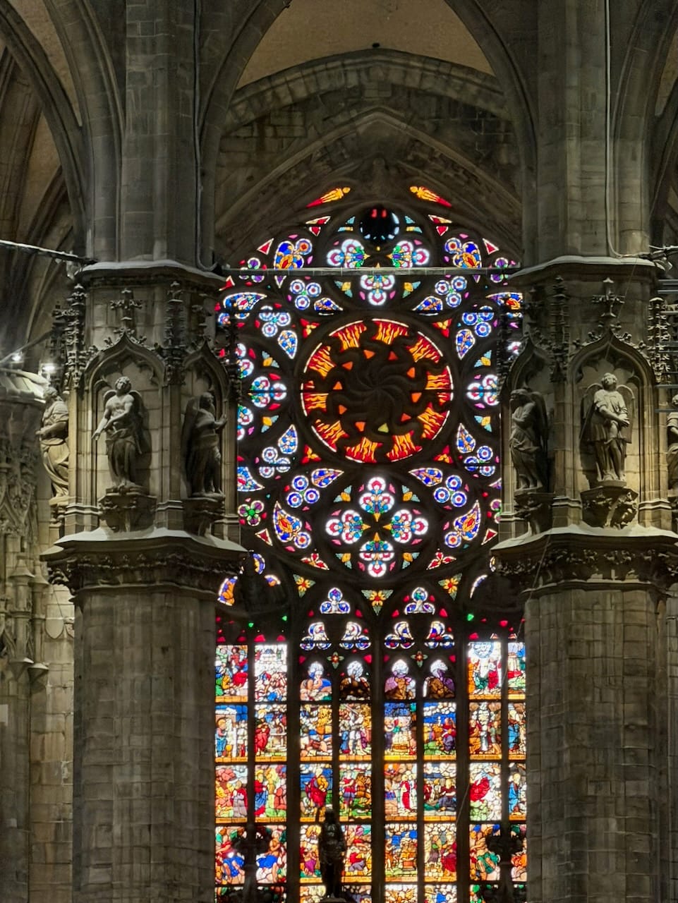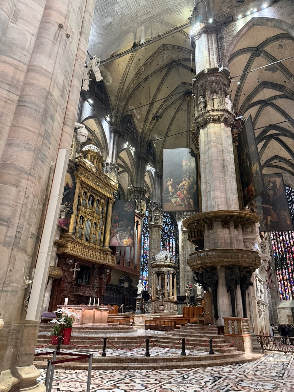 Inside, the cathedral was grand, even after all the great churches we had already seen on this trip. But what stood out most were the stained-glass windows. They were extraordinary, filling the massive interior with color and depth in a way that felt uniquely Milanese. Historically, (the guide said) the cathedral’s Gothic style was not always admired by Renaissance purists from other cities like Firenze, who favored cleaner classical lines over elaborate northern Gothic detail. Standing inside, though, it’s hard not to feel that the building speaks for itself.