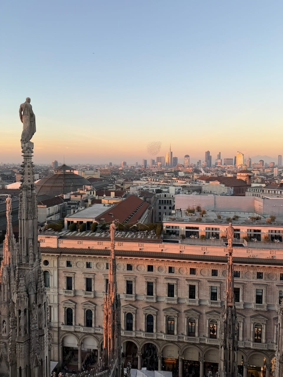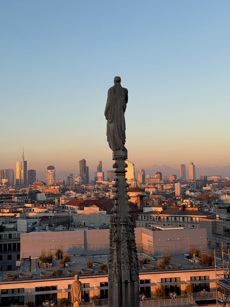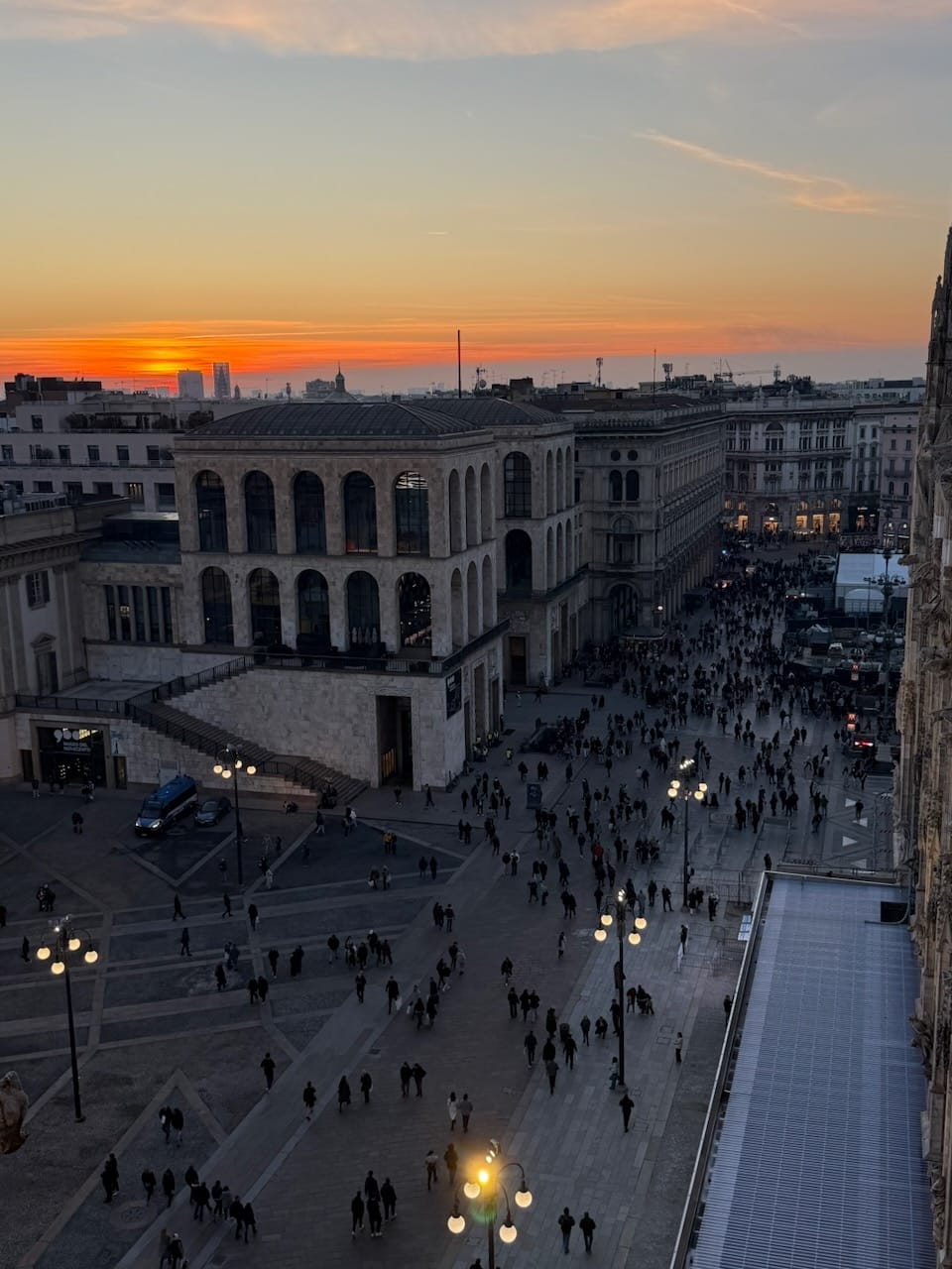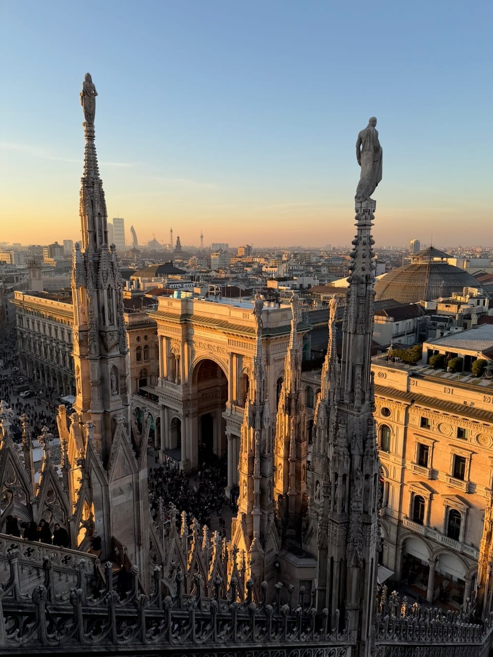 From the top of the Duomo, Milan unfolded beneath us in layers. Closest was the forest of white Gothic spires, sharp and intricate. Beyond that, the softer geometry of the 19th-century city, with the glass dome of the Galleria shimmering in the distance. And farther still, the modern skyline, where contemporary towers—including the Bosco Verticale, the Vertical Forest—rose quietly against the fading light. As the sun sank, the sky turned warm and the marble glowed. It was another one of those moments that didn’t need a schedule to become perfect.