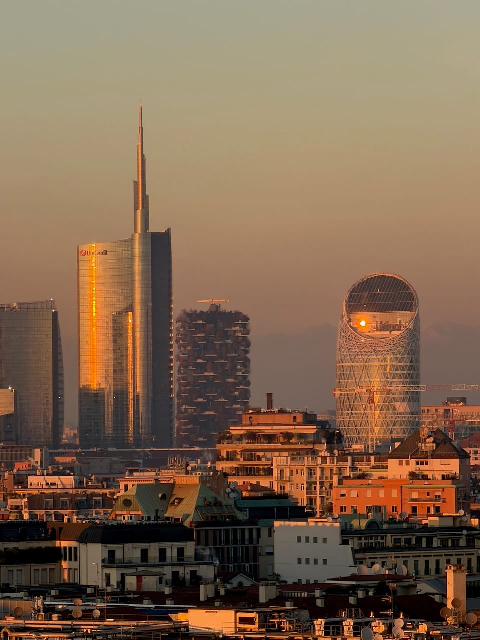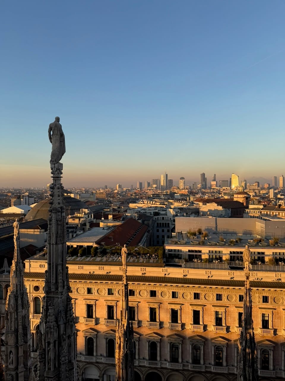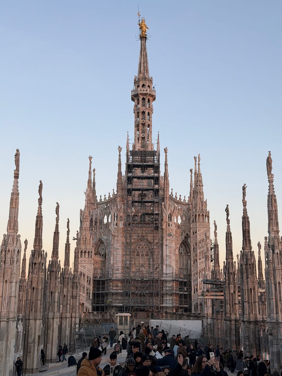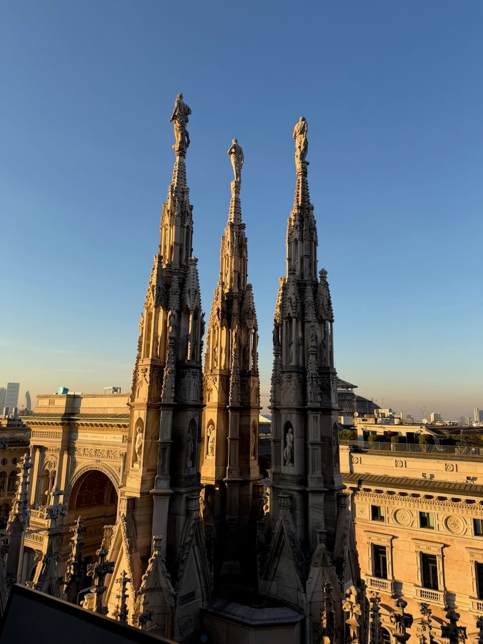 From the top of the Duomo, Milan unfolded beneath us in layers. Closest was the forest of white Gothic spires, sharp and intricate. Beyond that, the softer geometry of the 19th-century city, with the glass dome of the Galleria shimmering in the distance. And farther still, the modern skyline, where contemporary towers—including the Bosco Verticale, the Vertical Forest—rose quietly against the fading light. As the sun sank, the sky turned warm and the marble glowed. It was another one of those moments that didn’t need a schedule to become perfect.