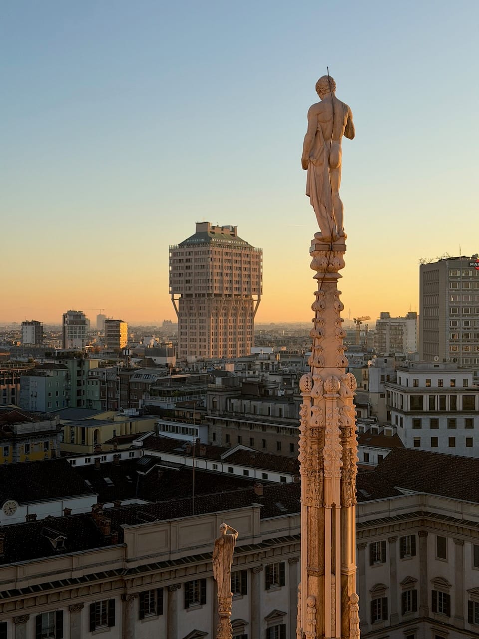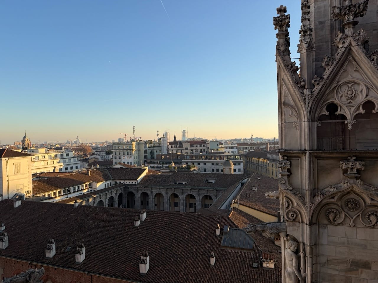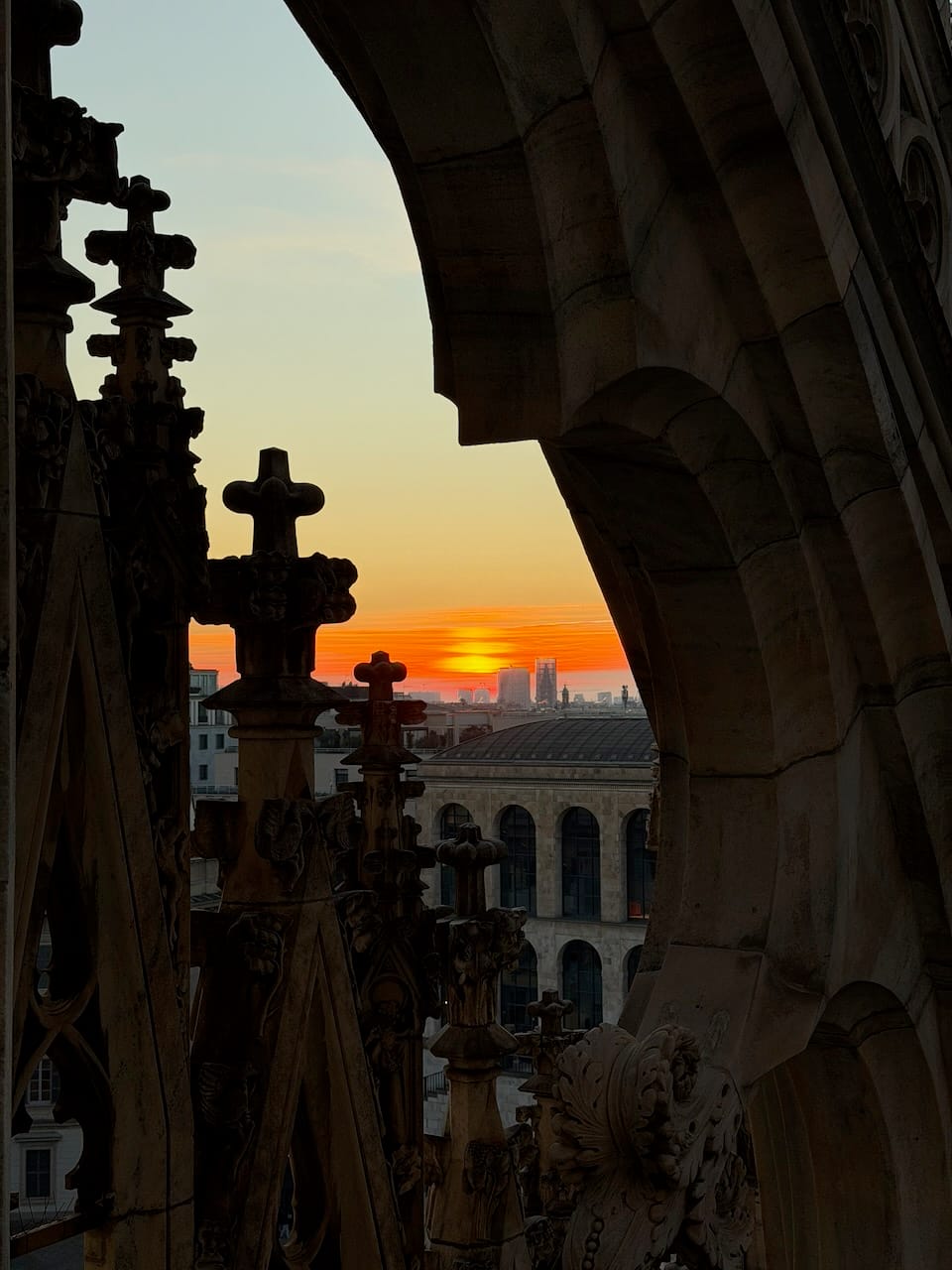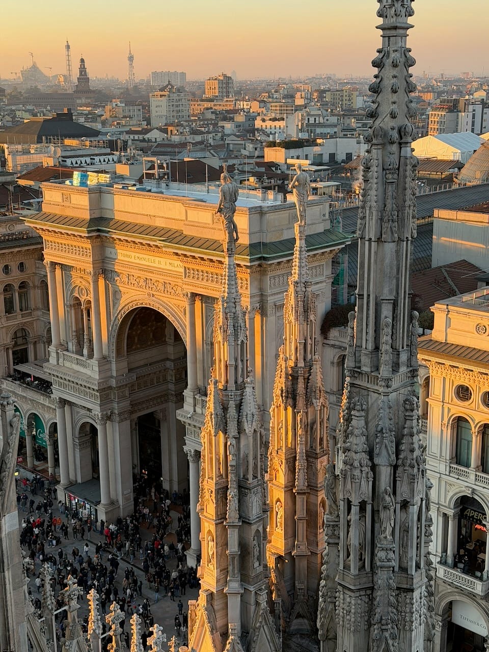 From the top of the Duomo, Milan unfolded beneath us in layers. Closest was the forest of white Gothic spires, sharp and intricate. Beyond that, the softer geometry of the 19th-century city, with the glass dome of the Galleria shimmering in the distance. And farther still, the modern skyline, where contemporary towers—including the Bosco Verticale, the Vertical Forest—rose quietly against the fading light. As the sun sank, the sky turned warm and the marble glowed. It was another one of those moments that didn’t need a schedule to become perfect.