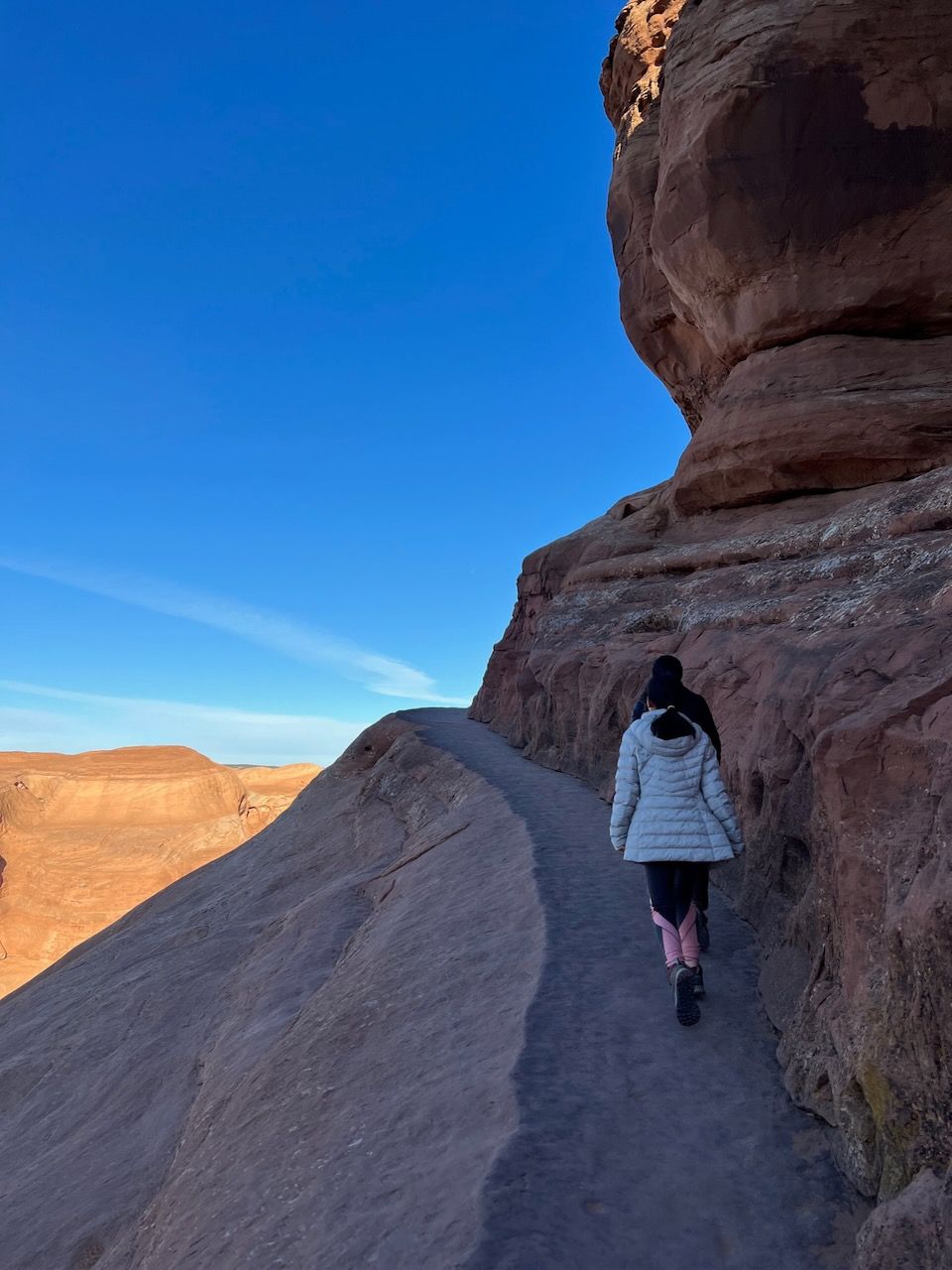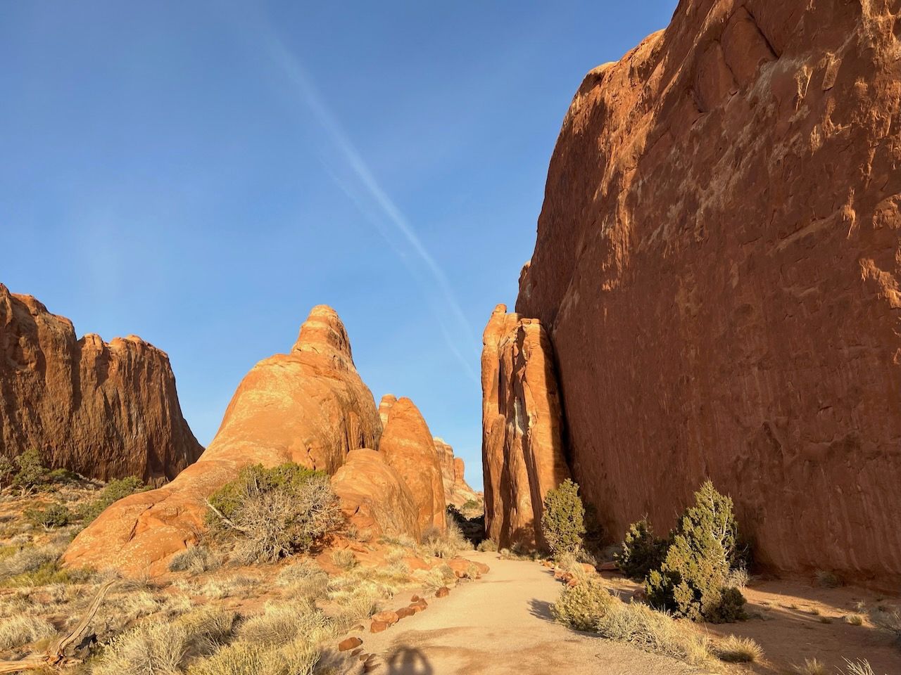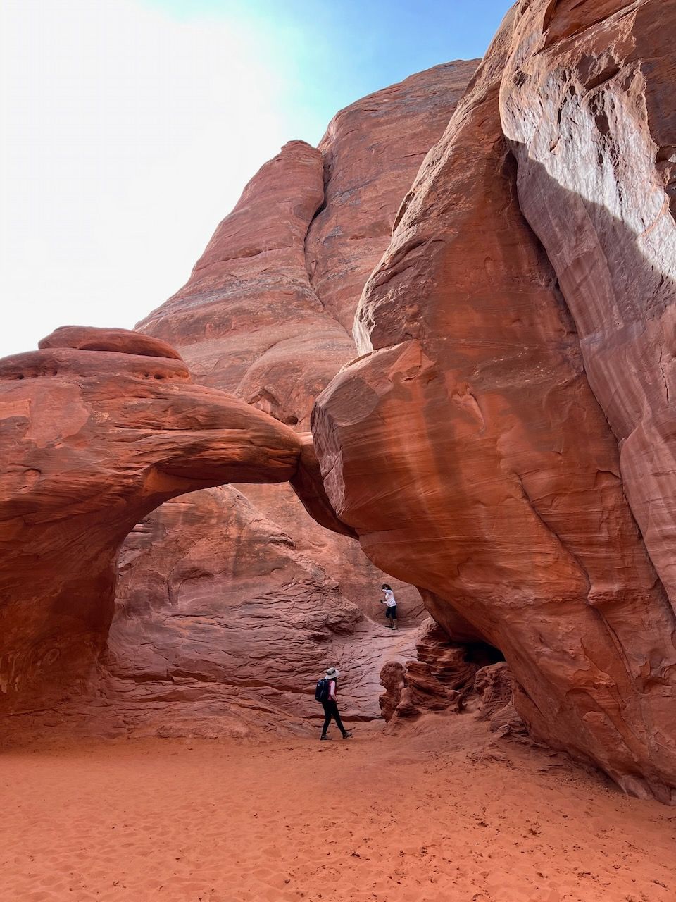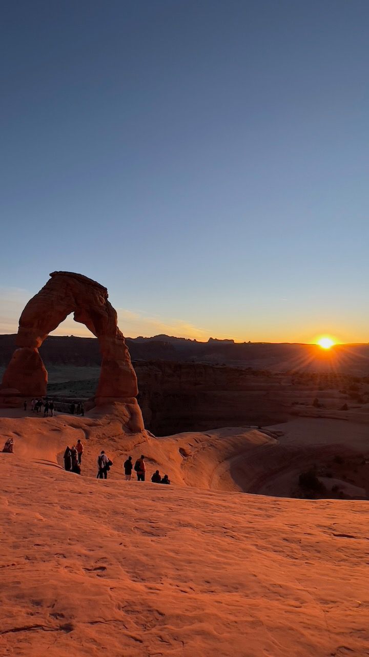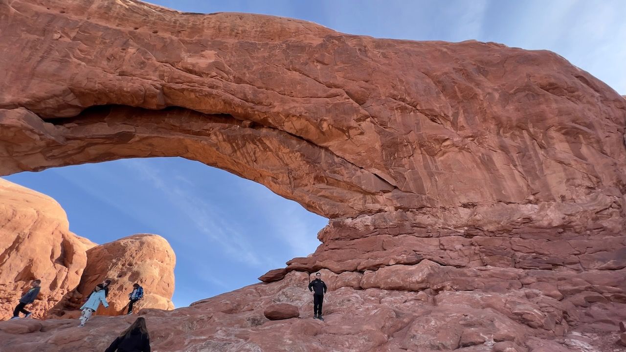 In the afternoon, we prepare for the most popular trail of Arches: the Delicate Arch Trail. Watching the sunset at Delicate Arch should be the most iconic scenery: not only of Arches but also maybe of all the US National Parks. We headed out for it around 3:30 pm for the 5 pm sunset. We expected an hour to get there but made it in 50 minutes. The path was moderately challenging, with steady, rocky uphills. It might be looked dangerous when you see photos of the path - especially steep-looking cliffs. But I never thought it was dangerous. The rock had a good grip, and it was rare to find such a steep slope. But your water bottles could be in danger; we could see several bottles rolling down the cliff - and a brave man got down to the bottom and collected them.