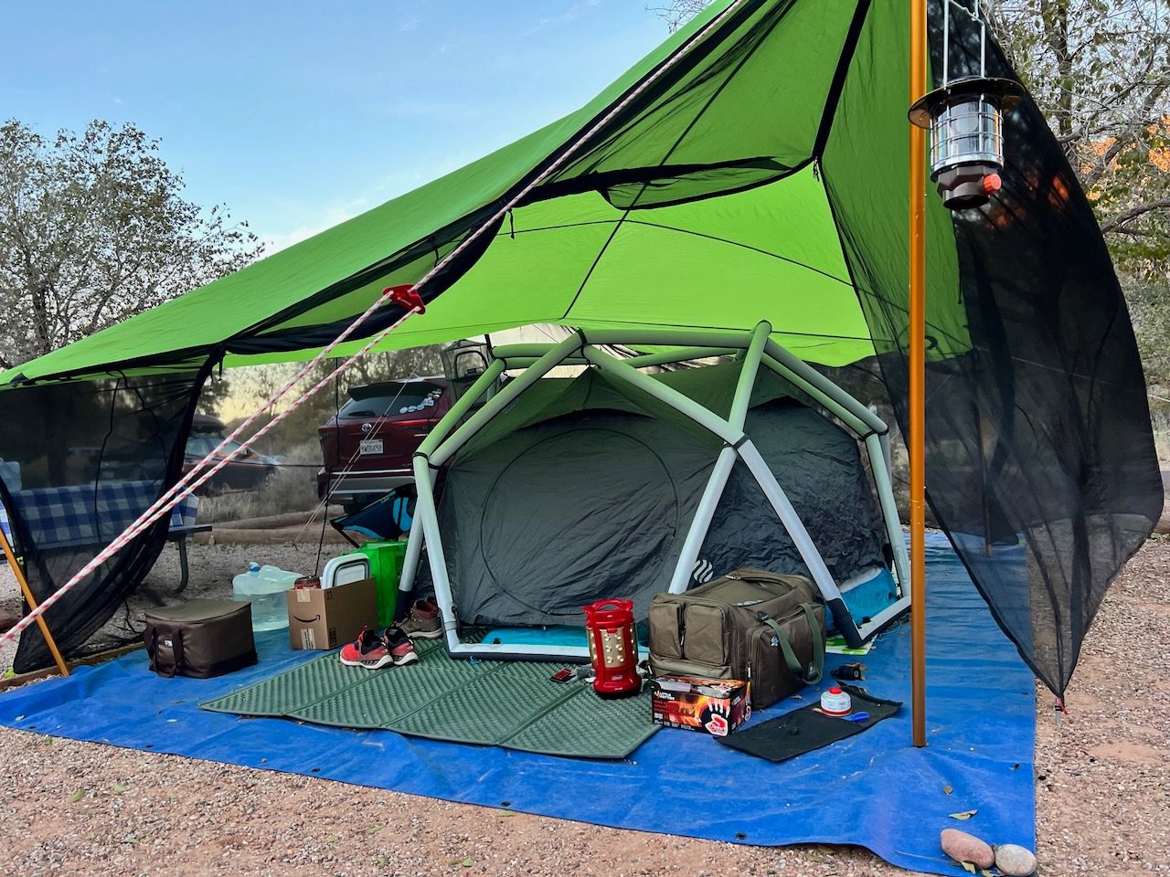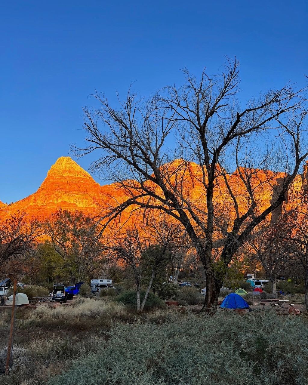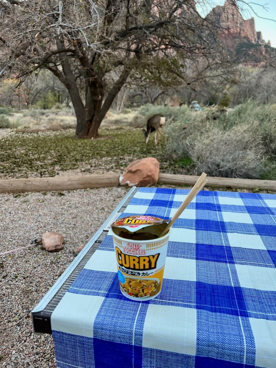 We were lucky to book a tent campsite in Zion Watchman Campground for two nights; the only problem was that my CARROT app was saying that the lowest (in the morning) temperature would be around 25F (-3C). We had several winter camping experiences in Korea, but all Korean campsites had an electricity supply, which was unavailable this time. Although we had a proper sleep system (with Montbell's Down Hugger 800 #0 that has a 14F comfort zone), we had some apprehensions about the freezing overnight camping. So, we prepared lots of hand-warmers and furry blankets to prevent the cold from the ground. In conclusion, it was very effective - we had no issues with sleeping. But the hurdle came from another way; having breakfast in the windy and chilly (feeling like 21F) morning was genuinely challenging. Still, it was a pleasant memory in hindsight.