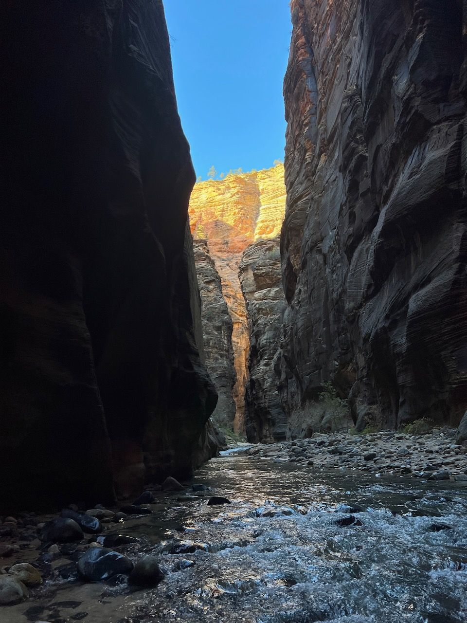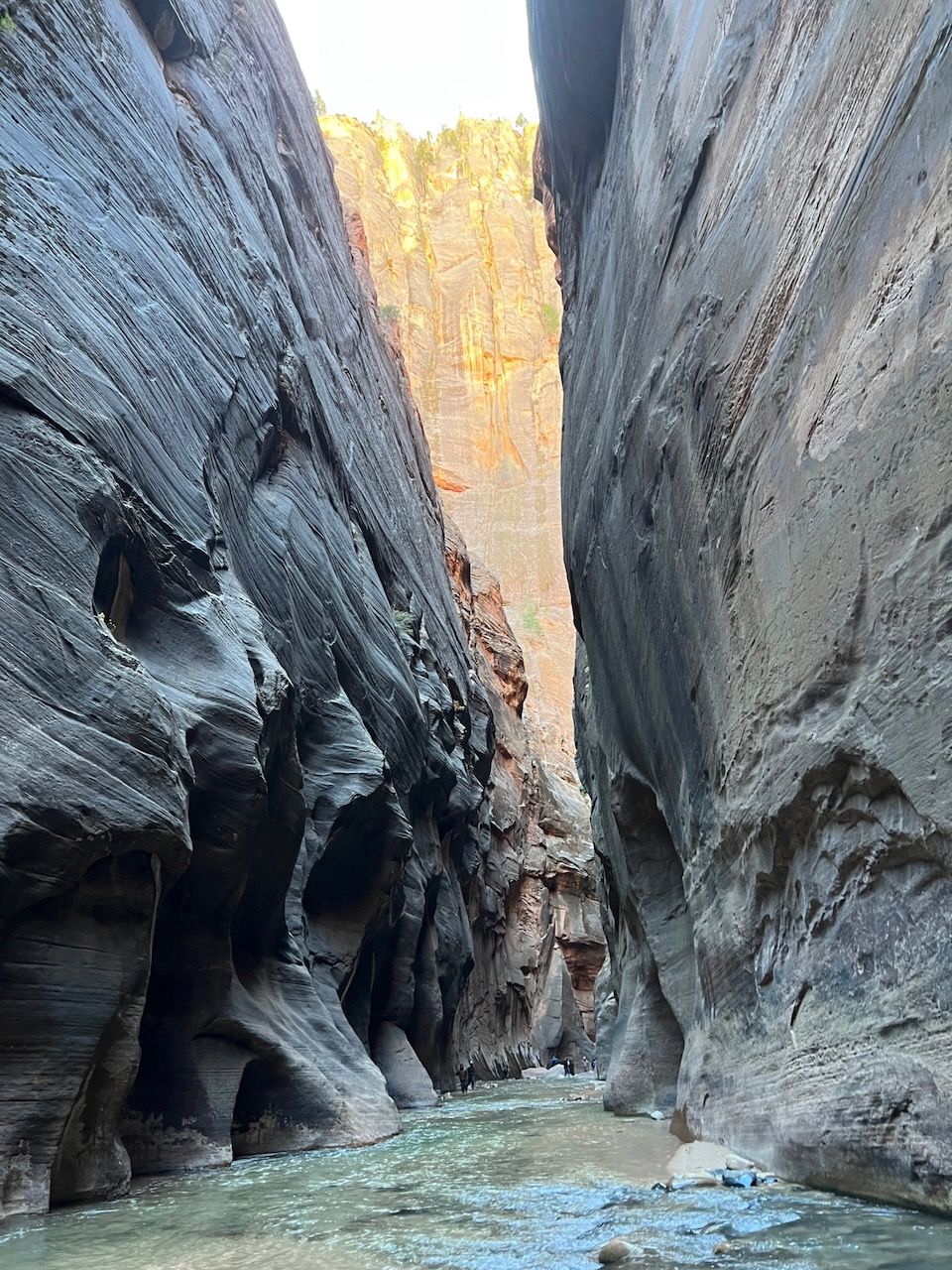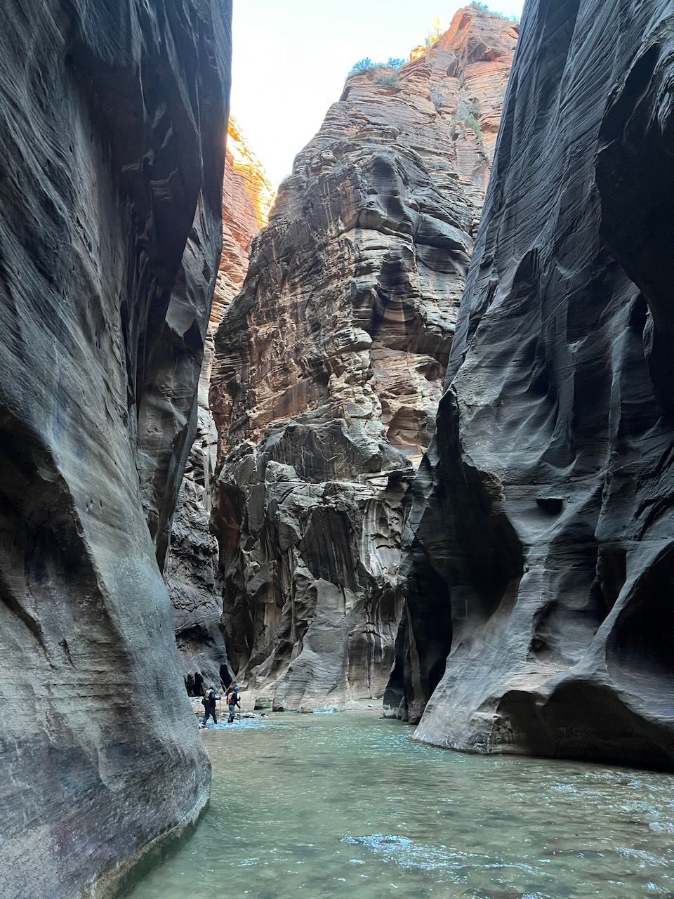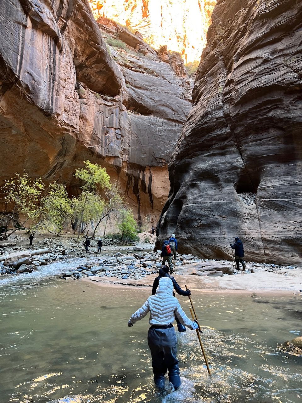 The highlight of the Zion was the Narrows. Walking in the (freezing) water should be the most iconic (we skipped another iconic spot - and infamous for America's most dangerous trail - Angels Landing this time) experience in Zion, but it demanded the right equipment. We rented Dry Pants Packages from Zion Outfitter (also located next to the Park entrance) the evening before our trail. We woke up at 6 am and had breakfast with Curry Noodles - just as we learned from Laid-Back Camp. And we left for the Temple of Sinawava, the last shuttle bus stop. We took the bus around 8:20 am, and it took about 40 minutes. We started the Zion Narrows Riverside Walk trail. The 20-minute walk brought us to the starting point of the Narrows Trail (Bottom-Up). The water was cold but manageable mainly (I think) thanks to neoprene socks. I was surprised that the water came into my feet after a few walks in the water. Still, I realized that it was the water that came through my hydro boots, and it seemed that it didn't pass through the socks because the water was way colder than I felt at my feet; I was surprised again that my feet were dry and soft when I got back to the campsite. The trail was terrific; last year, we had looked down the plunging cliffs of the Grand Canyon, but this year we looked all the way up. My eyes were overwhelmed by surreal sceneries, and my body had an extraordinary experience. We walked up to the entrance of Wall Street: 6 miles and 5 hours in and out. I was proud that my daughter managed it without an issue; last May, it was a little challenging for her to climb up to Nevada Falls. The school PE class must have helped her develop her strength - another good thing about getting out of the Pandemic.