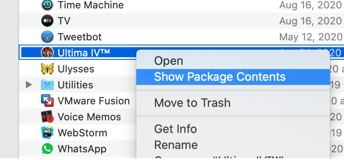 Once you install the gog.com version of Ultima IV, you can see it in your Applications folder. Right-click at the Ultima IV, then select 'Show Package Contents.' Then navigates to Contents -> Resources folder. You can find the game folder and copy the game folder to your preferred location. For me, I copied it under ~/games and renamed it ultima4, so the final location is ~/games/ultima4.